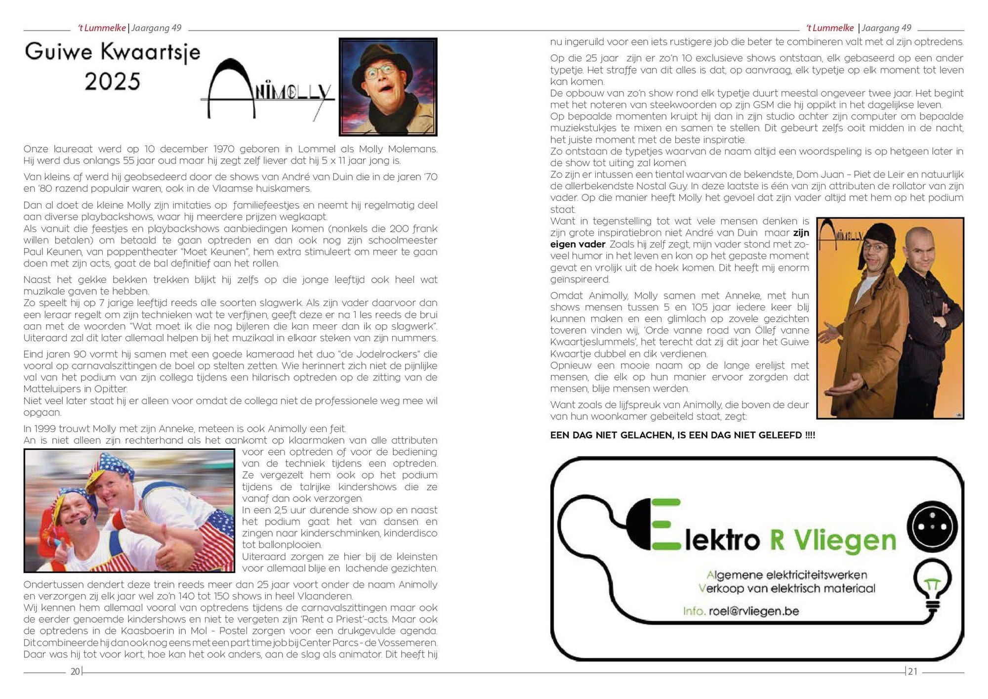 Omdat Animolly, Molly samen met Anneke, met hun shows mensen tussen 5 en 105 jaar iedere keer blij kunnen maken en een glimlach op zovele gezichten toveren, vinden wij, Orde vanne road van Ollef vanne Kwaartjeslummels, het terecht dat zij dit jaar het Guiwe Kwaartje dubbel en dik verdienen.