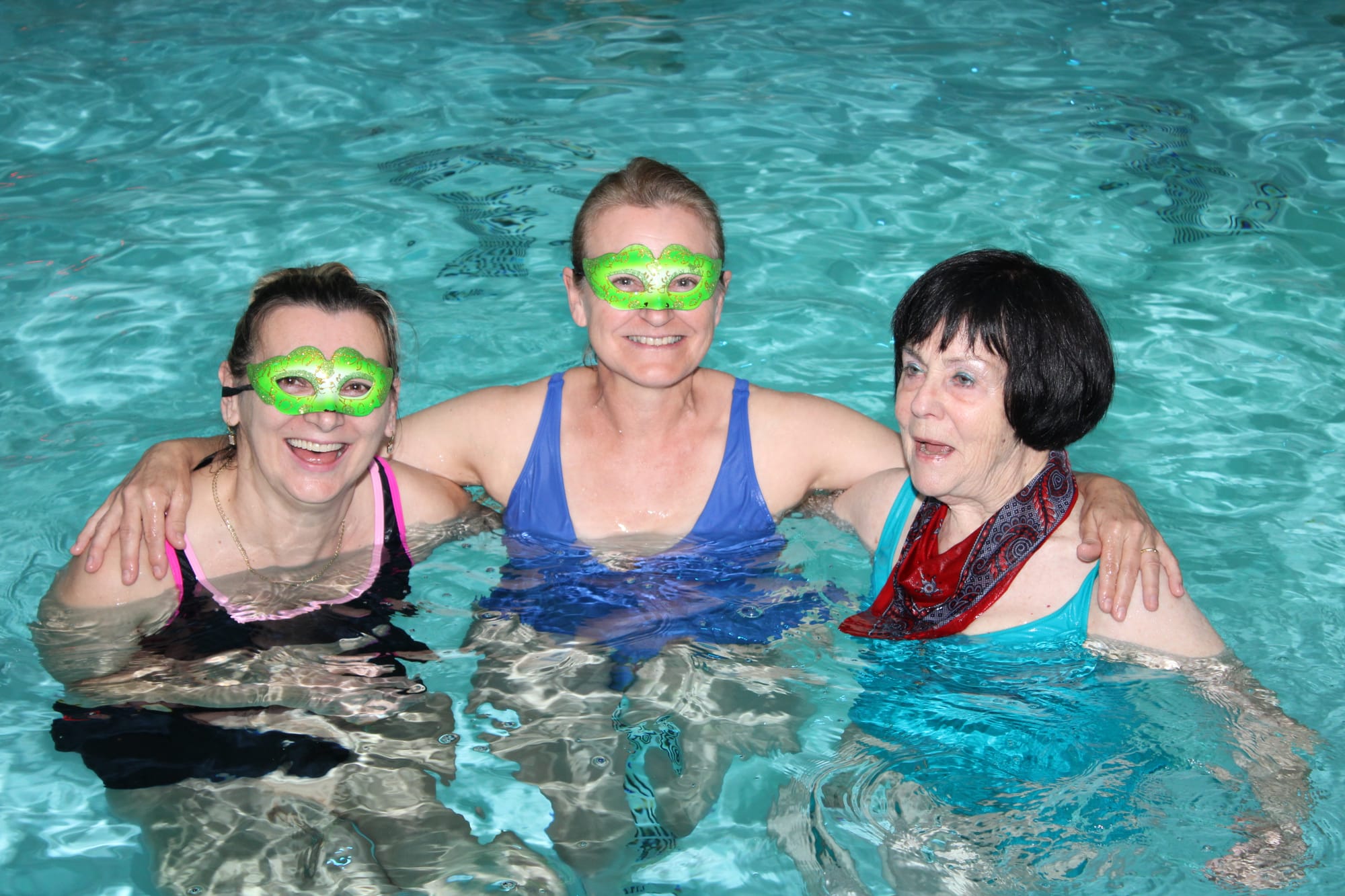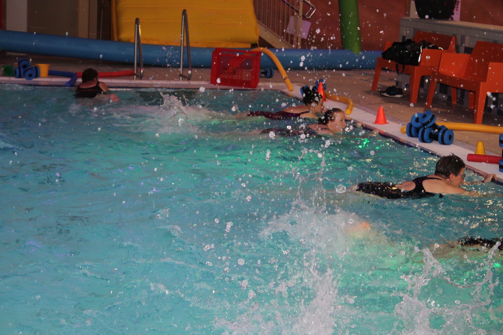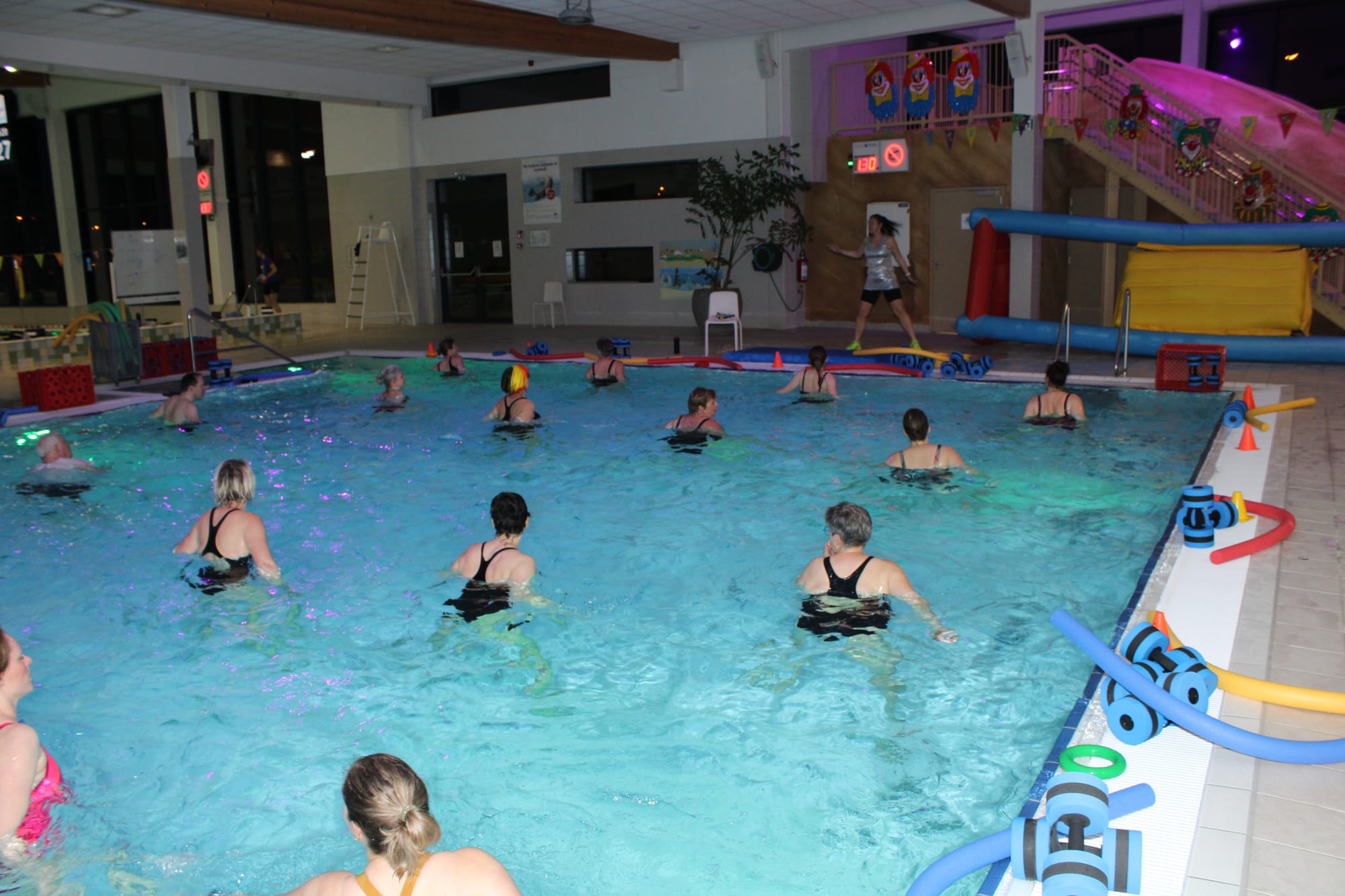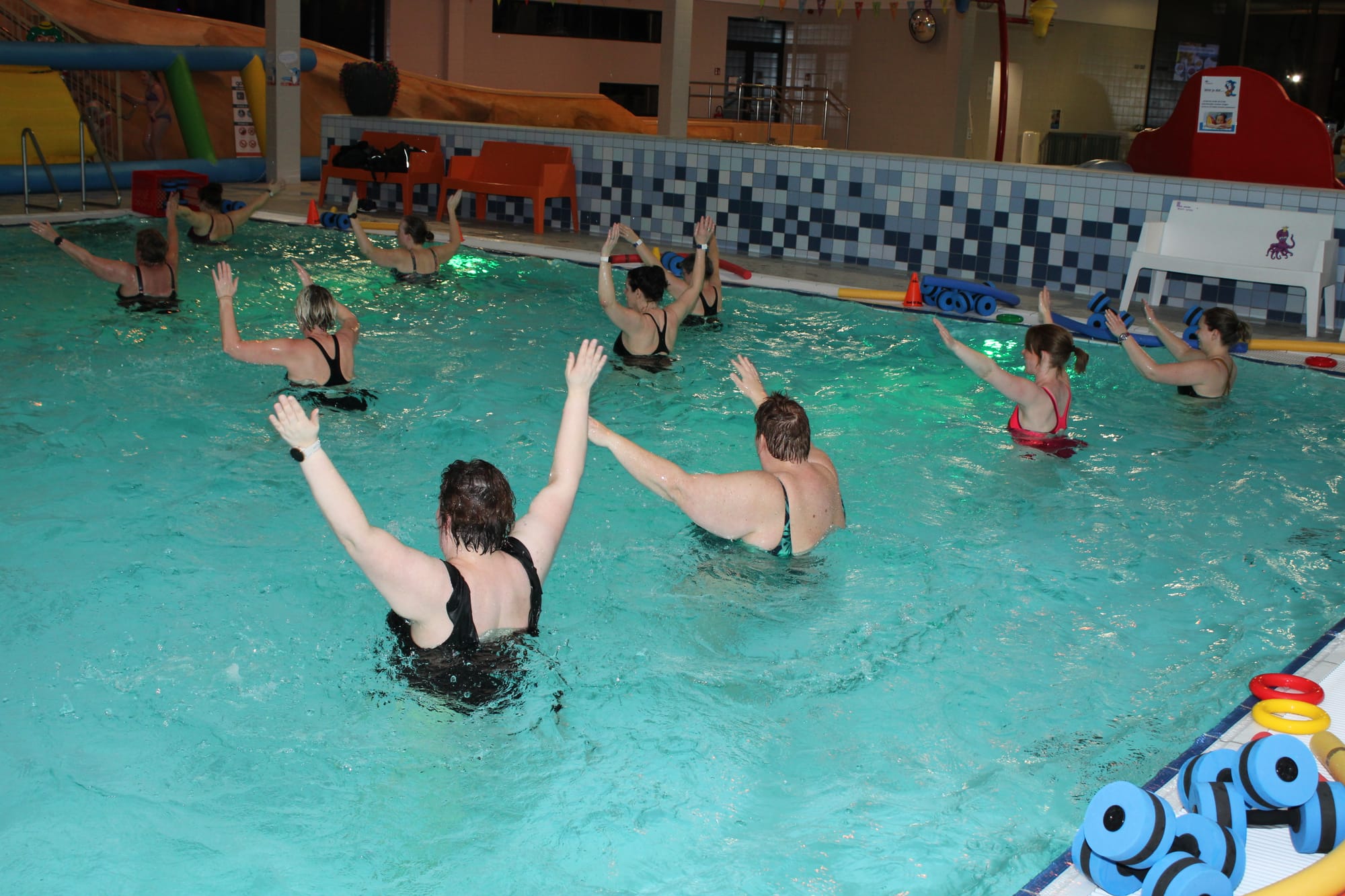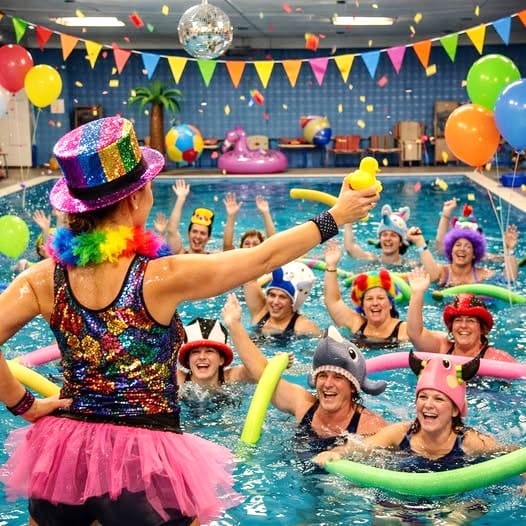 Vanavond - donderdag - veranderde de aqua les bij Optisport in een spetterend carnavalbal! Lesgeefster Katrien maakte er een groot feest van en verwachtte iedereen in zijn of haar mooiste, gekste of kleurrijkste pruik of hoed. "Niks is te gek – hoe uitbundiger, hoe beter! Dus duik je verkleedkoffer in, zet je feesthoed op en kom samen met ons knallen in het water", dat was haar boodschap aan haar leerlingen, en zo werd het een onvergetelijke donderdagavond!