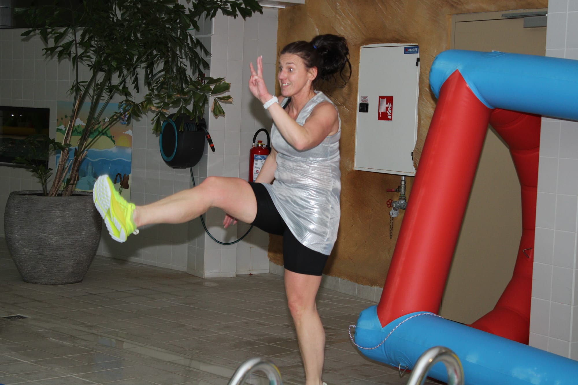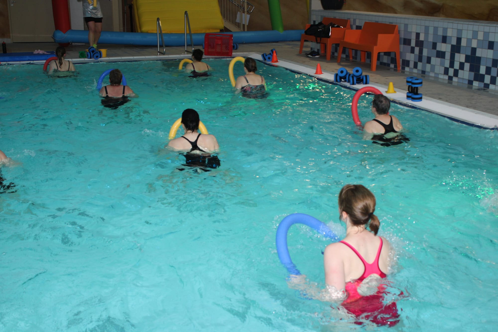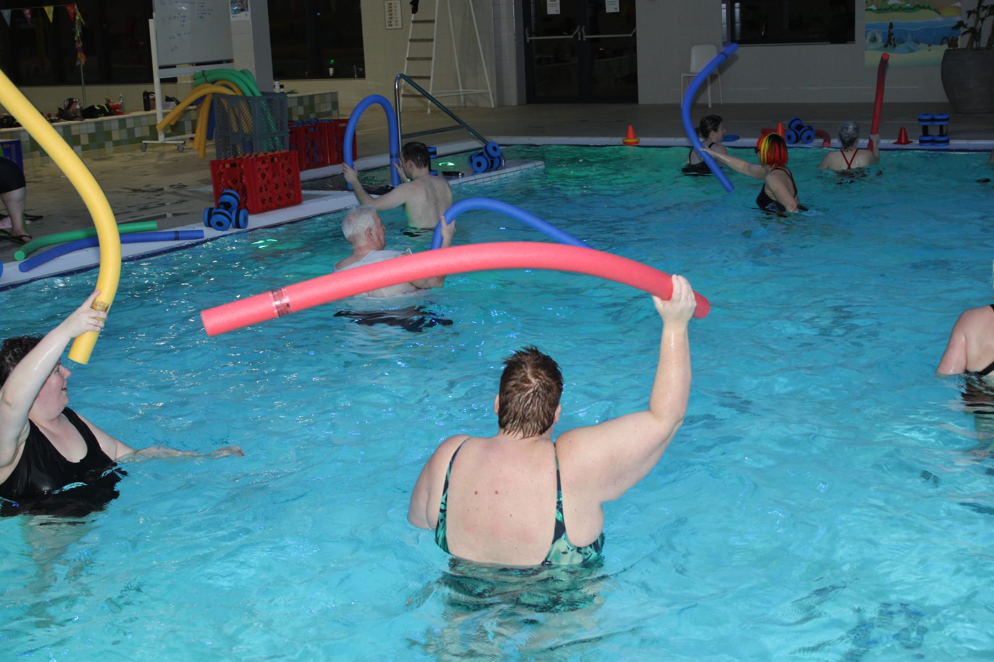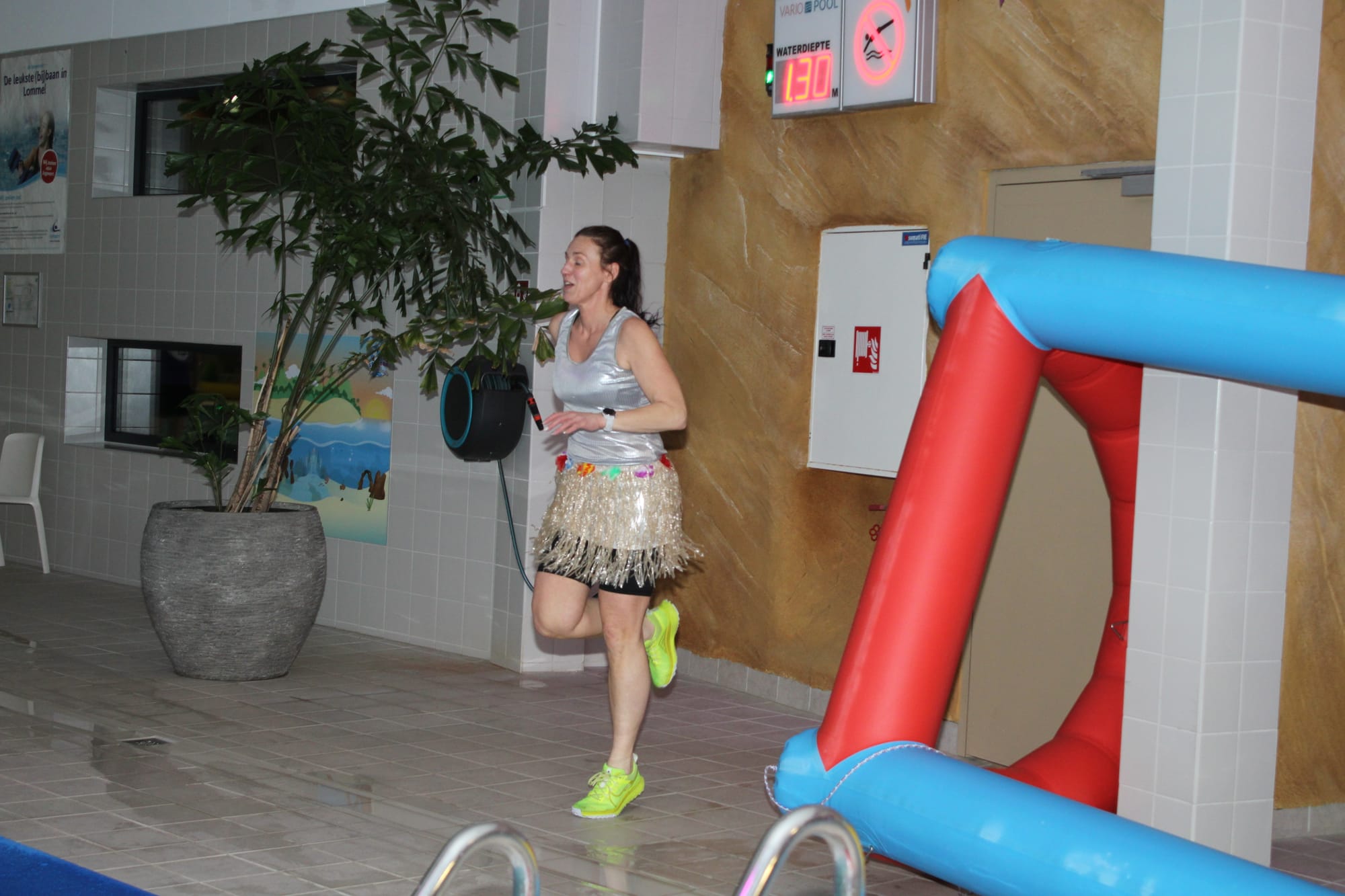 Vanavond - donderdag - veranderde de aqua les bij Optisport in een spetterend carnavalbal! Lesgeefster Katrien maakte er een groot feest van en verwachtte iedereen in zijn of haar mooiste, gekste of kleurrijkste pruik of hoed. "Niks is te gek – hoe uitbundiger, hoe beter! Dus duik je verkleedkoffer in, zet je feesthoed op en kom samen met ons knallen in het water", dat was haar boodschap aan haar leerlingen, en zo werd het een onvergetelijke donderdagavond!