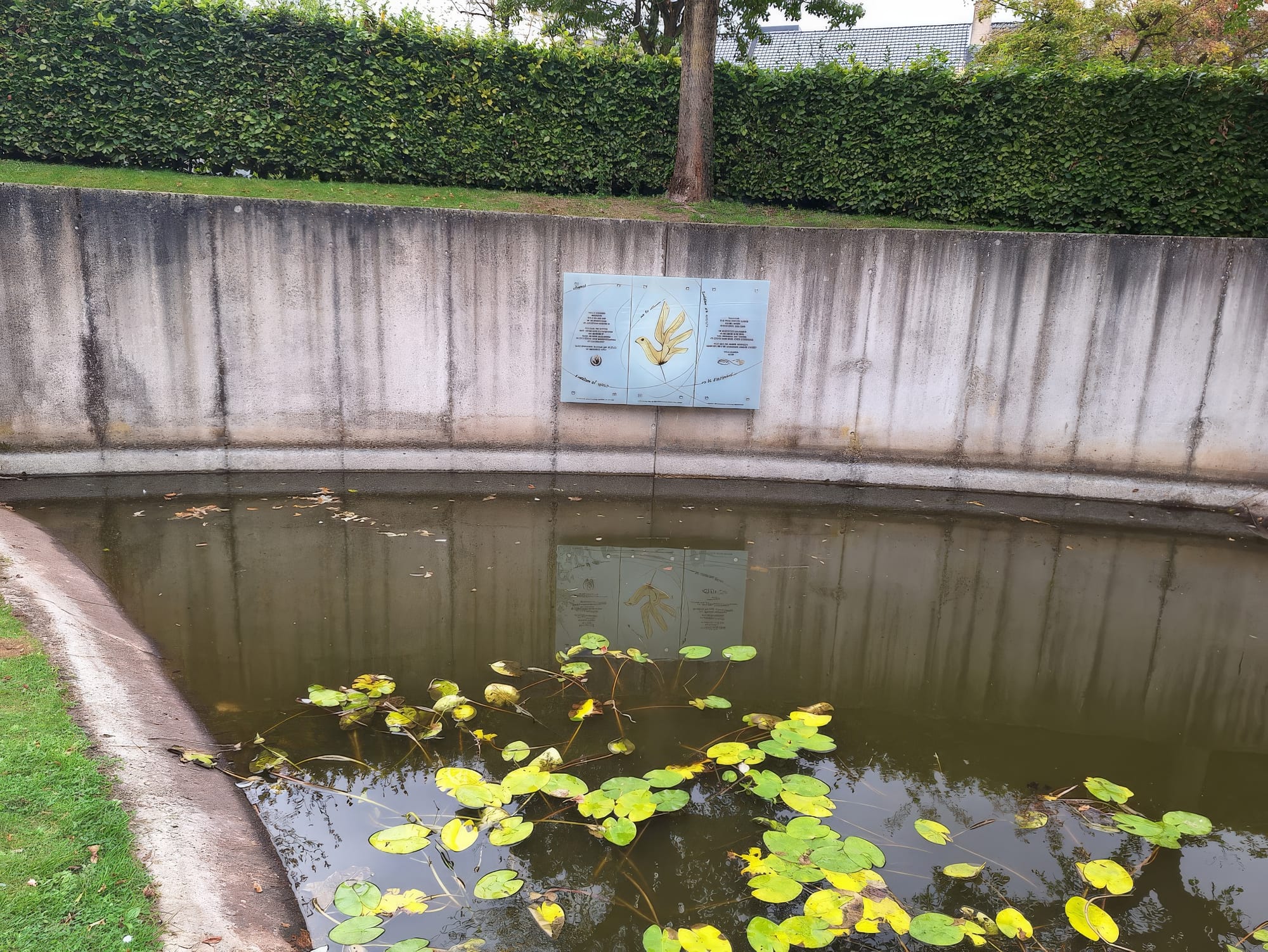 Bij de heraanleg van de parkomgeving en de verbouwingswerken aan CC De Adelberg werd de betonnen muur waarop het bevestigd was volledig verwijderd. De bedoelde glasplaat van beeldend kunstenaar Michel Wellens zou nadien, in overleg met de kunstenaar, teruggeplaatst worden in een kleiner formaat boven de vijver in het gerenoveerde park. Er werd een firma aangesteld om de herstelling en de plaatsing uit te voeren tijdens het schoonmaken van de vijver. Die zou dan volledig leeg zijn, wat de plaatsing zou vergemakkelijken. Alleen, toen iedereen klaarstond op de afgesproken dag, kwam de firma niet opdagen. Die bleek het stadsbestuur maandenlang aan het lijntje te hebben gehouden en het kunstwerk werd nooit hersteld. Meer nog, er volgde al snel een faillissement en de stad kreeg te horen dat het werk zoek was geraakt (!!!). Niemand kon nog vertellen waar het was gebleven. Met de kunstenaar werd nadien bekeken hoe de situatie kon opgelost worden, en zie... het kunstwerk werd vorige week herplaatst aan de vijver en zo in haar volledige glorie hersteld met de andere beelden van deze groep in het Astridpark.