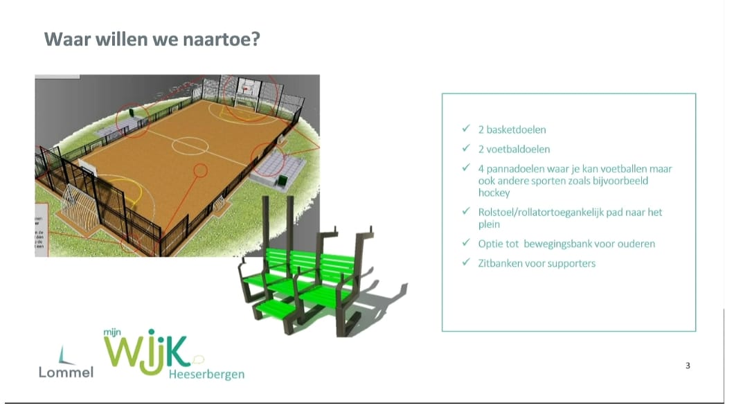 Schepen Katrien Cools (CD&V) stelde de aanleg voor van een multifunctioneel sportveld op Heeserbergen (tekeningen en foto's hieronder) en de gemeenteraad verleende unaniem de goedkeuring hiervoor. Er komen twee basketdoelen, twee voetbaldoelen, vier pannadoelen, zowel geschikt voor voetbal maar ook voor hockey, zitbanken voor supporters en een rolstoel- en rollatorvriendelijk pad naar het terrein toe. "Maar het zal niet alleen dienen als een toegankelijke sportzone , maar ook als laagdrempelige plek waar jongeren hun energie kwijt kunnen, buurtbewoners kunnen samenkomen en verschillende generaties elkaar kunnen ontmoeten", aldus schepen Cools.