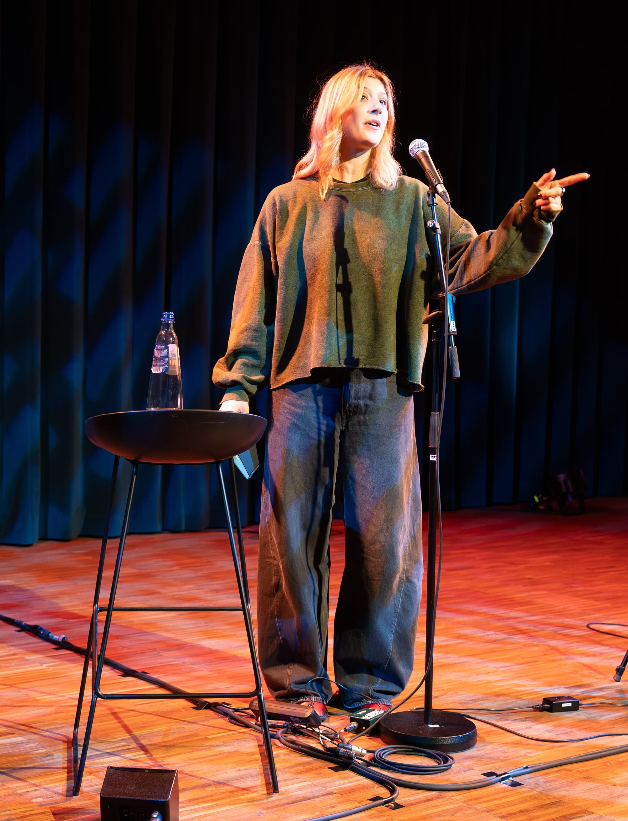 Bregje Iding is een grensgeval. Letterlijk, want ze groeide op in het Limburgse Lommel met een Vlaamse moeder en een Nederlandse vader. Figuurlijk, omdat ze met haar humor graag balanceert tussen fictie en realiteit. Ze nam je gisterenavond mee in een heel geloofwaardig verhaal, om dan vervolgens een béétje over de grens van het toelaatbare te gaan. Zo zette ze een fascinerend personage neer, op een manier die doet denken aan een klasbak als Dries Heyneman. Met haar humor onderzoekt Bregje het liefst de absurditeit van armoede, rijkdom