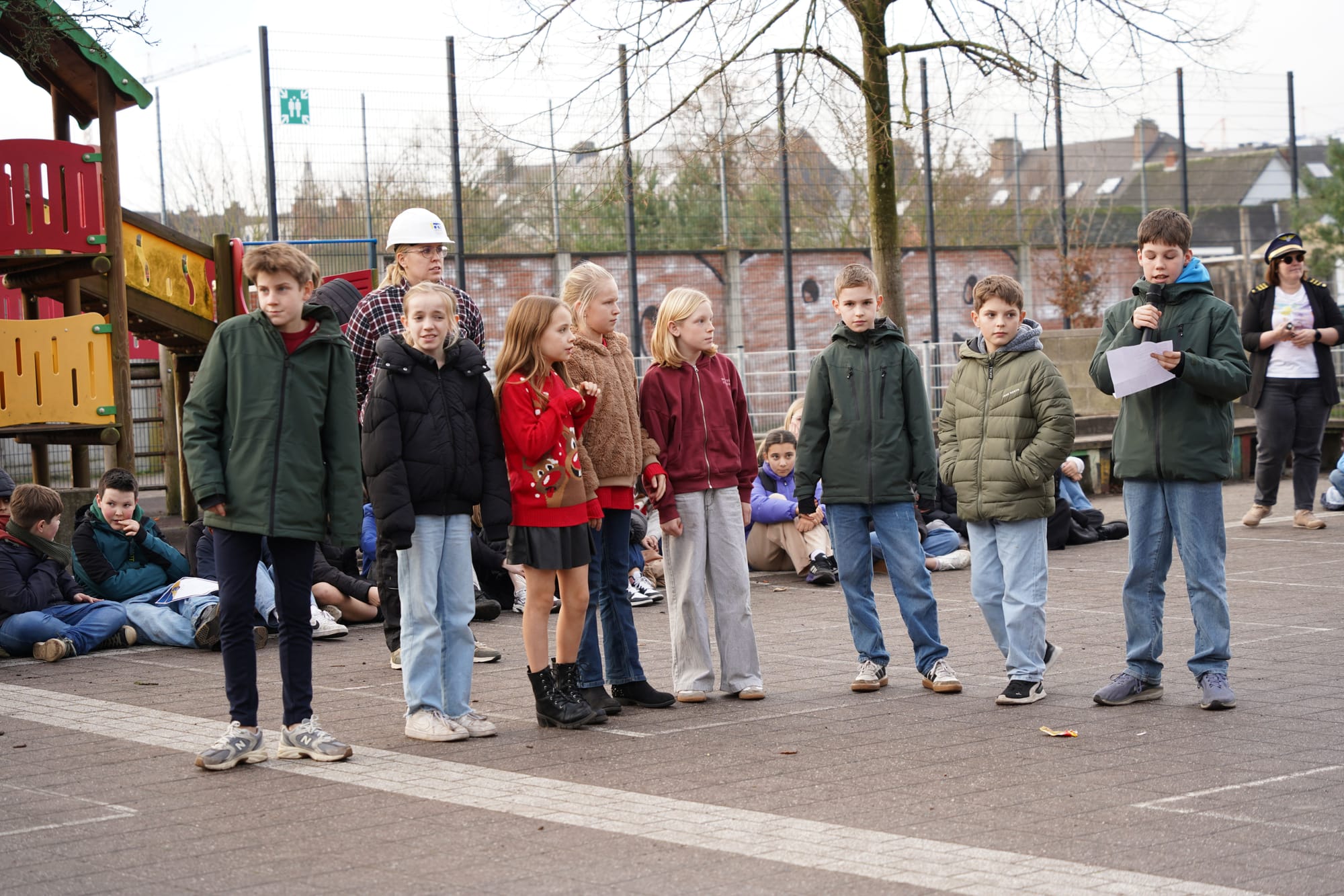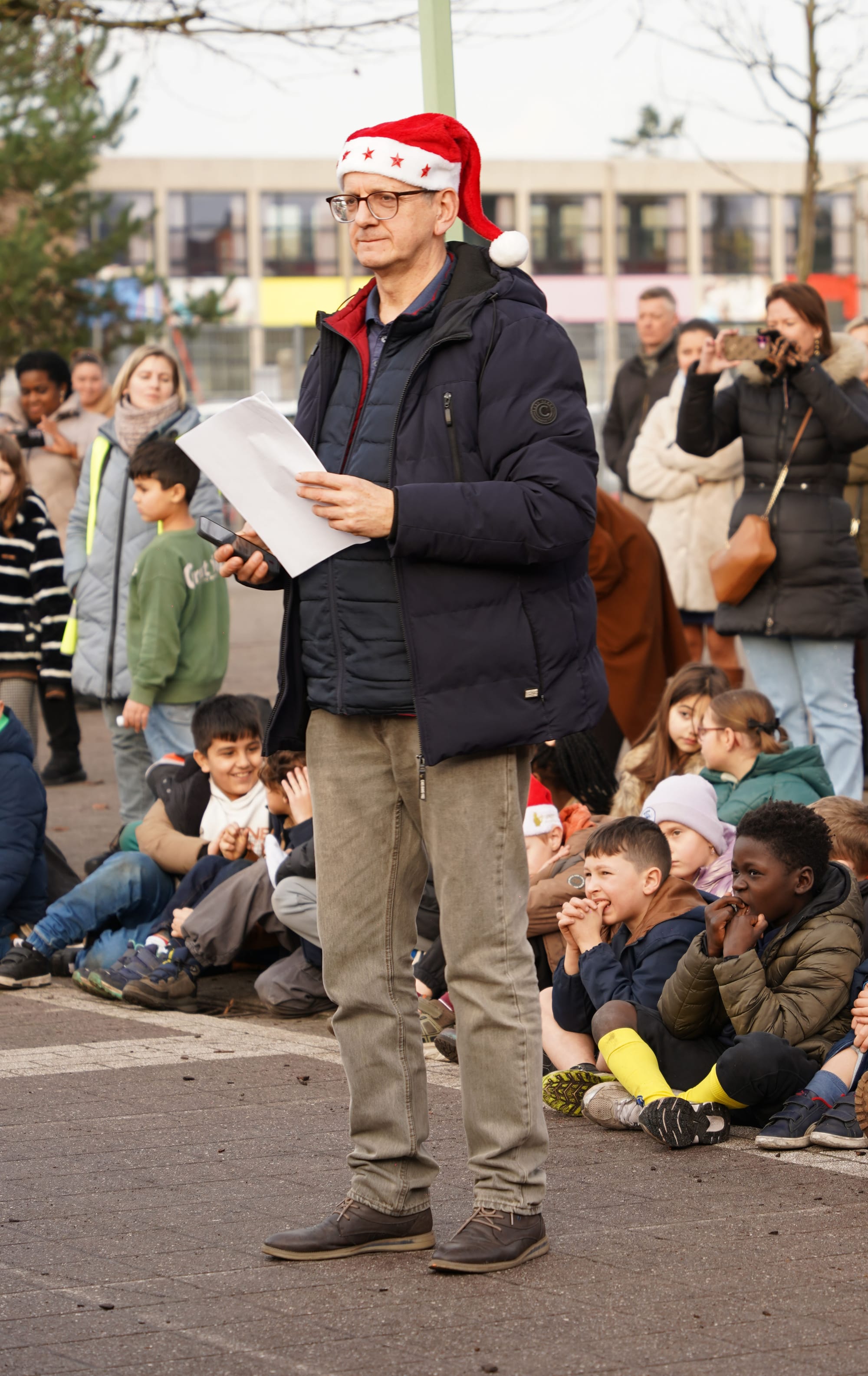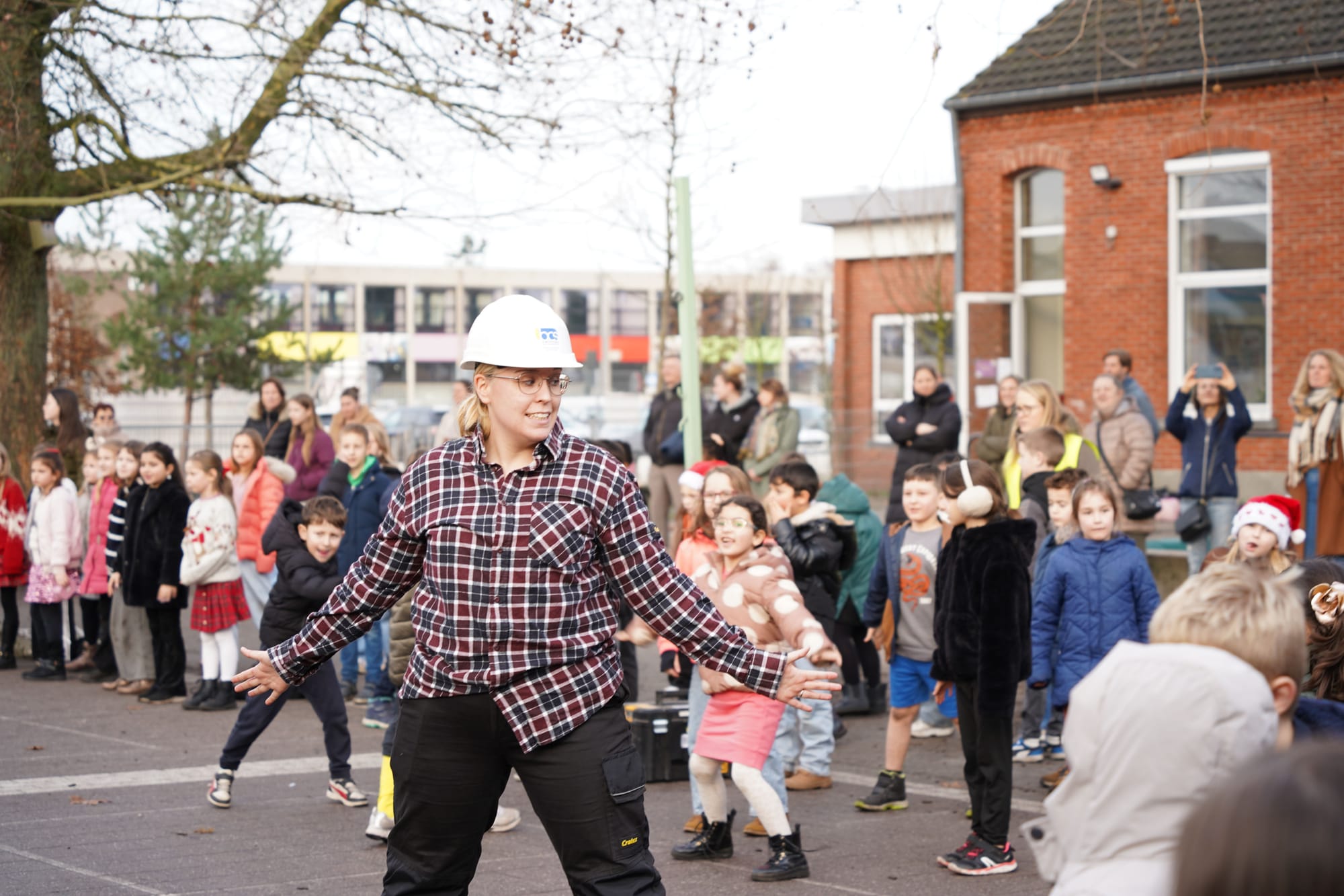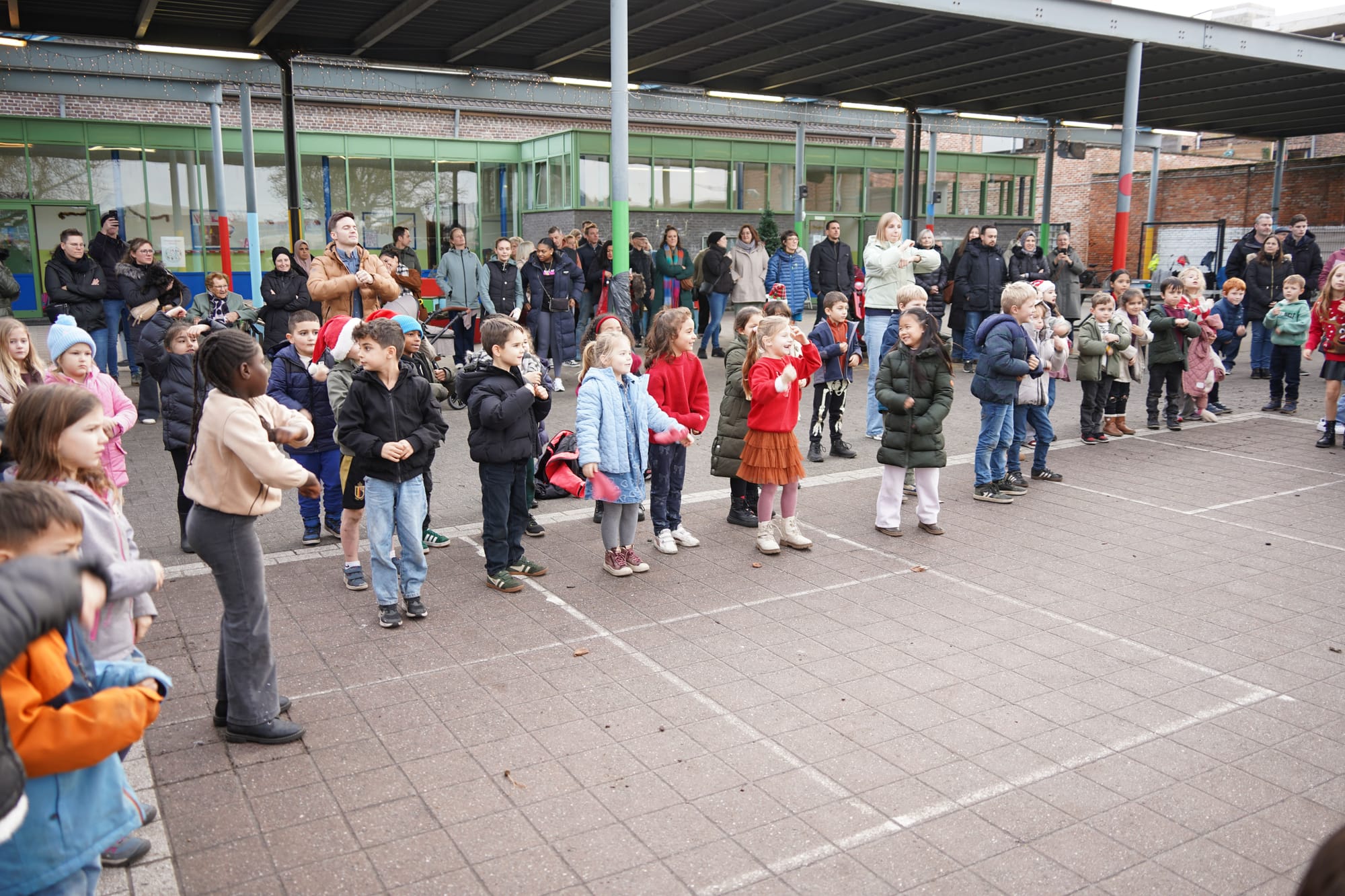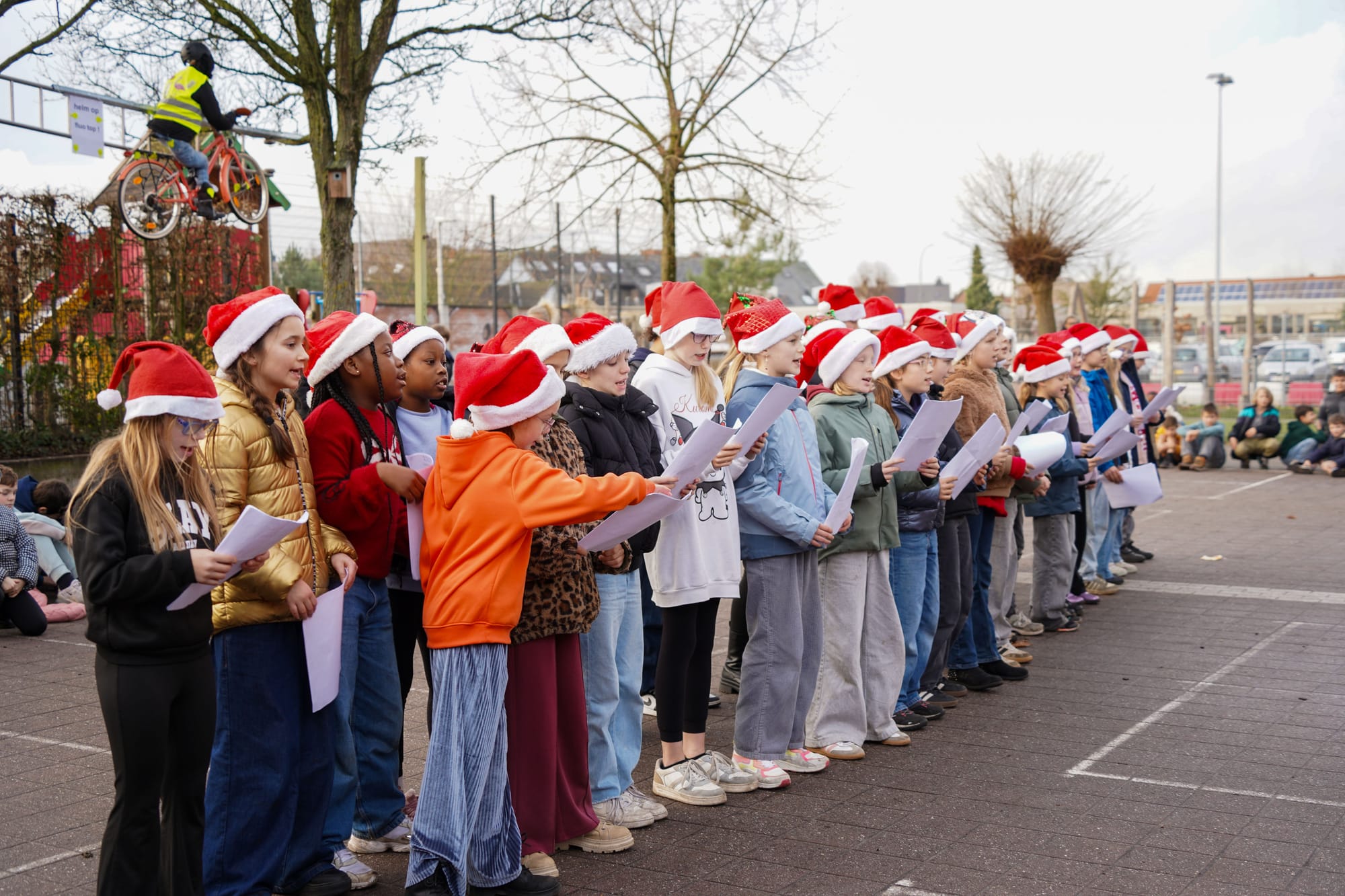 Naast de beeldende kunsten was er ook ruimte voor muziek. Het kinderkoor, onder de deskundige leiding van meester Luc, zorgde voor een sfeervol intermezzo. Met een repertoire van bekende en nieuwe kerstliedjes brachten zij de hele school alvast in de kerststemming.