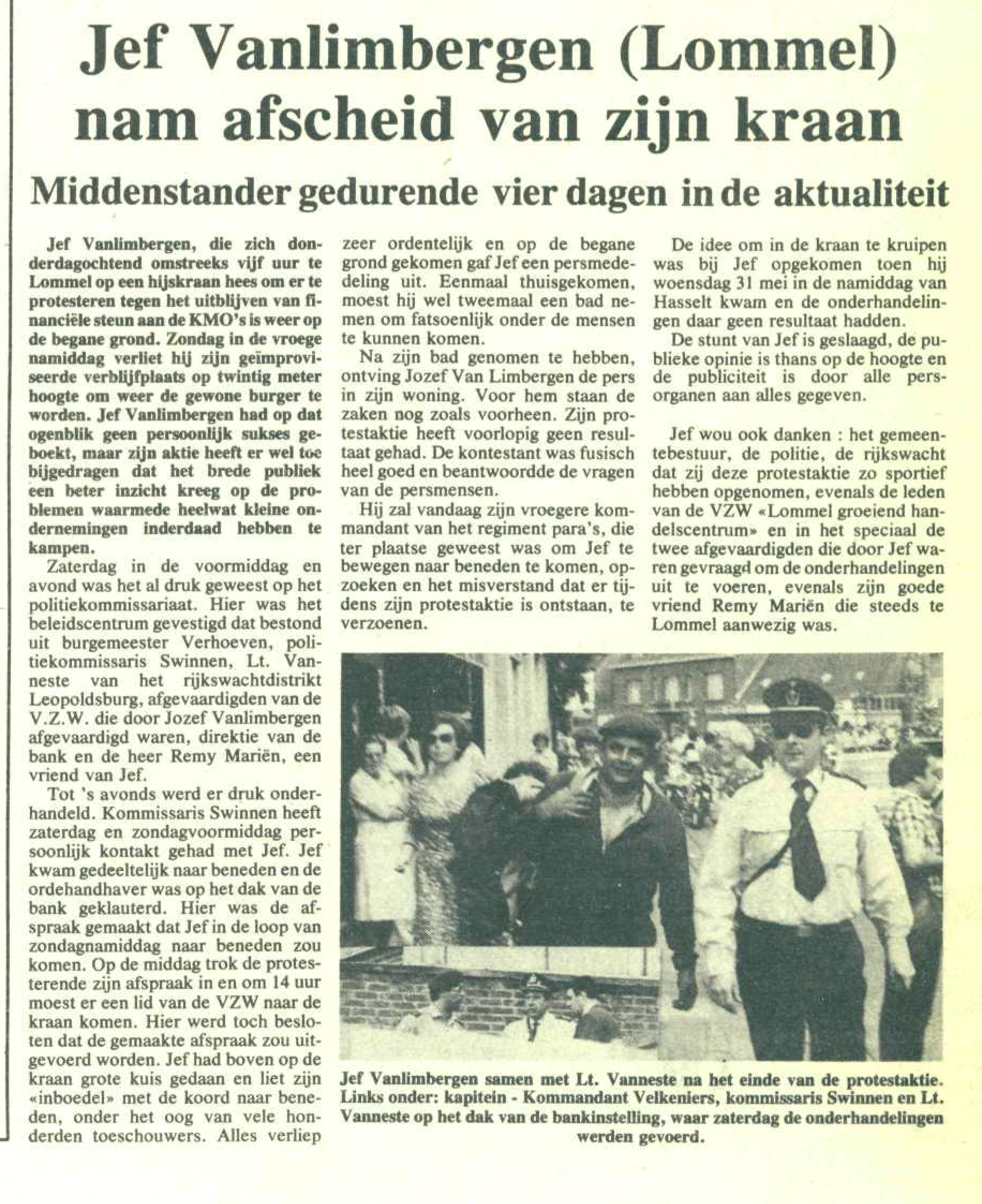 Iedereen in onze stad, tenminste vanaf een bepaalde leeftijd, herinnert zich absoluut de capriolen van Jef Van Limbergen, oftewel Jef van Seppen, of ook nog Jef Kraan. En het is net om die laatste bijnaam dat we vandaag in onze rubriek 'Uit de oude doos' een aantal foto's brengen. Want... in juni 1978 klom Jef in een hoge kraan recht tegenover de Kredietbank in het centrum als protestactie tegen het uitblijven van financiering van KMO's. Hij hield zijn actie maar liefst vier dagen vol, en haalde er de nationale pers mee. Resultaat had de actie niet, maar Jef was 'wereldberoemd' in eigen streek en ver daarbuiten ondertussen.