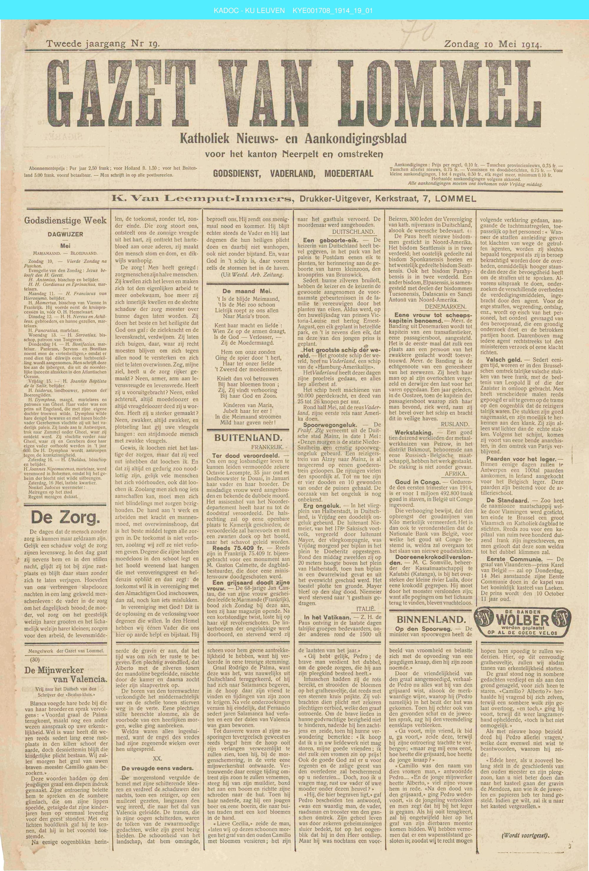 Vandaag brengen we deze wekelijkse krant van 10 mei 1914, en het loont de moeite om hier en daar eens wat te lezen... Niet alleen het taalgebruik is bijzonder, ook de onderwerpen. En zo kan je in deze uitgave bv. lezen dat de winnaar van de kermiskoers op Lutlommel 50 Belgische frank zou verdienen (1,25 euro...), en dat er tijdens de kermis in datzelfde Lutlommel volksspelen waren met o.a. 'plank rijden', 'topken steken', 'mastklimmen', 'mastellen happen', en veel meer...
