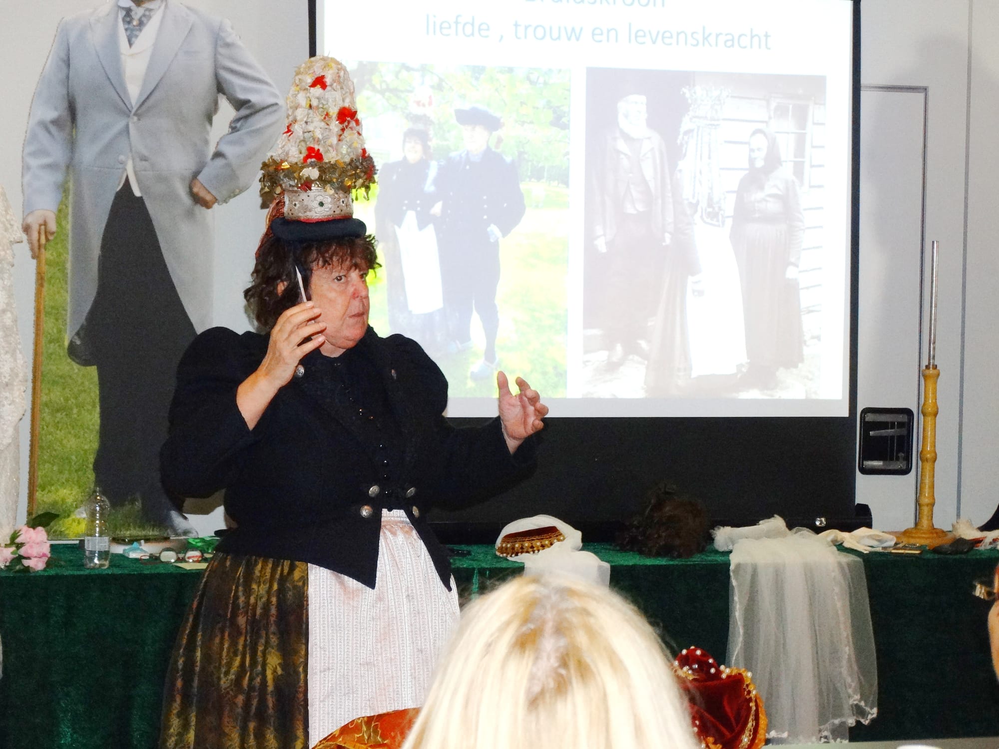 Aan de hand van dia’s en kostuums bracht ze kleurrijk in beeld welke kleding er bij een huwelijk werd gedragen en welke geschenken gebruikelijk waren. Een apart hoofdstuk wijdde ze aan de charivari, wat wij vandaag kennen als de blikjes die achter de wagen van het jonge echtpaar bengelen. Ook werd de rol en kwaliteit van de fotograaf besproken.