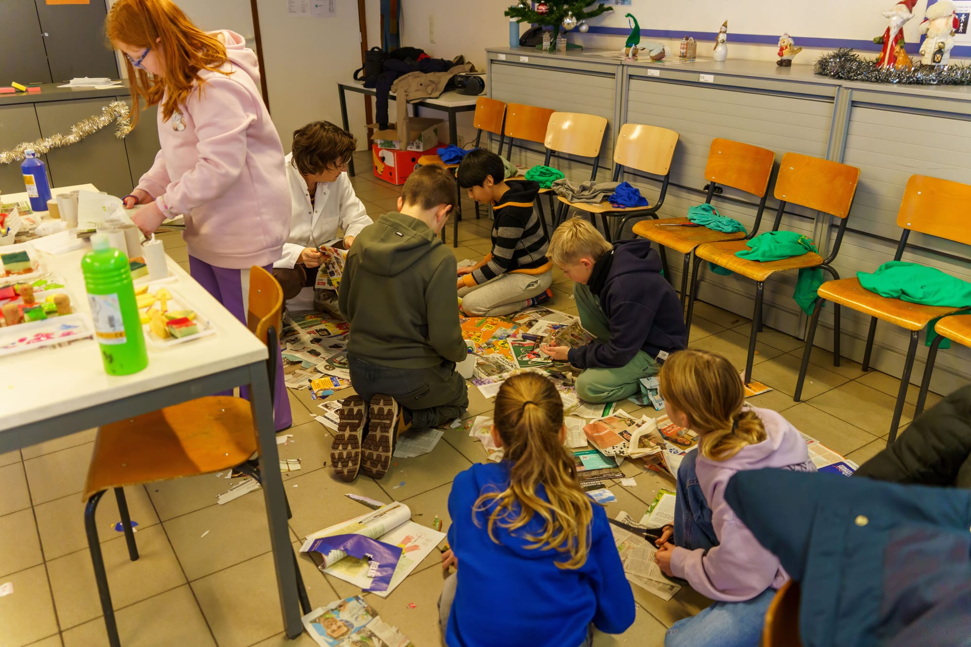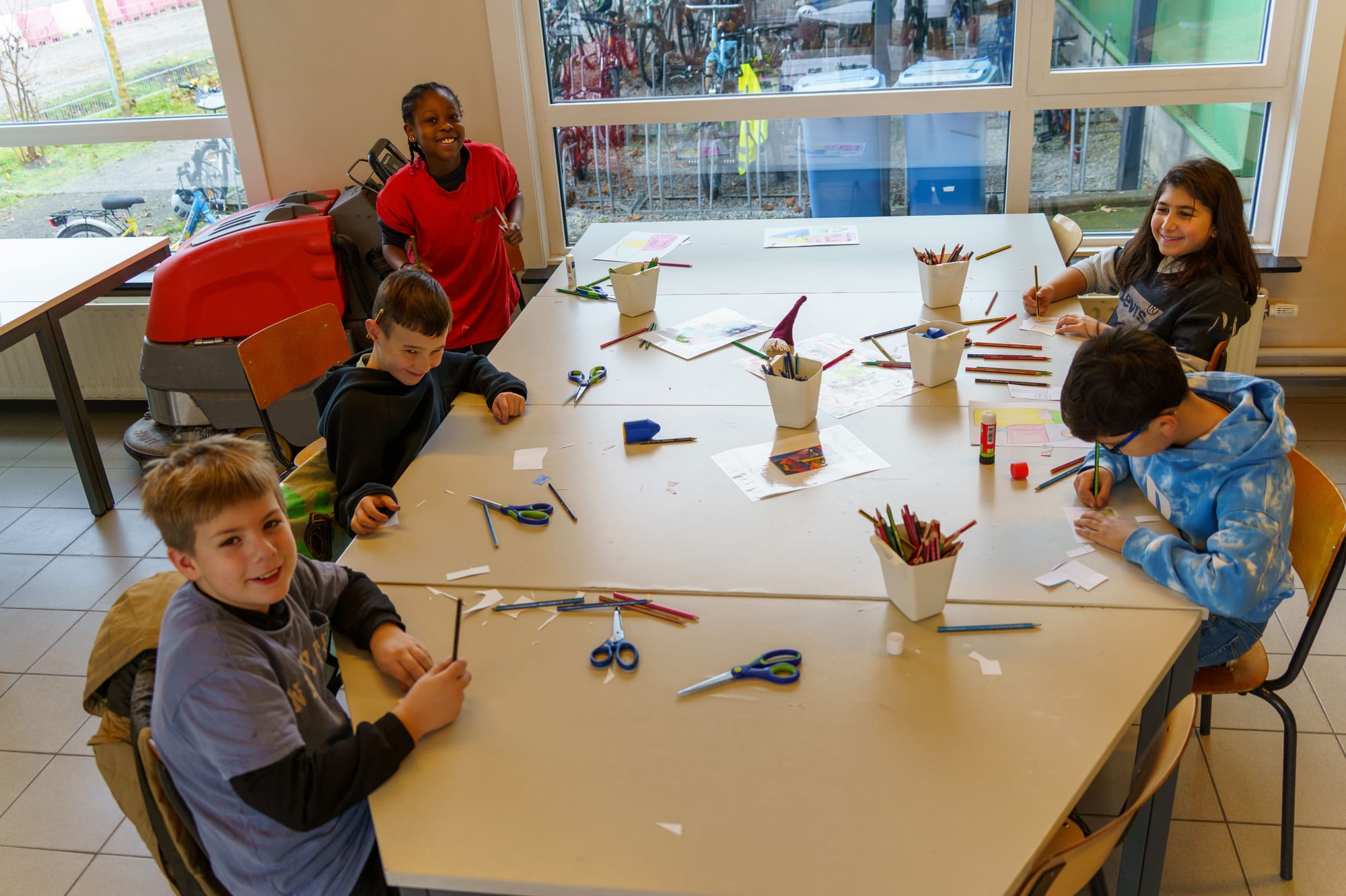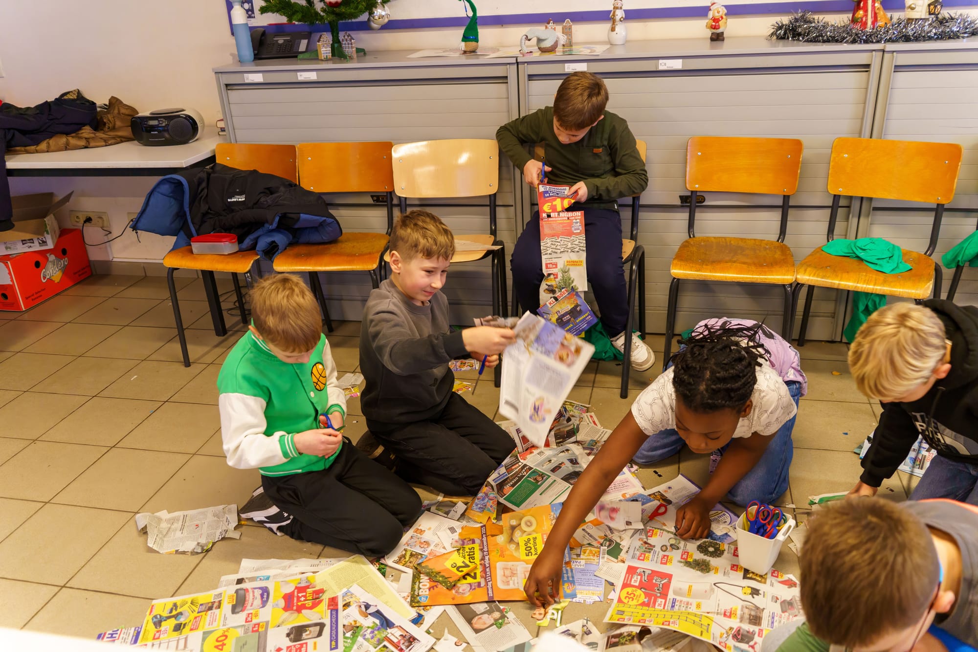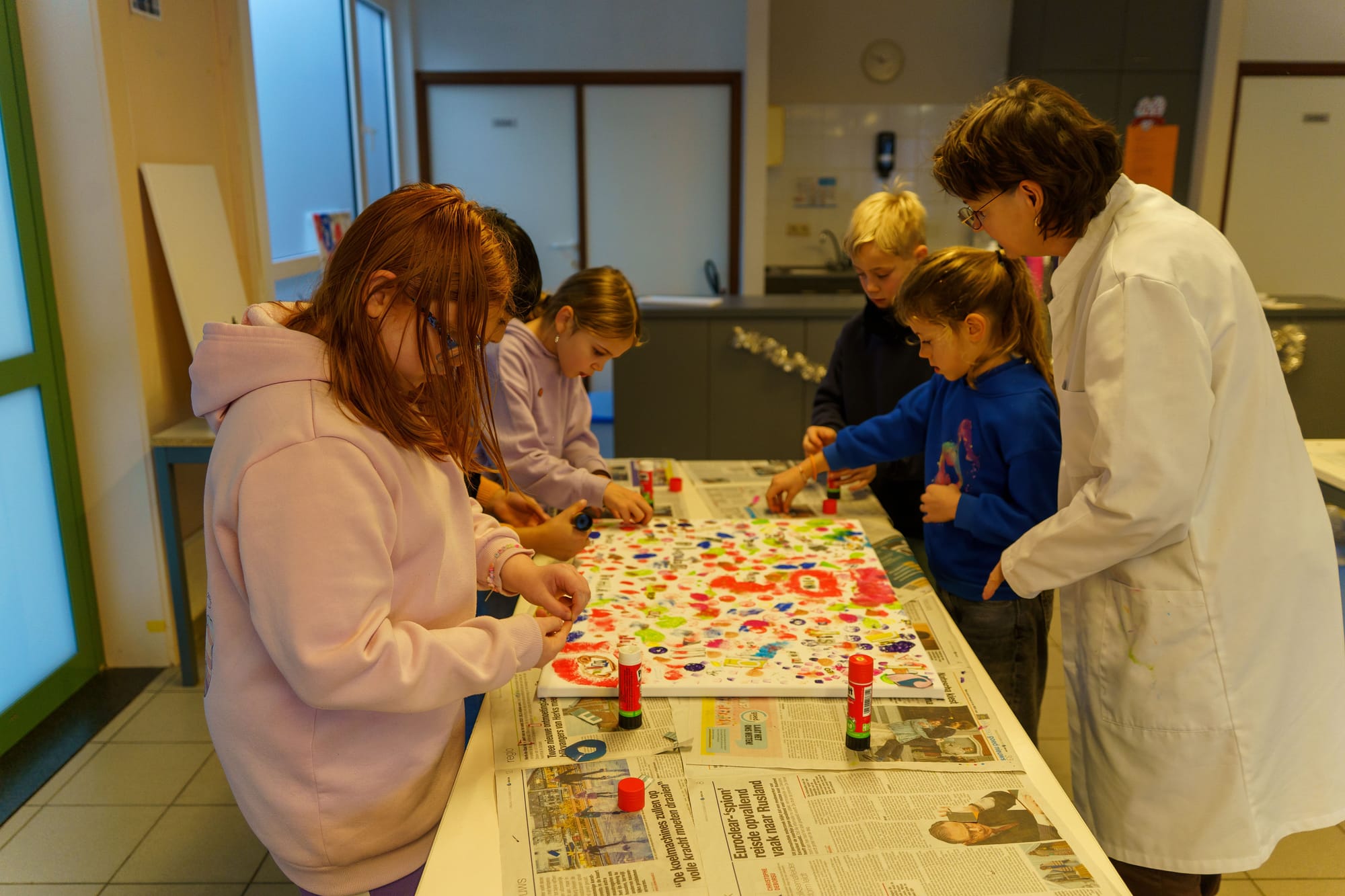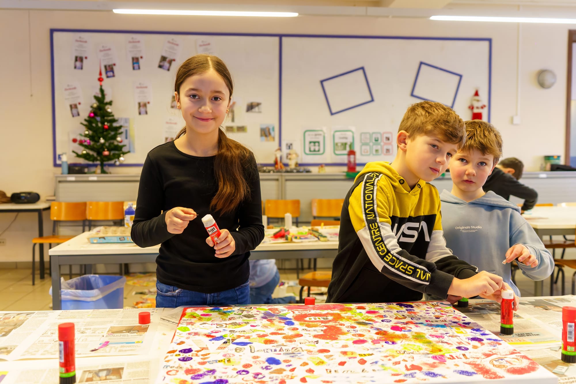 Fantastisch en Vindingrijk Vliegen: Met Juf Ann creëerden de leerlingen een groot kunstwerk waarin hun eigen namen verwerkt waren. Puur teamwork en creativiteit!