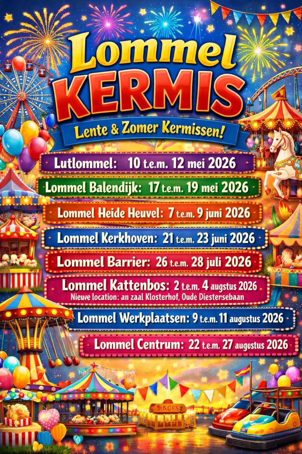 - Lommel Kattenbos: 2 t.e.m. 4 augustus 2026 (nieuwe locatie: aan zaal Klosterhof, Oude Diestersebaan)