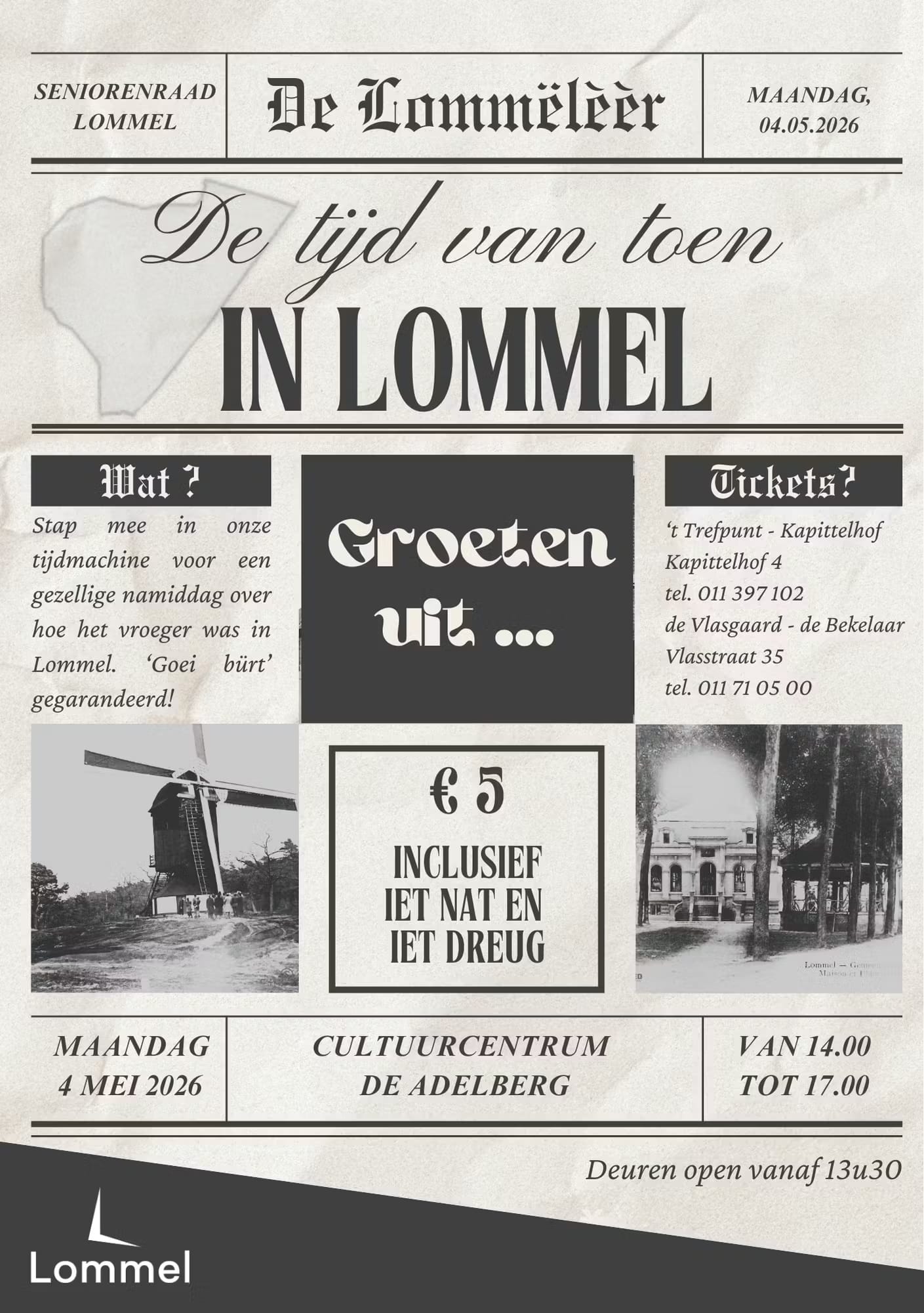 Kom die dag genieten van een gezellige namiddag in CC De Adelberg over hoe het vroeger in Lommel was. In samenwerking met Erfgoed Lommel werkte de Seniorenraad aan een ontspannende, verbindende namiddag waarbij ‘de tijd van toen’ in alle gehuchten van Lommel centraal staat. Aan de hand van foto’s, video's, leuke anekdotes, vertellingen, muziek, etc. wordt je meegenomen naar de ‘tijd van toen’.