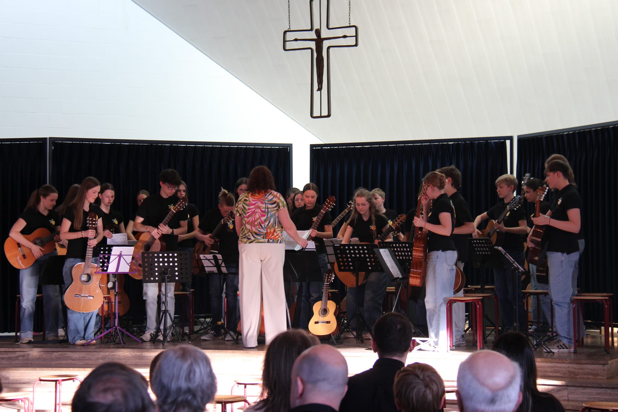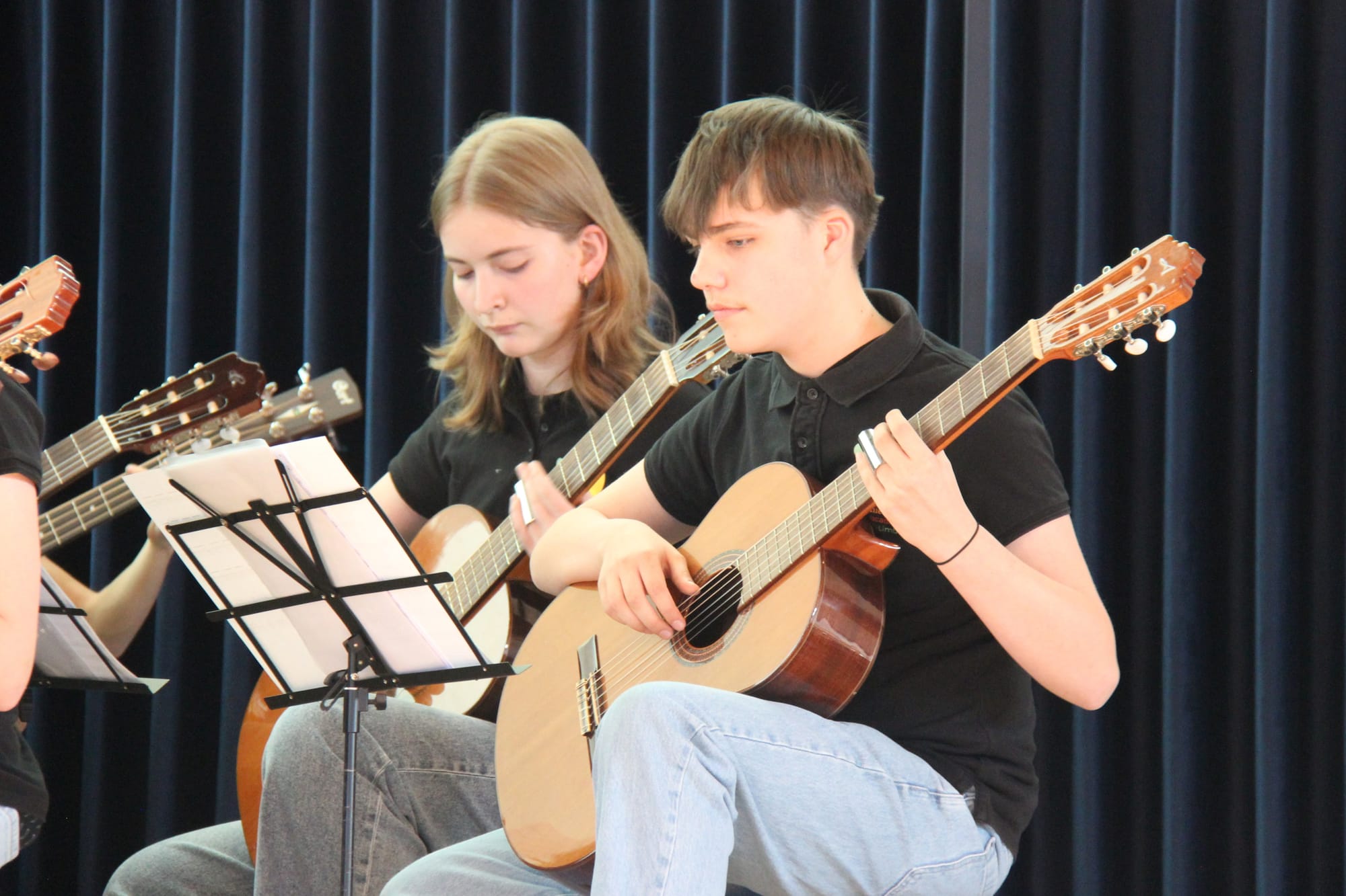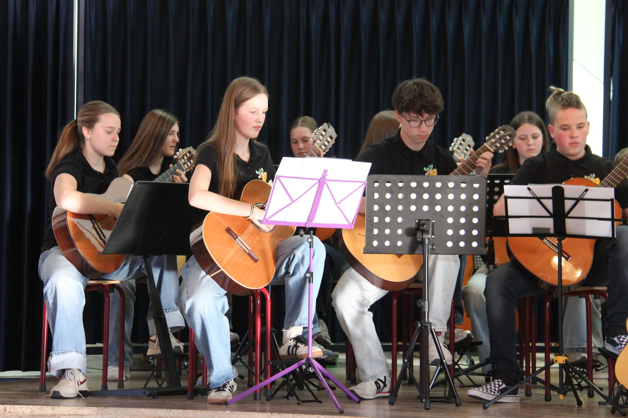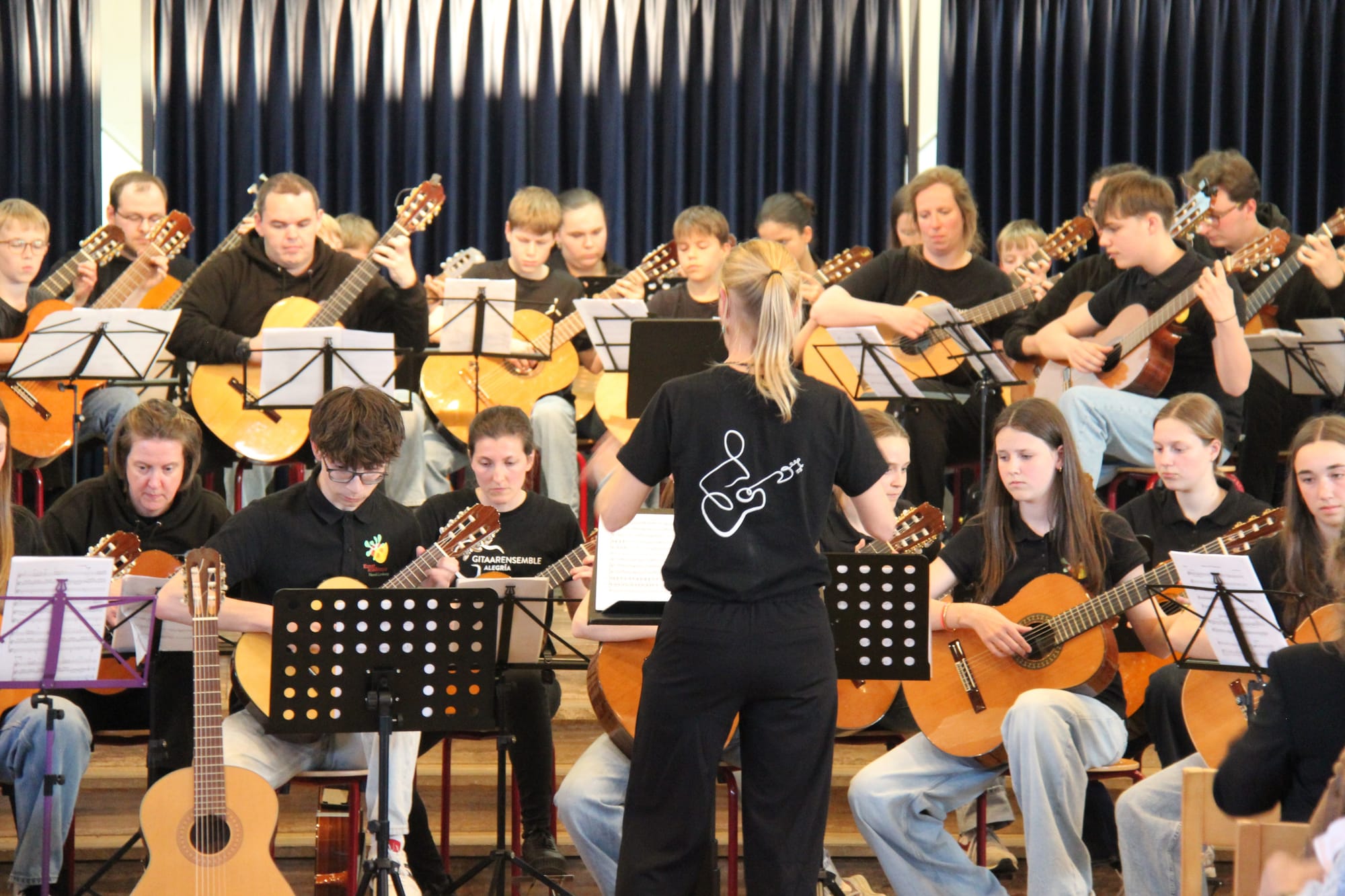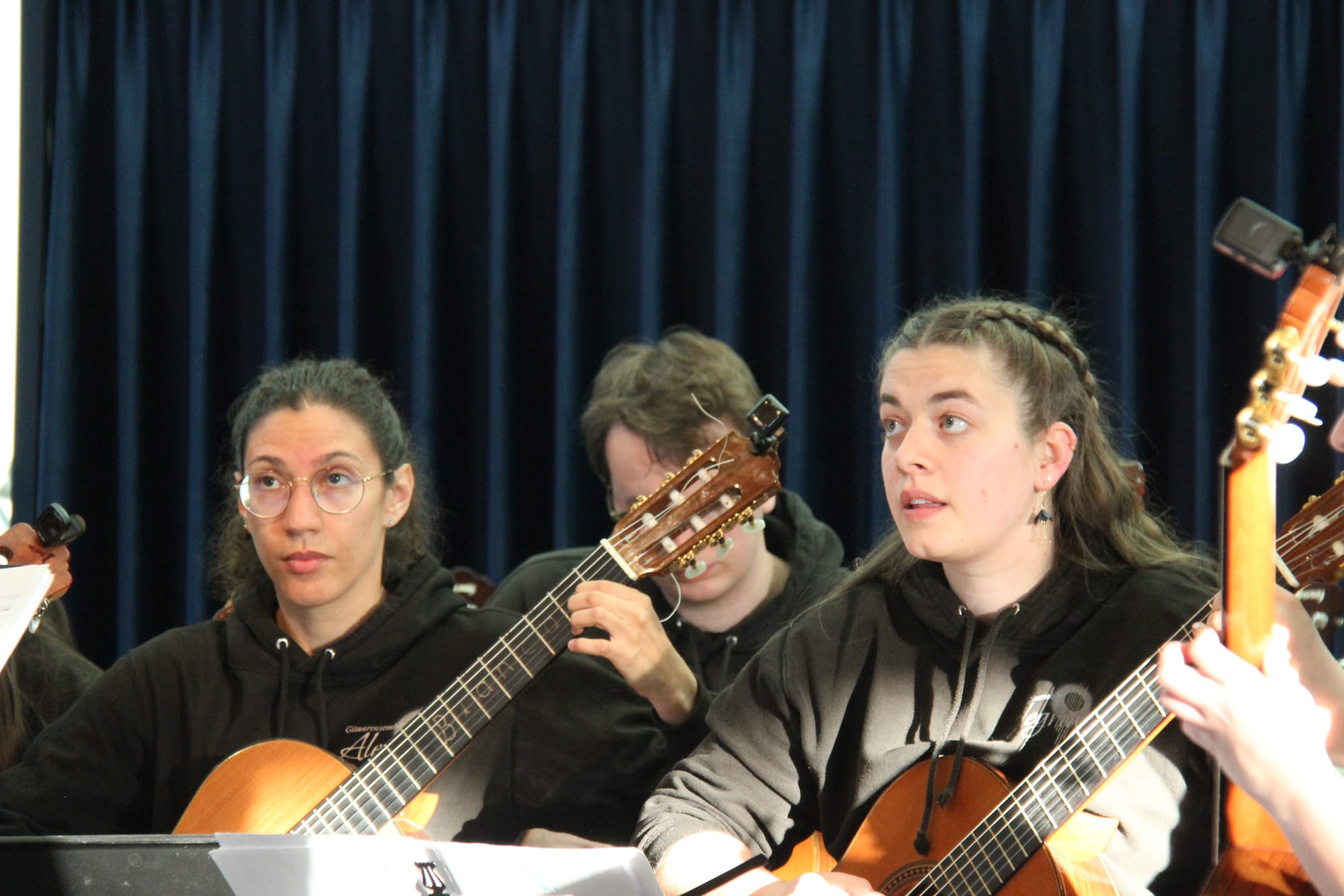 Daarna was het de beurt aan gitaarensemble Alegría uit Waregem. Ook hun samenspel wist het publiek te verwonderen met onder meer *Bohemian Rapsodie*, *Fear of the Dark* van Iron Maiden, *Moments for Morricone* en andere herkenbare melodieën.