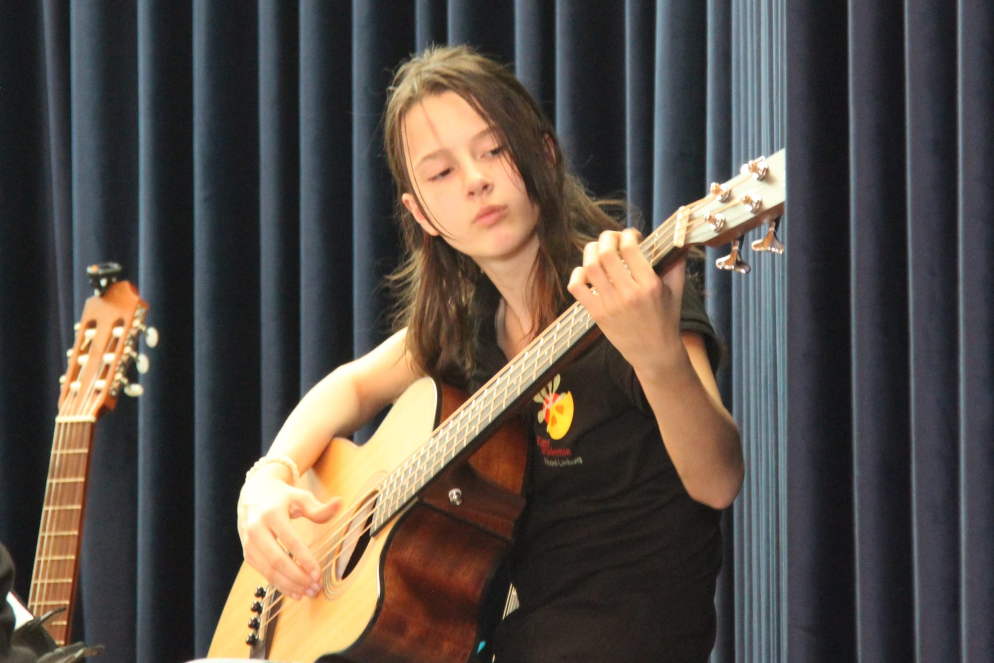 Gitaarorkest Tambora mocht de spits afbijten. De naam ‘Tambora’ verwijst naar een techniek die gebruikt wordt in flamenco en klassieke muziek, waarbij een snaredrum wordt geïmiteerd door met de zijkant van de hand net naast de brug van de gitaar te slaan. Het orkest bracht een gevarieerd programma met bekende nummers zoals *Wonderwall* van Oasis, *Beauty and the Beast* van Alan Menken en *Havana* van Camila Cabello
