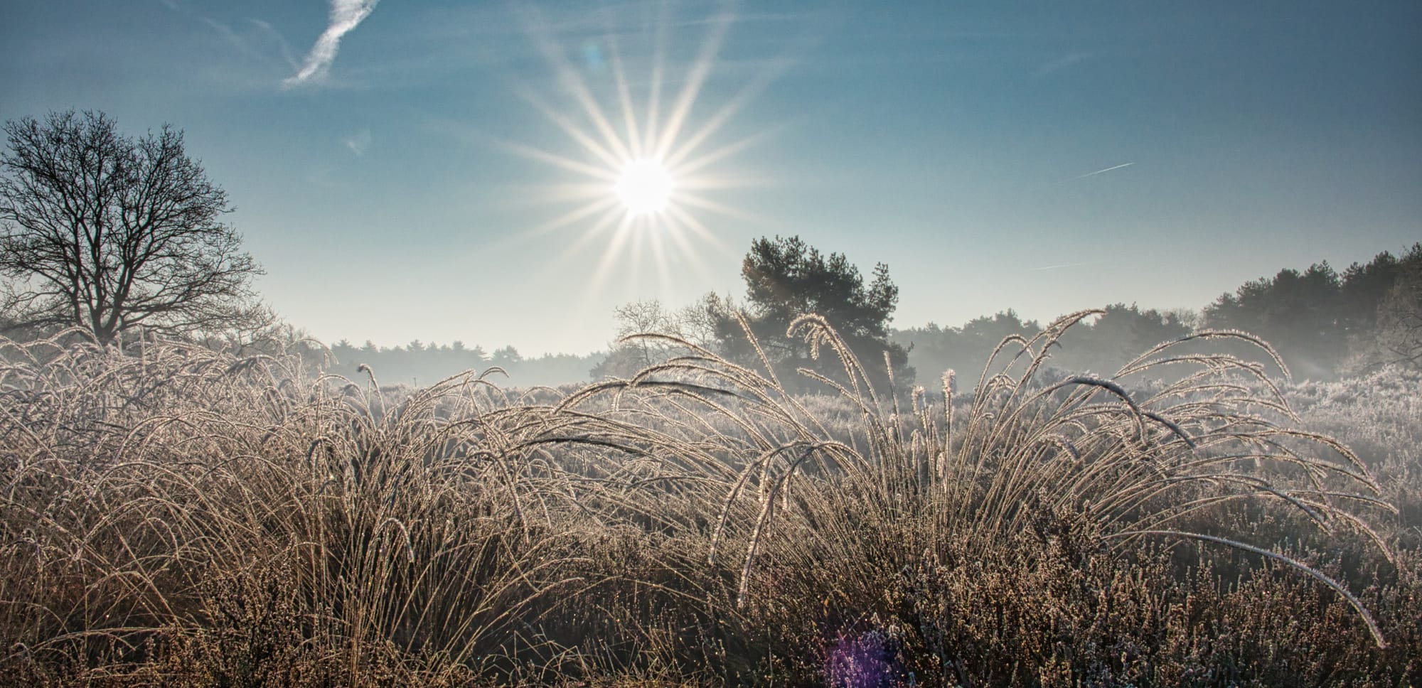 Wanneer de zonnestralen voorzichtig door het grijs breken, verandert het landschap. Schaduwen worden langer en schuiven over de heide, alsof de tijd zelf traag op gang komt. Het licht raakt de rijm en laat de kou even glanzen, niet hard of vijandig, maar helder en kwetsbaar.