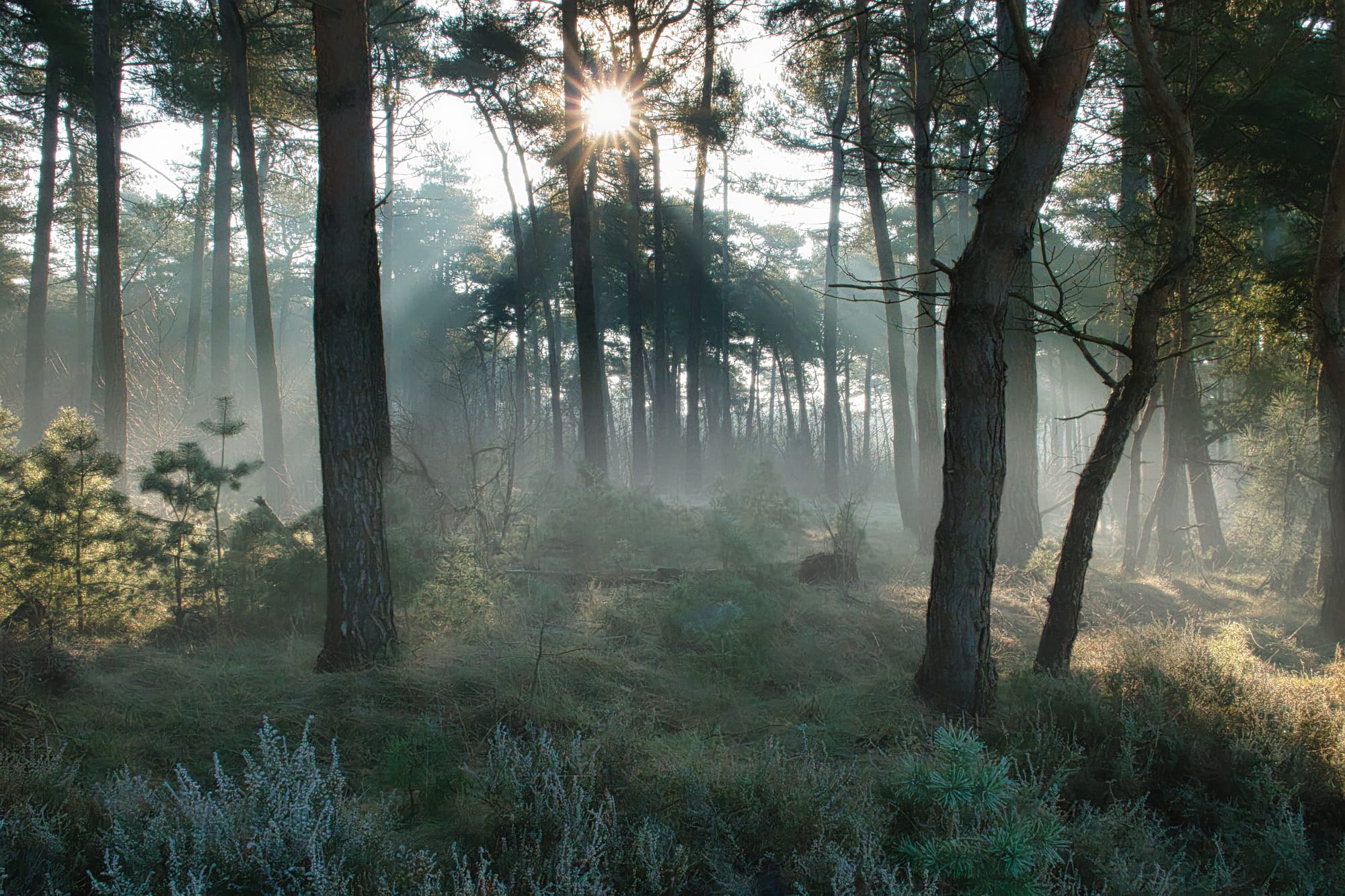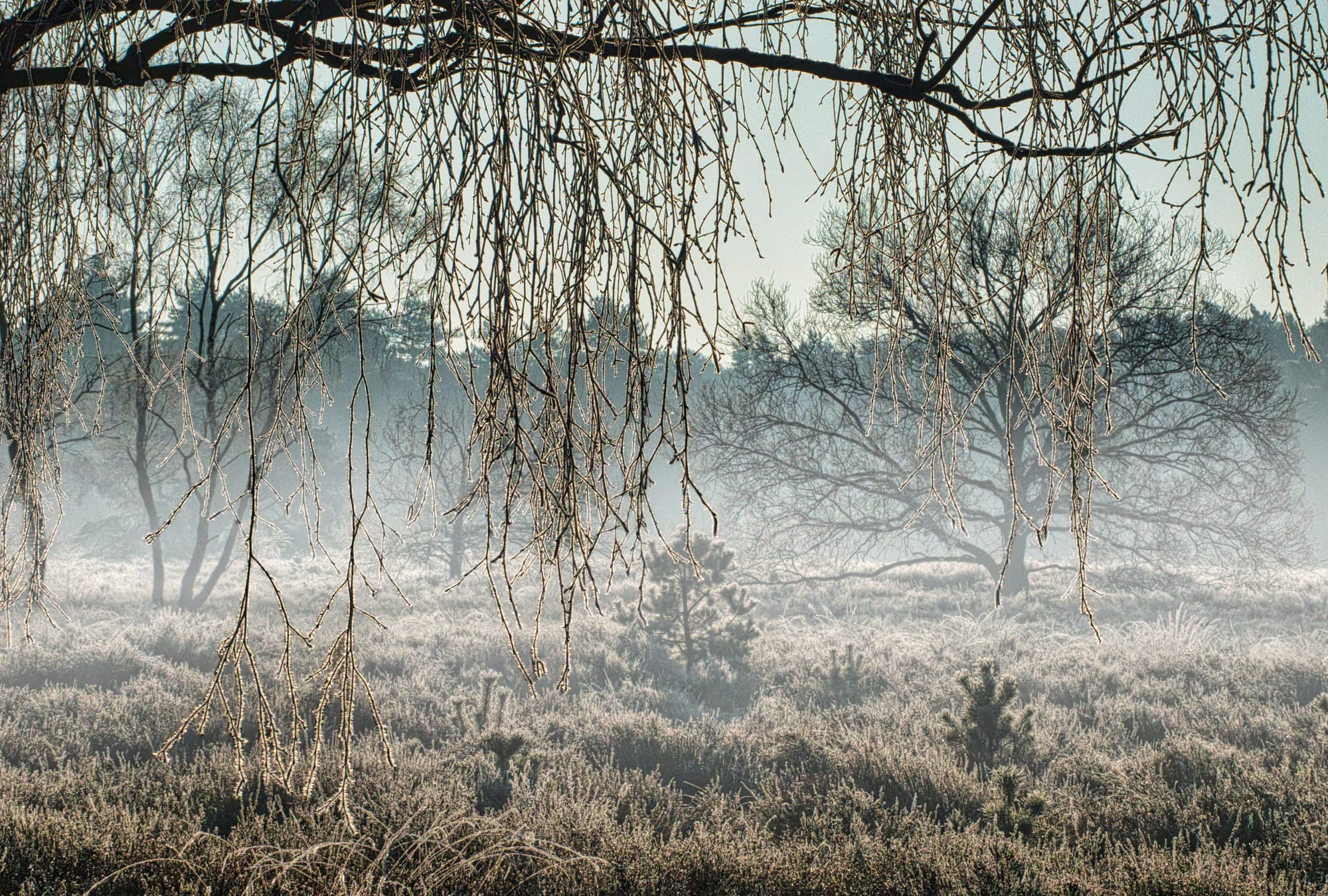 Op een koude morgen ligt de Heuvelse Heide onder een dunne sluier van mist. De vorst heeft het landschap verstild, elke grasspriet draagt bevroren dauwdruppels die als kleine kristallen het eerste licht vangen.