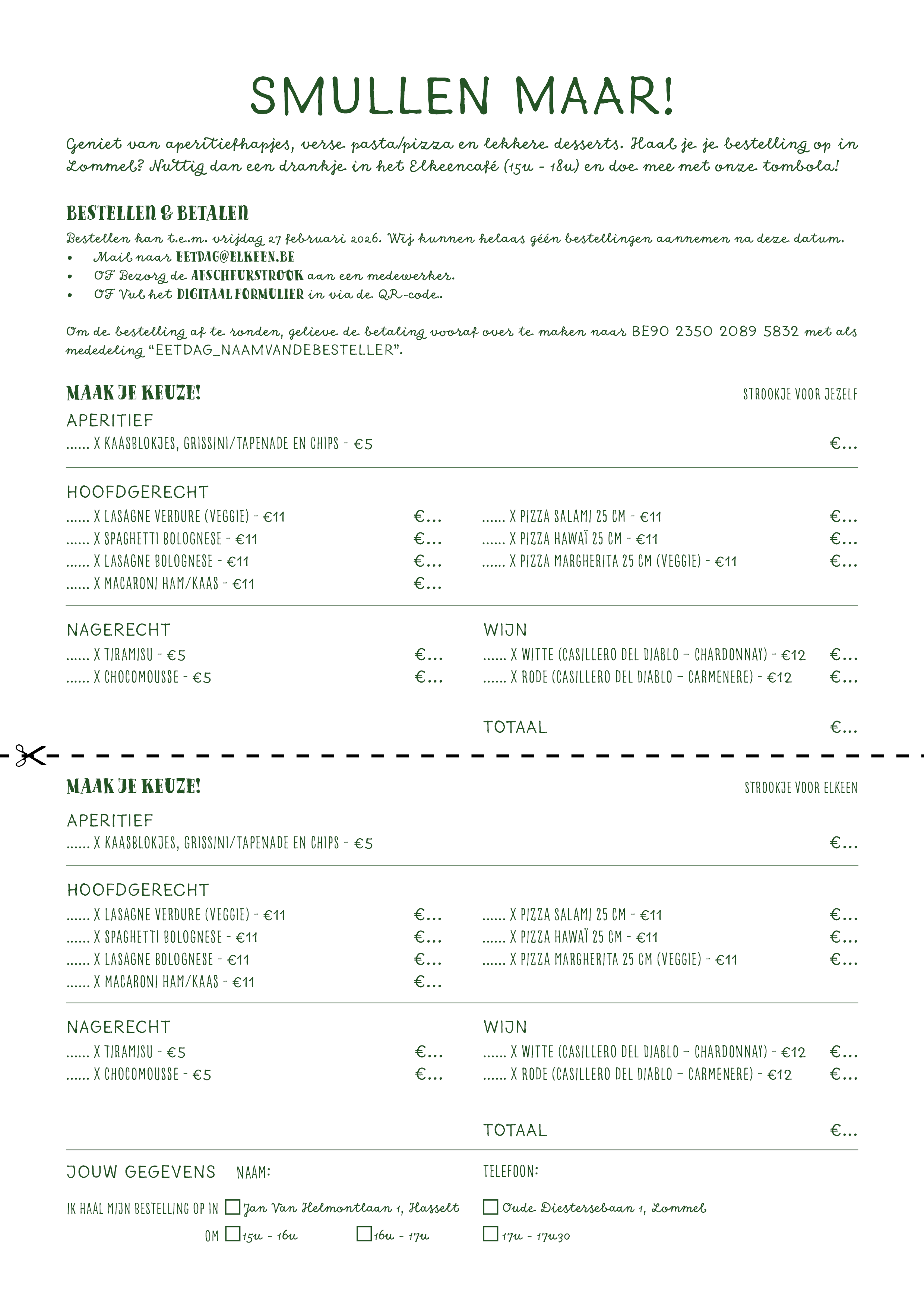 Wie zijn bestelling afhaalt in Lommel, kan van 15u tot 18u terecht in het Elkeencafé voor een gezellig drankje en een kans om deel te nemen aan een leuke tombola. Bestellingen kunnen volledig op maat worden gedaan en moeten uiterlijk 27 februari via het Google Formulier worden doorgegeven.