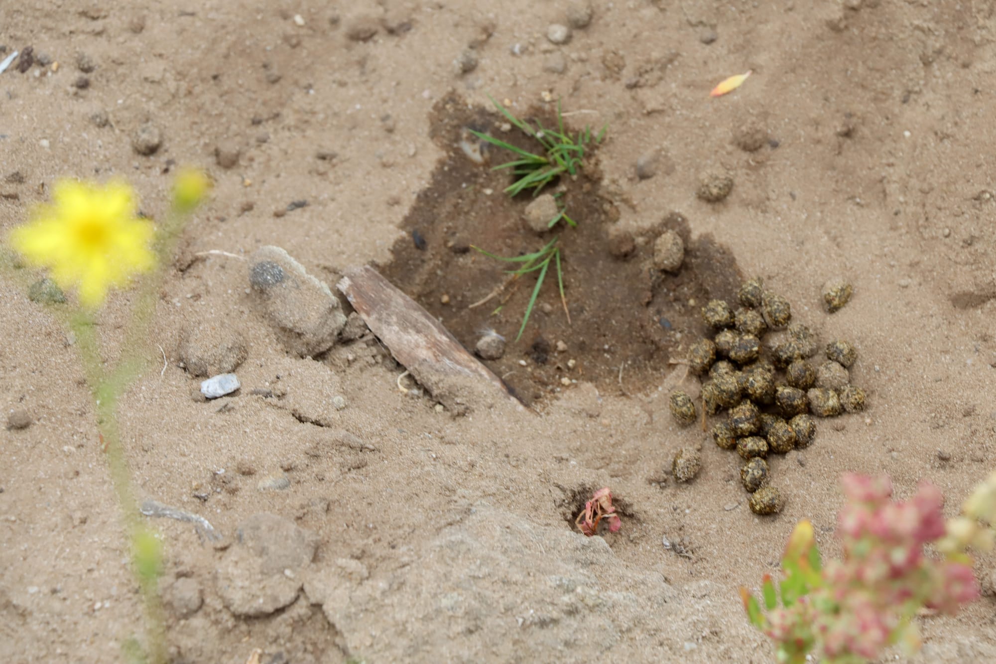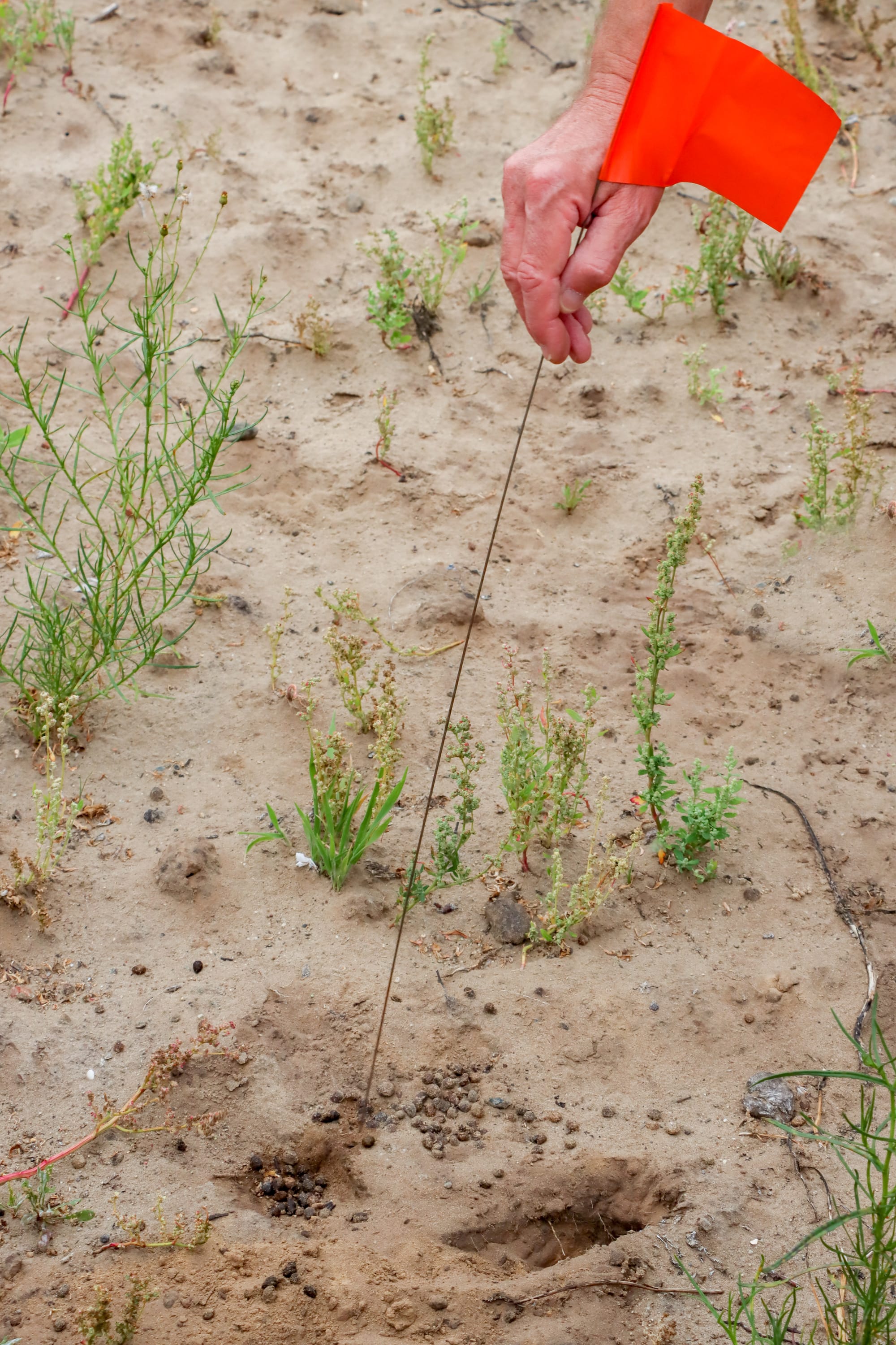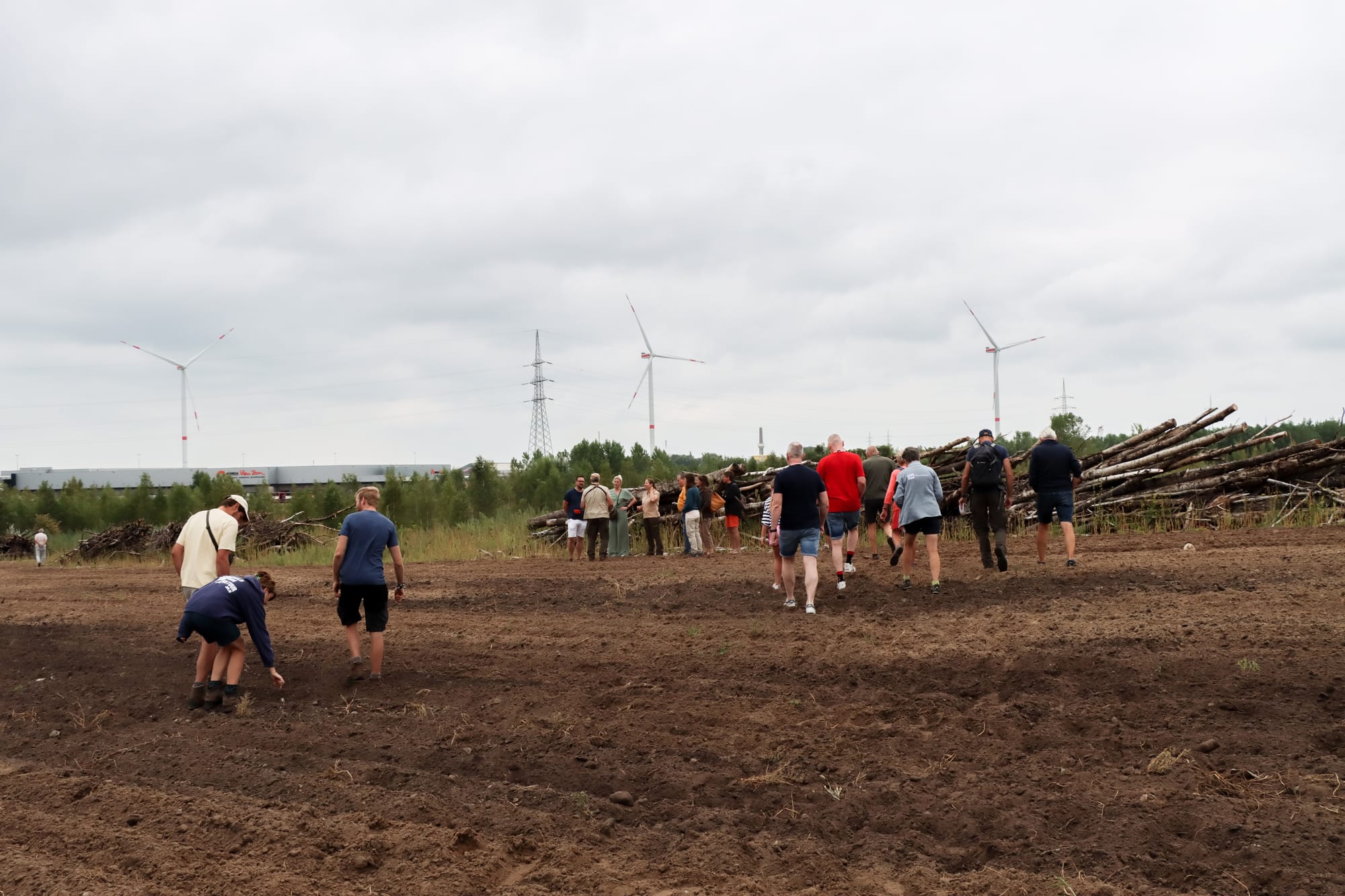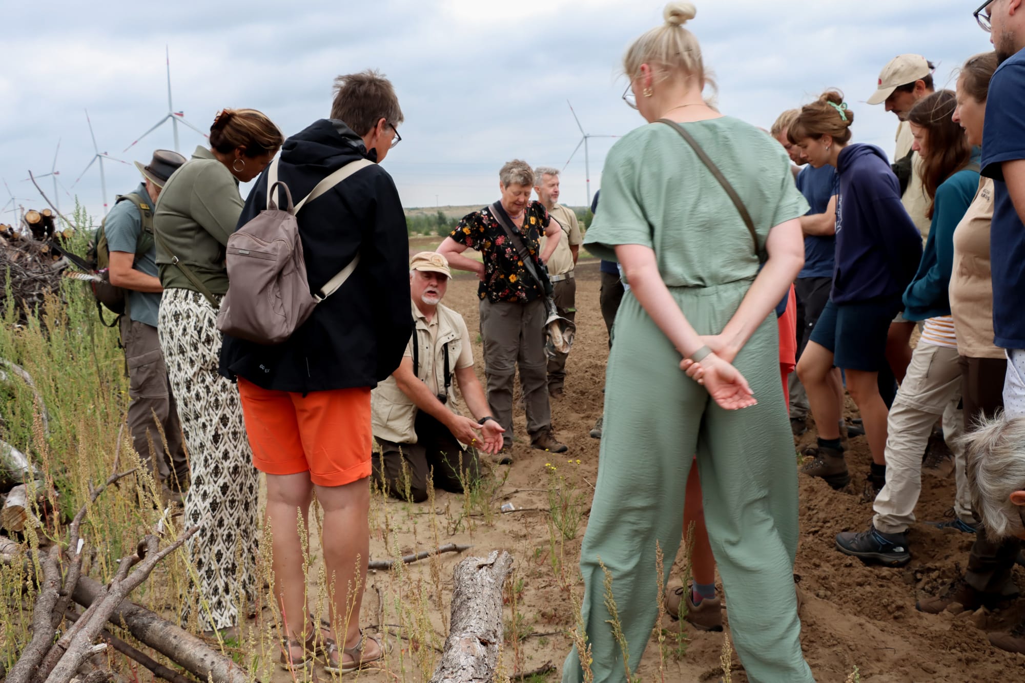 Vandaag, tijdens het infomoment konden de ongeveer 30 aanwezigen zelf op sporenonderzoek om zich een beeld te vormen van de soorten die reeds gebruik maken van het ecoduct. Boswachters Eddy Ulenaers en Bert Geraerts namen ons mee op pad en we ontdekten op het ecoduct duidelijke pootafdrukken van onder andere een everzwijn, een ree en zelfs van een hondachtige - misschien wel een wolf – wie weet. Misschien een beetje jammer van de droge ondergrond waardoor de afdrukken minder zichtbaar waren. Sporen zijn niet alleen afdrukken van poten in het zand, maar ook bijvoorbeeld de uitwerpselen van de dieren. De 2 aanwezige, gediplomeerde sporenonderzoekers wisten ons niet alleen te vertellen van welk dier, welke uitwerpselen waren maar, konden daarnaast ook info geven over wat de dieren gegeten hadden. We zagen duidelijk de uitwerpselen van konijnen, maar ook van marters en misschien zelfs een wasbeer.