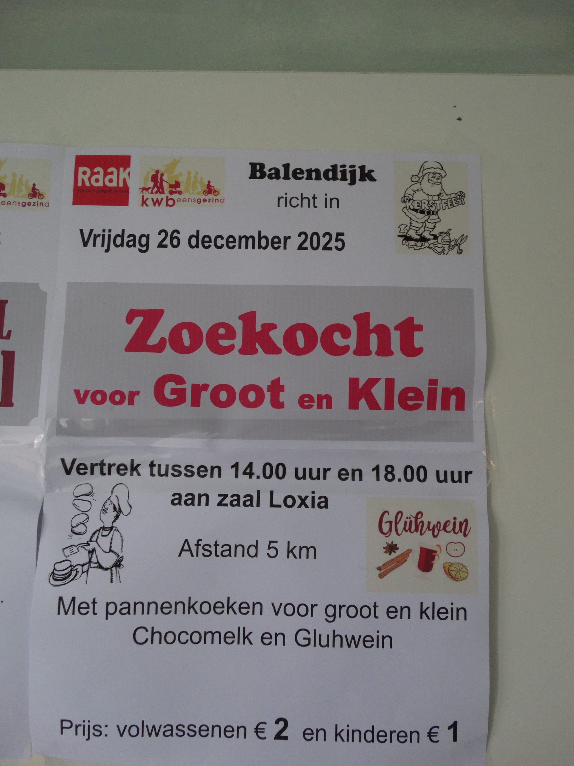 Op vrijdag 26 december 2025 organiseert Raak Balendijk opnieuw een fijne activiteit: een zoektocht voor groot en klein over een afstand van 5 km. Iedereen is welkom tussen 14.00 uur en 18.00 uur aan zaal Loxia. Uiteraard wordt er ook dan gezorgd voor lekkers, met overheerlijke pannenkoeken, chocomelk én glühwein.