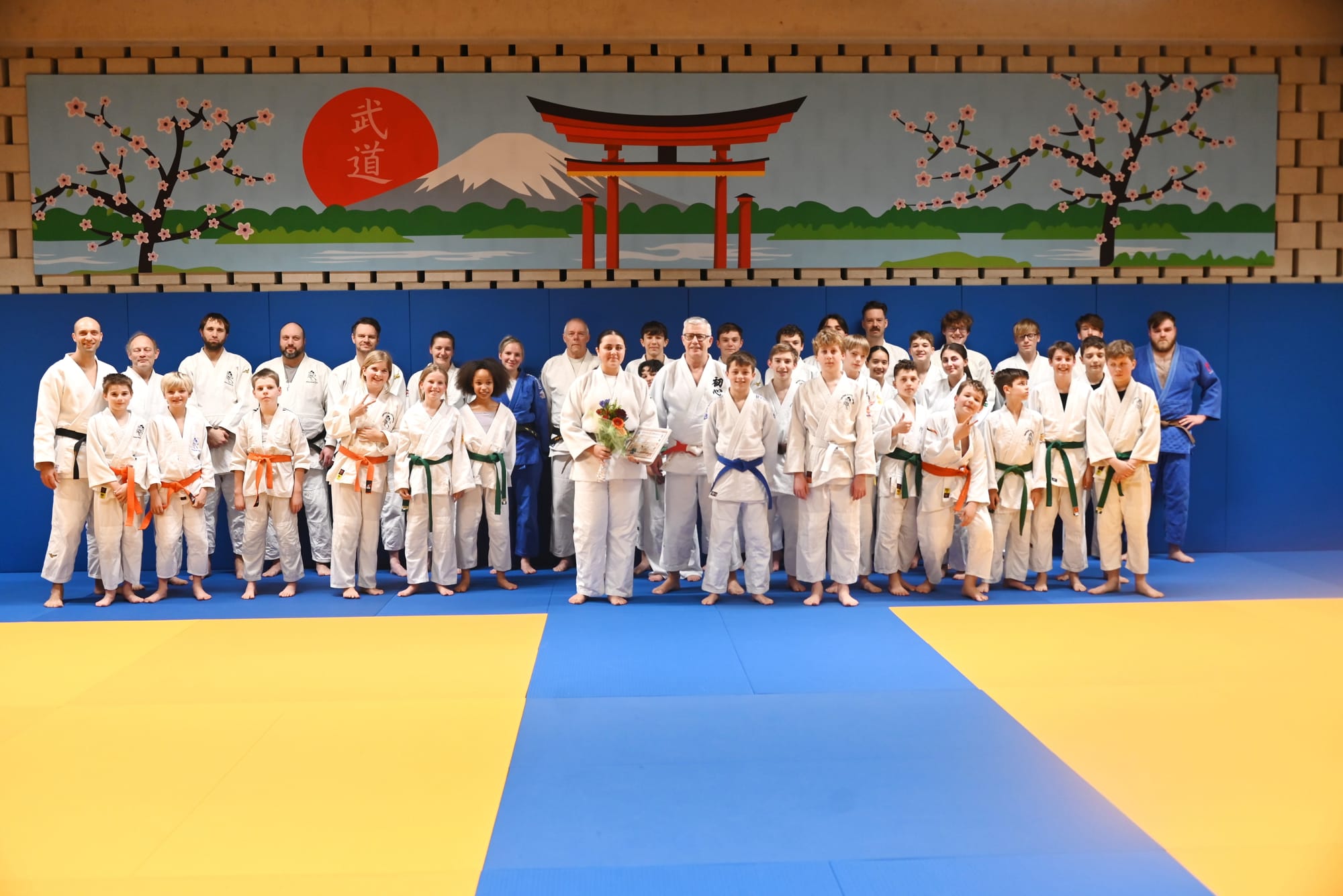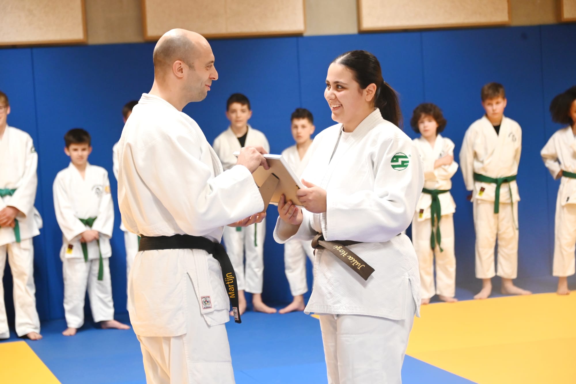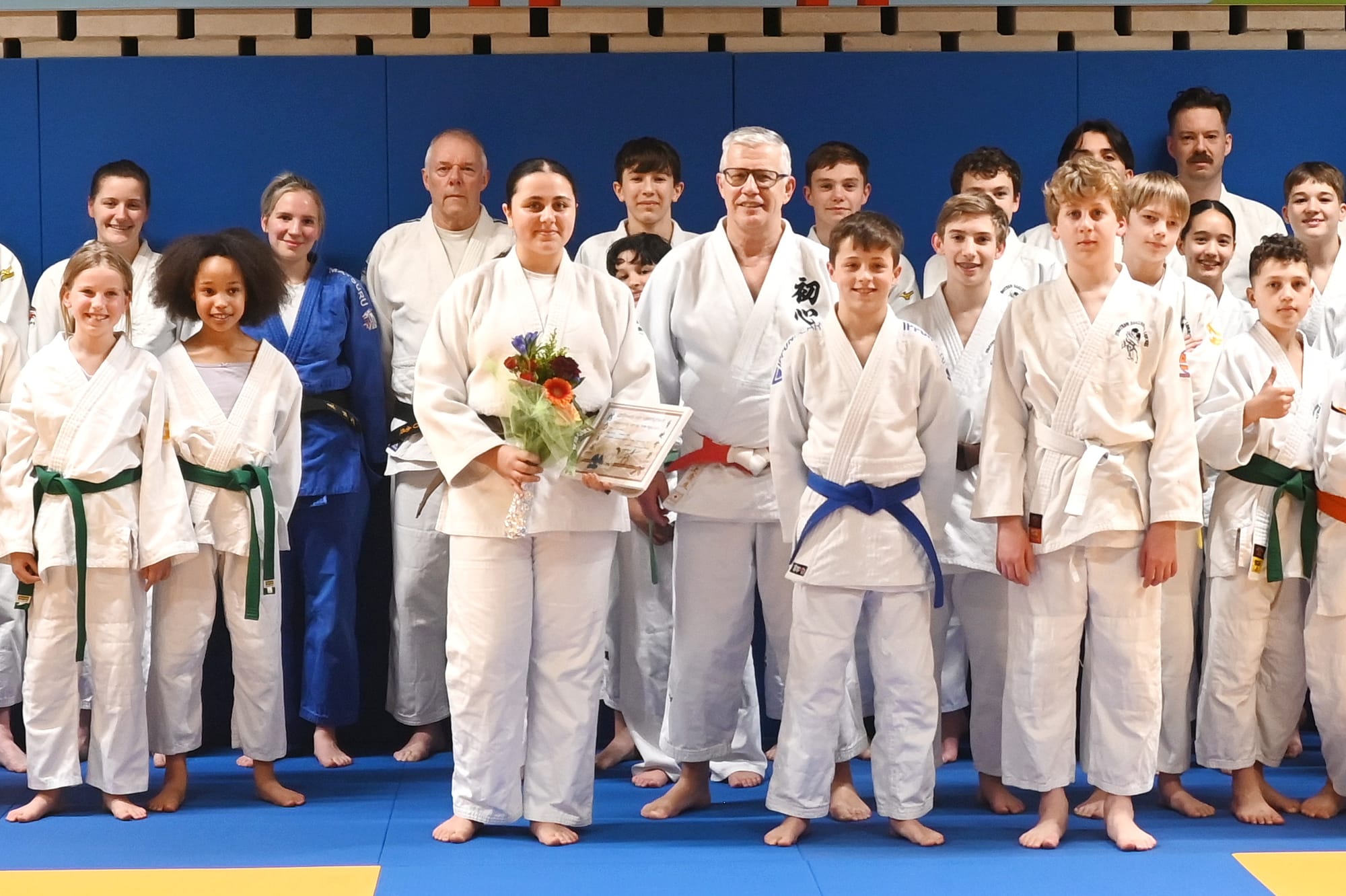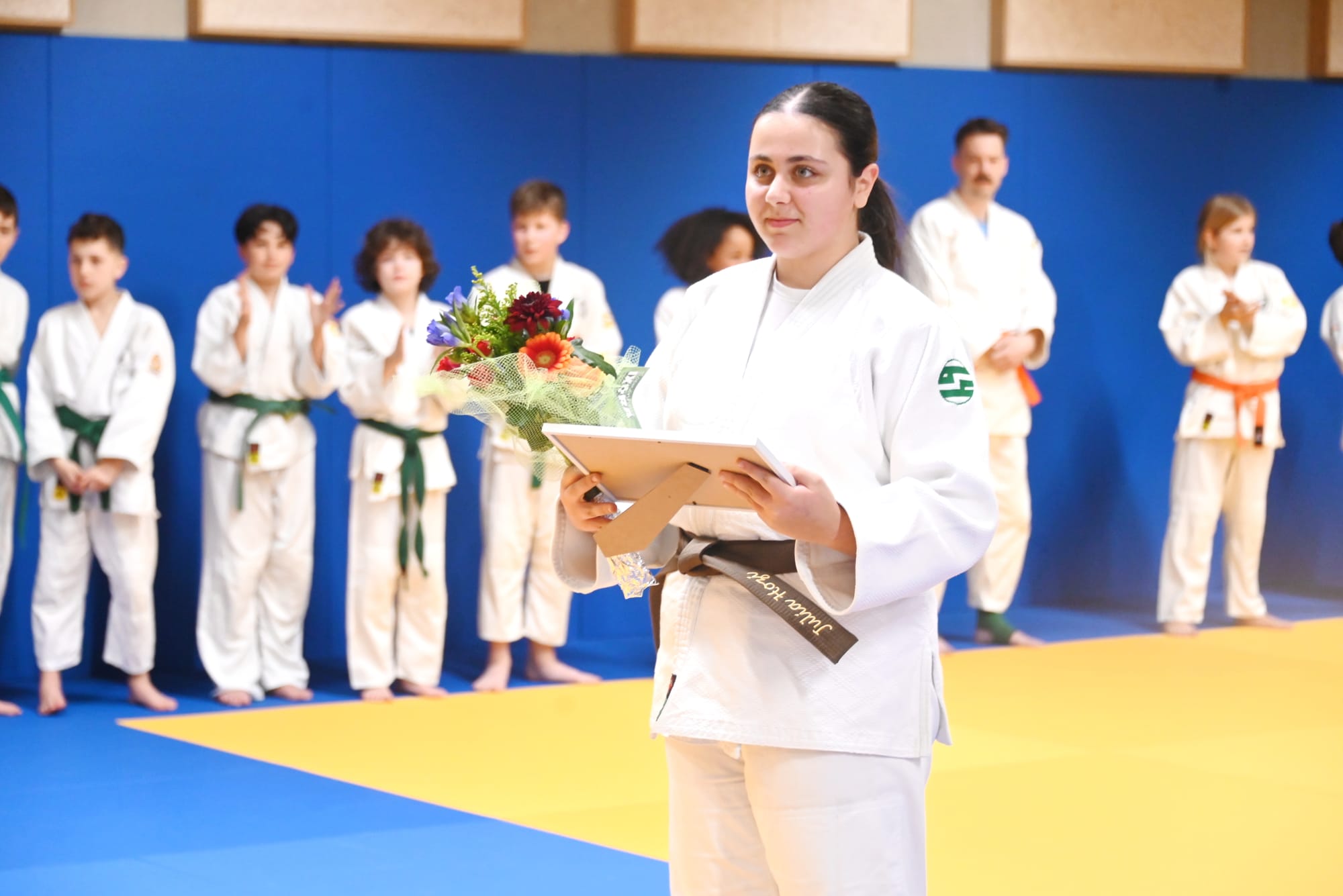 Maar niet alleen in de bloemetjes gezet... Vanweg trainer Jean Jacques Melotte kreeg ze vandaag ook de bruine gordel, die ze onmiddellijk mocht omgorden i.p.v. haar blauwe. "Het is de eerste keer in mijn erg lange carrière dat ik iemand zonder daarvoor het nodige examen af te leggen deze gordel-upgrade toeken", aldus Jean Jacques. "Maar als je Belgisch kampioen kan worden met wedstrijden die amper een halve minuut in beslag nemen, dan hoef je je niet meer te bewijzen".