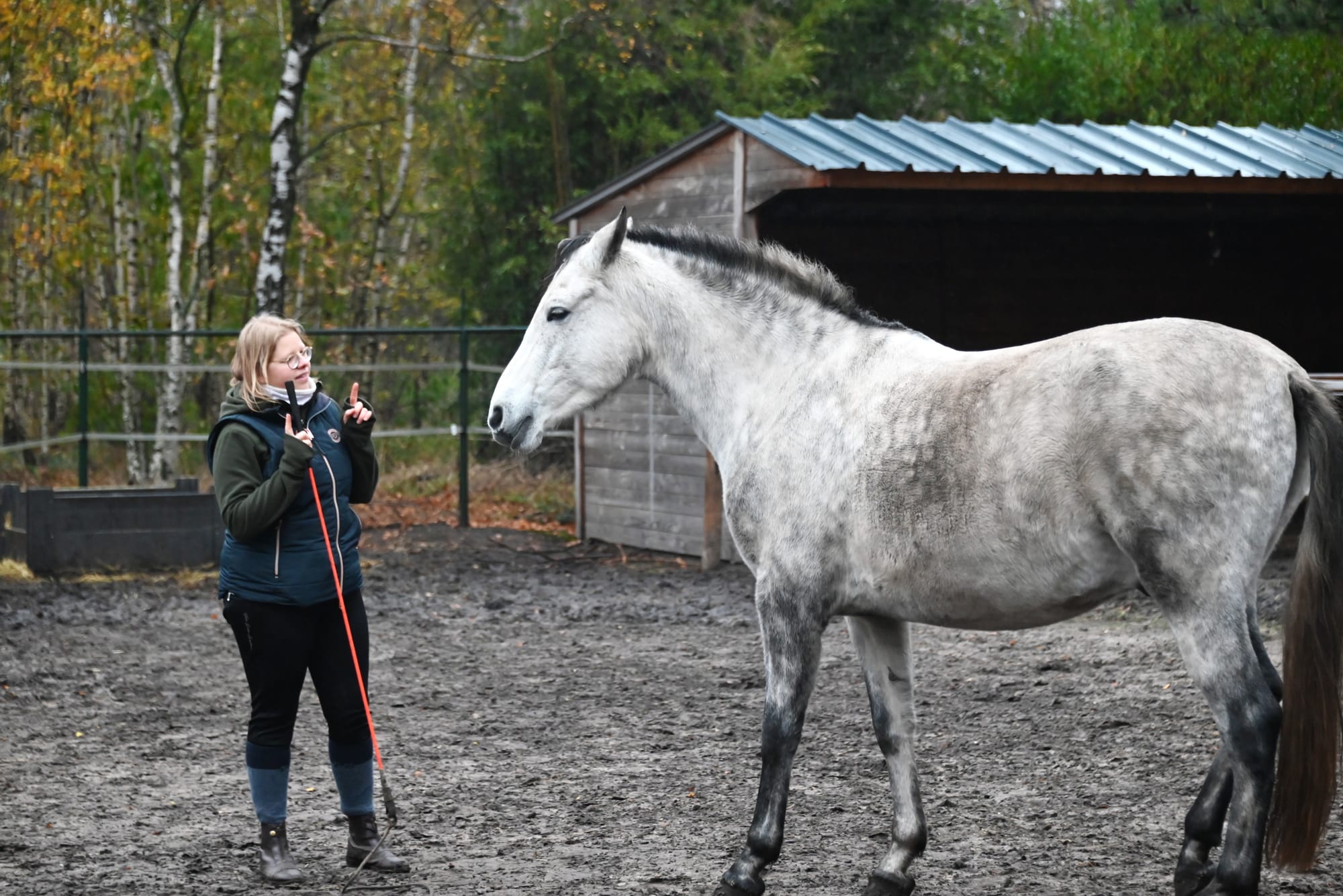 Neen! Helemaal niet. Zoals gezegd, binnen het Natural Horsemanship communiceren we via het lichaam met het paard, maar voor ons kan een paard absoluut niet 'spreken'. Wij als mensen praten wel tegen het paard, en gebruiken gebaren, en specifiek ook een lange stok. Niet om het dier te slaan, maar om als verlengde van onze arm te dienen, waardoor we bijna 'even groot' zijn als het paard, ook een stukje psychologie...