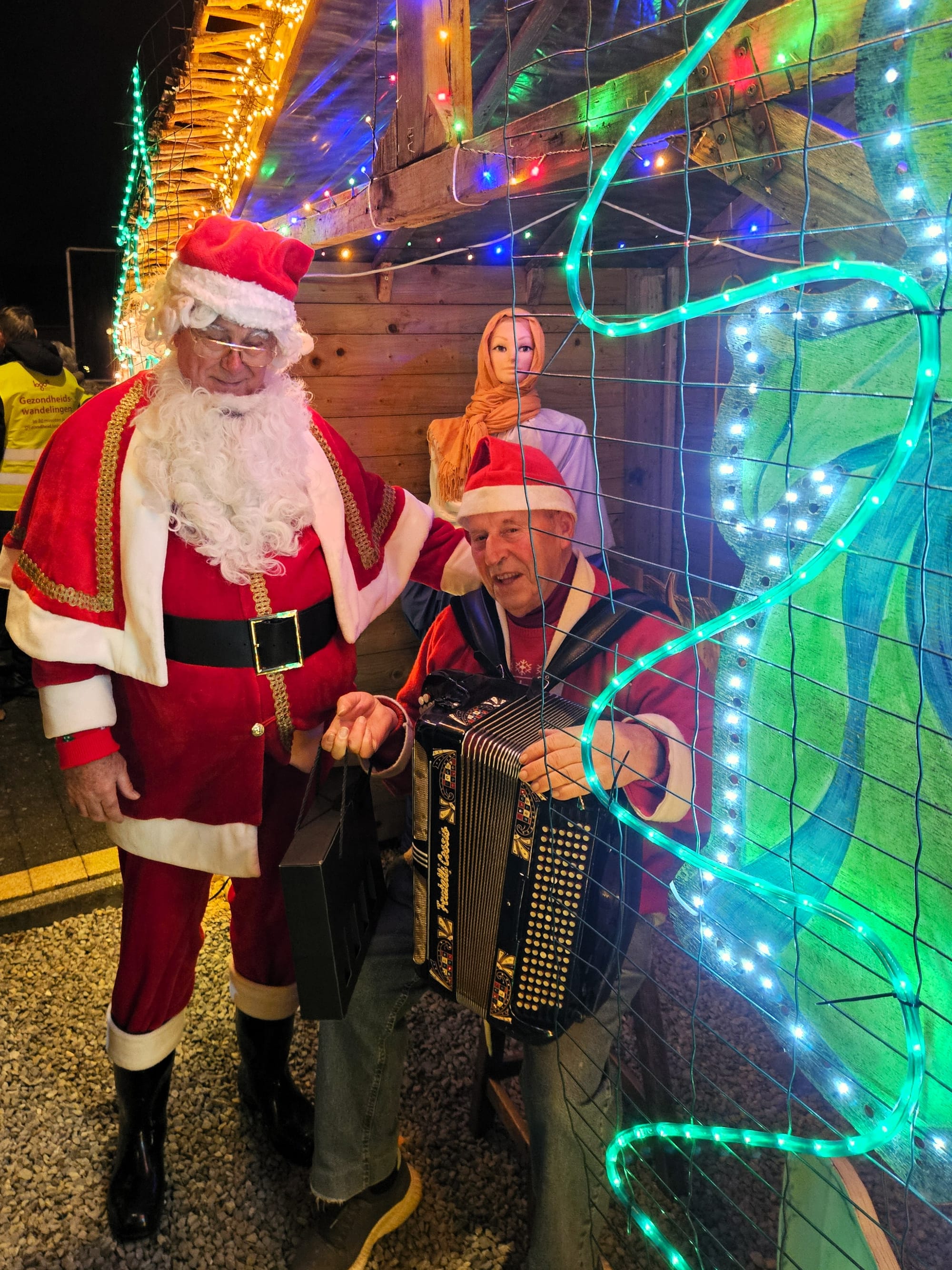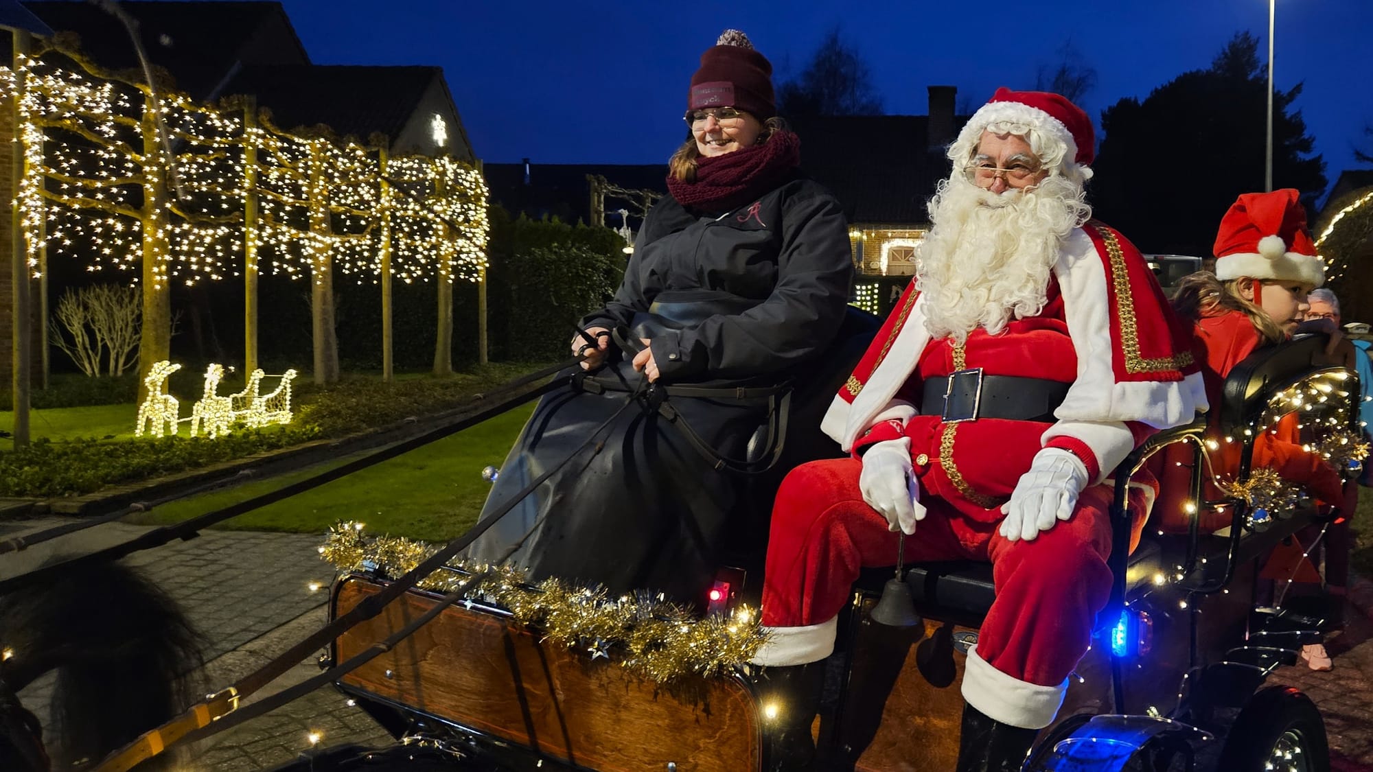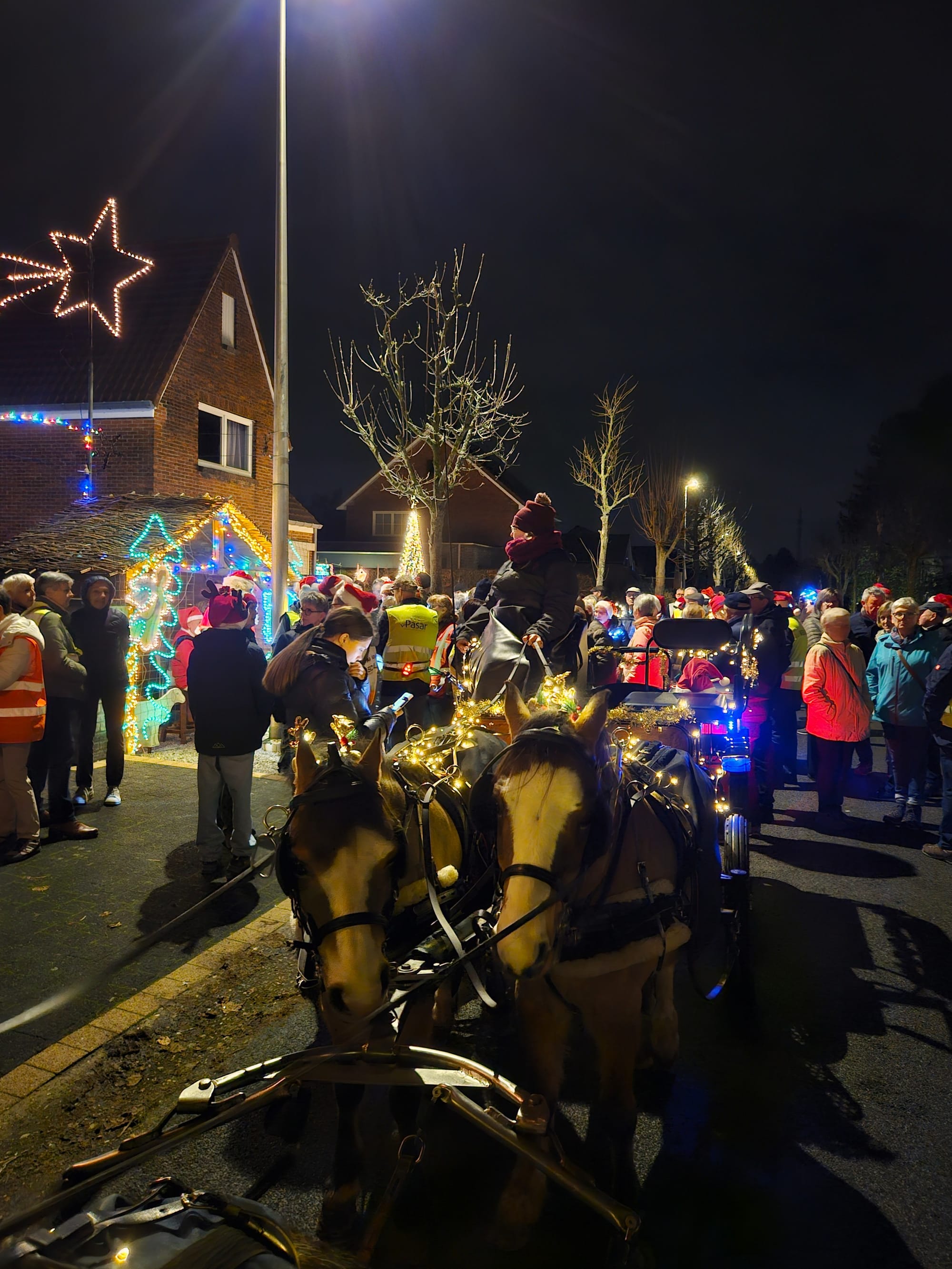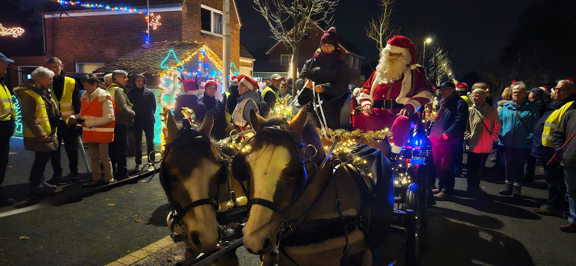 Hier kon al kort kennisgemaakt worden met de Kerstman, zijn elfje en de 4 paarden. De stoet trok zich rustig op gang richting het feeëriek versierde Ovenplein. Een prachtig kerstdecor onthulde zich daar. Vervolgens leidde de koets ons naar de borrelstand in de Leliestraat. Accordeonist Jos Willems ontving ons daar bij zijn prachtig verlichte woning met open armen, mede dankzij de medewerking van zijn buren. De borrels, maar vooral de warme chocomelk, kwamen goed van pas.