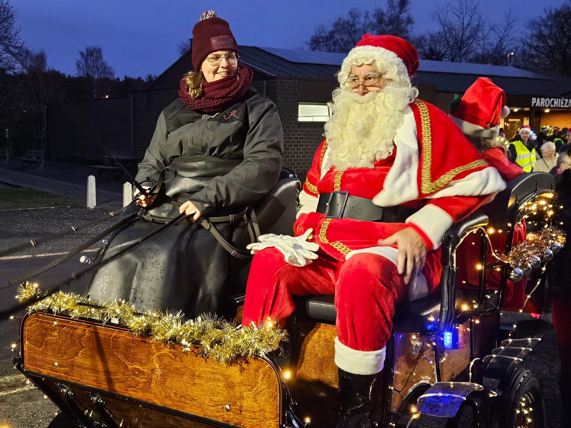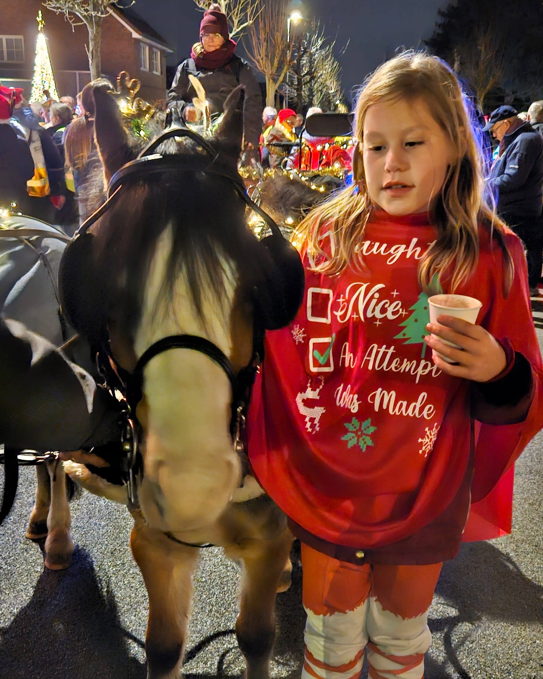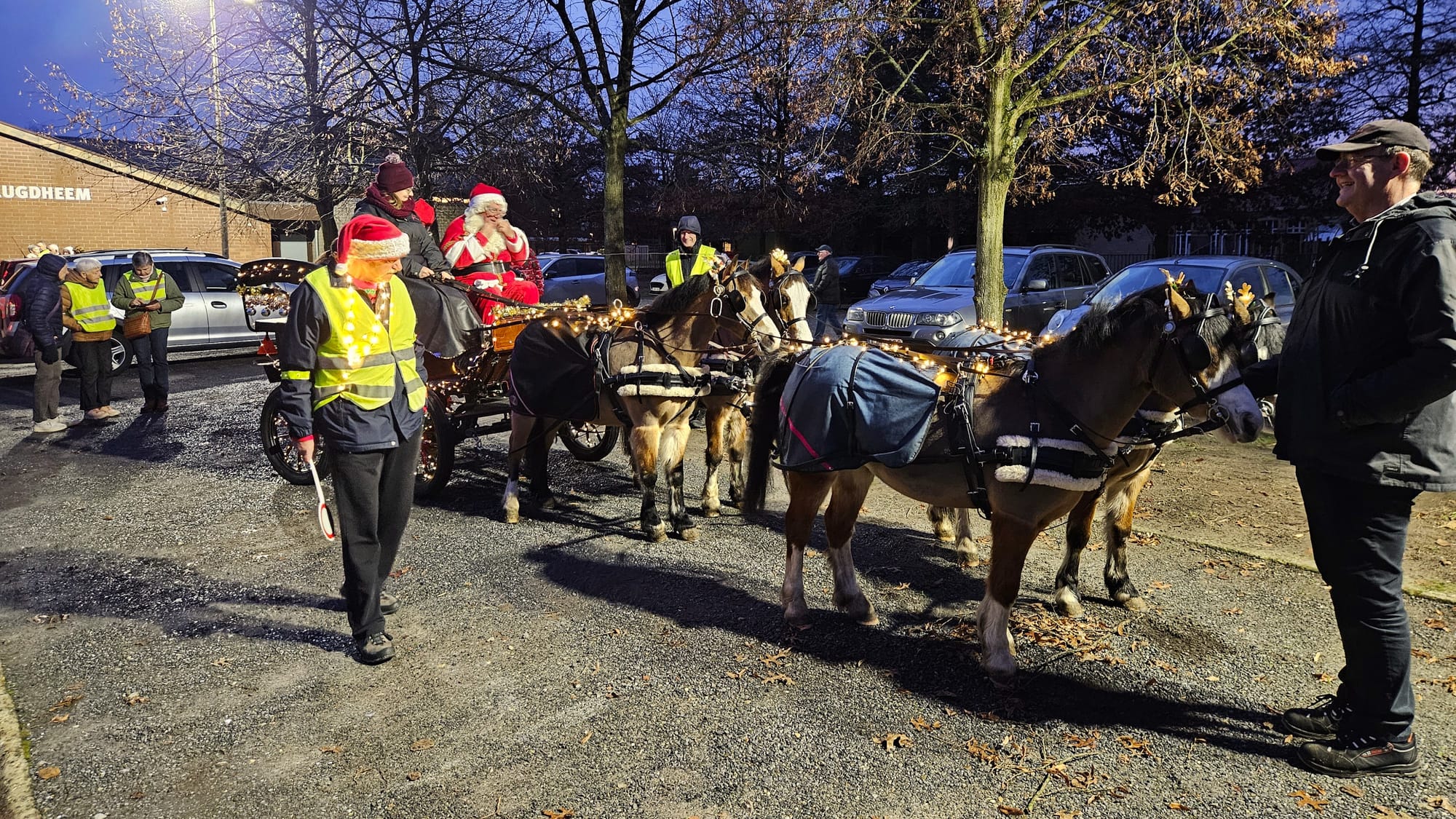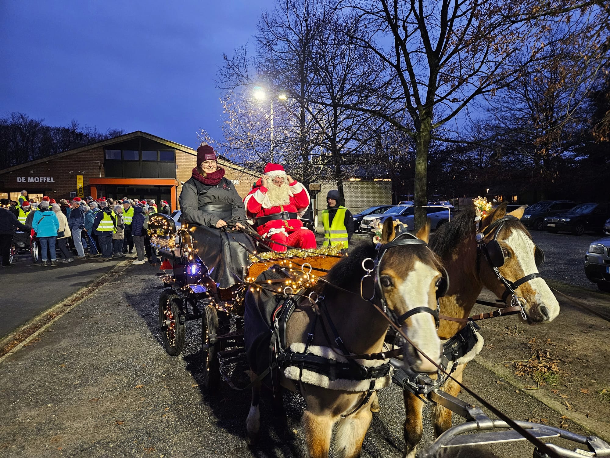 Hier kon al kort kennisgemaakt worden met de Kerstman, zijn elfje en de 4 paarden. De stoet trok zich rustig op gang richting het feeëriek versierde Ovenplein. Een prachtig kerstdecor onthulde zich daar. Vervolgens leidde de koets ons naar de borrelstand in de Leliestraat. Accordeonist Jos Willems ontving ons daar bij zijn prachtig verlichte woning met open armen, mede dankzij de medewerking van zijn buren. De borrels, maar vooral de warme chocomelk, kwamen goed van pas.