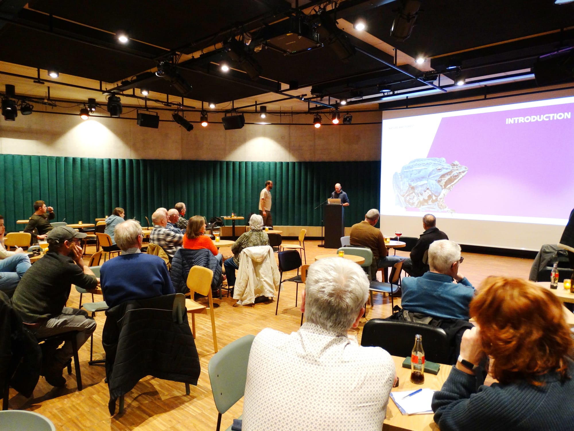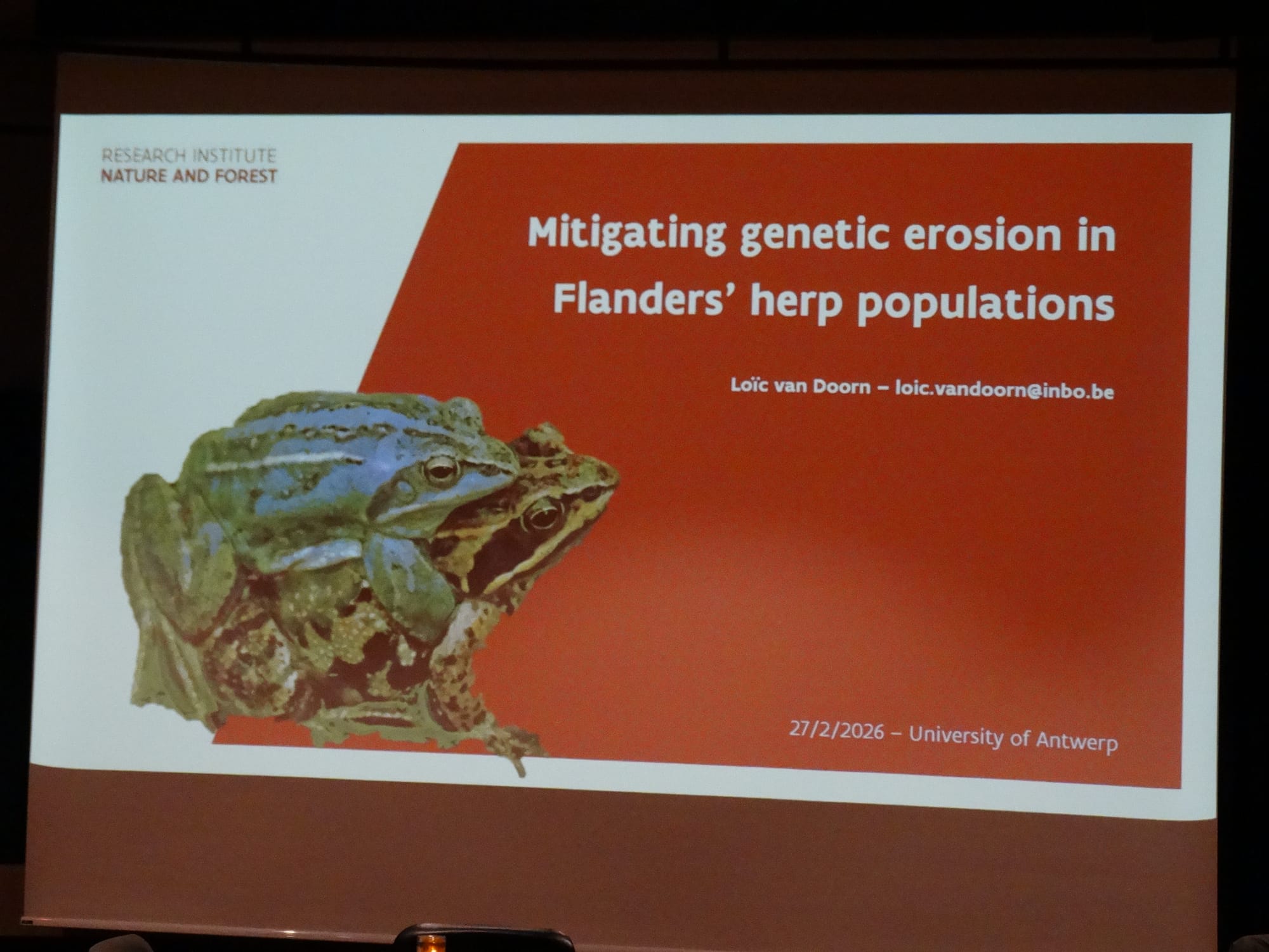 Loïc nam het eerste deel voor zijn rekening en ging dieper in op kweekprogramma’s voor amfibieën zoals de Knoflookpad, Rugstreeppad en Vroedmeesterpad. Daarnaast sprak hij over onderzoek naar het herstel en beheer van natuurlijke populaties, monitoring via meetnetten en de aanpak van uitheemse invasieve soorten. Zijn internationale achtergrond in mariene biologie en herpetologie zorgt daarbij voor een brede wetenschappelijke kijk.