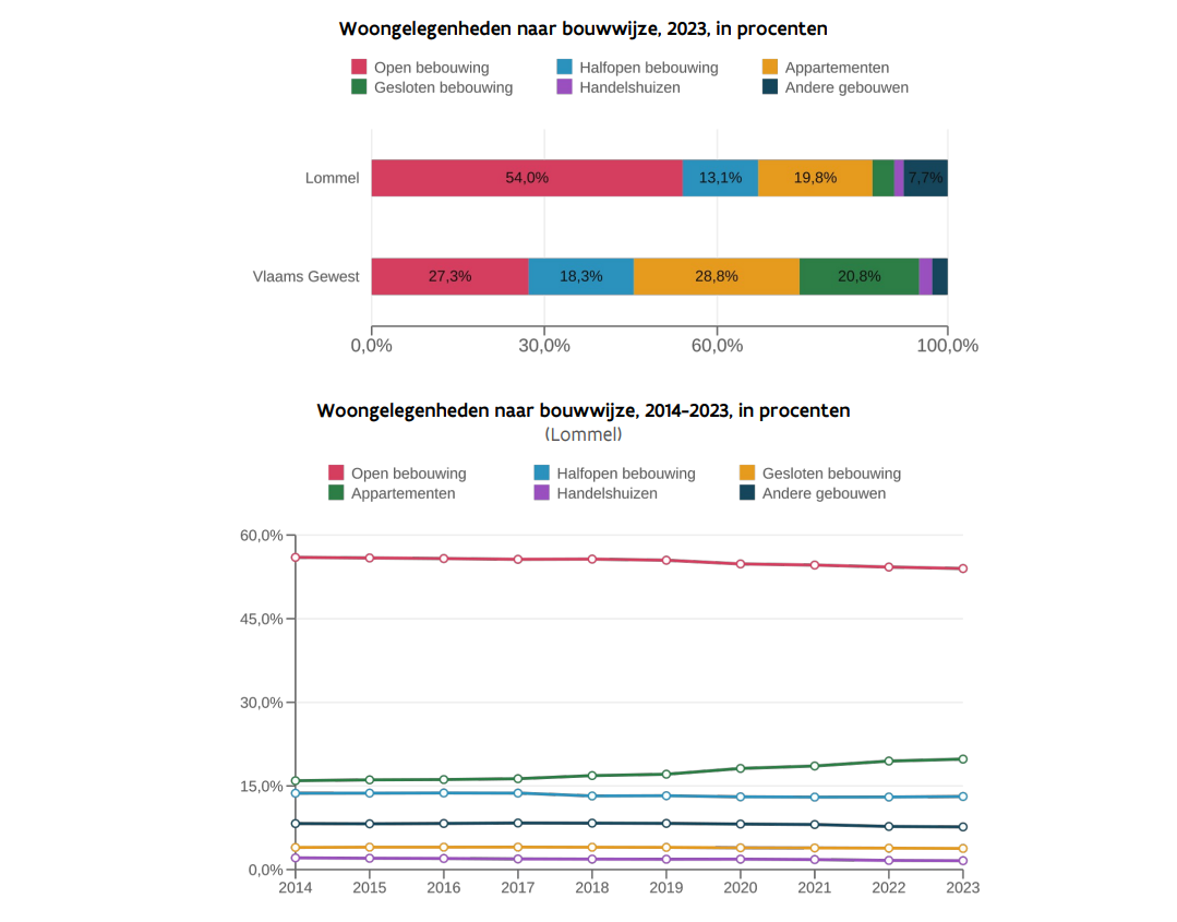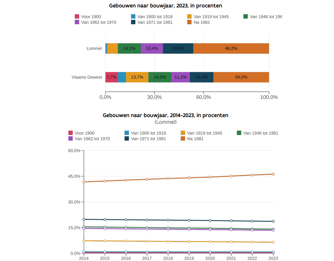 Wat woningen betreft, komen we in onze stad aan 70,9% huizen (66,3% gemiddeld), voor appartementen 19,8% tegenover 28,8% gemiddeld. Voor handelspanden ligt het percentage ook lager dan het gemiddelde, nl. 1,6% tegenover 2,2%. Wat nog erg opvalt in deze bevraging is dat de ouderdom van onze woningen beduidend jonger is dan gemiddeld in Vlaanderen! In Vlaanderen werd 26,3 van de woningen gebouwd vóór 1945, in Lommel amper 7,6%. En vooral na 1981 is het verschil met Vlaanderen geëvolueerd, en is ons woningaanbod 46,2 van na die datum, terwijl in Vlaanderen dat 34% bedraagt.