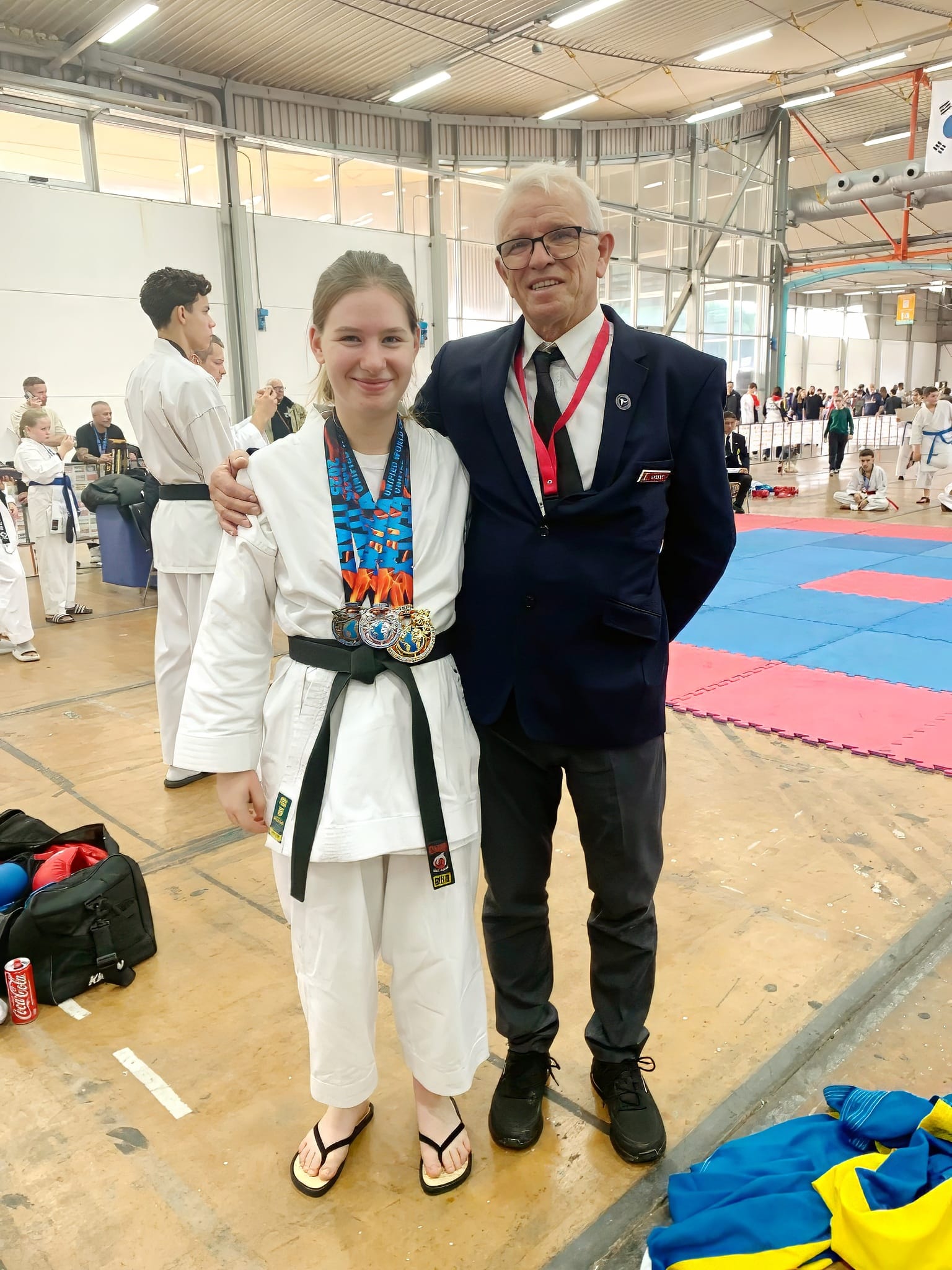 Noortje behaalde vandaag goud en zilver op individuele kata en brons, samen met Harland Mellaert in teamkata (eerste foto onderaan). Op de foto bovenaan staat ze met de 3 behaalde medailles samen met trainer sensei Ronny Lanckriet van Karateclub Kerkhoven. Proficiat!