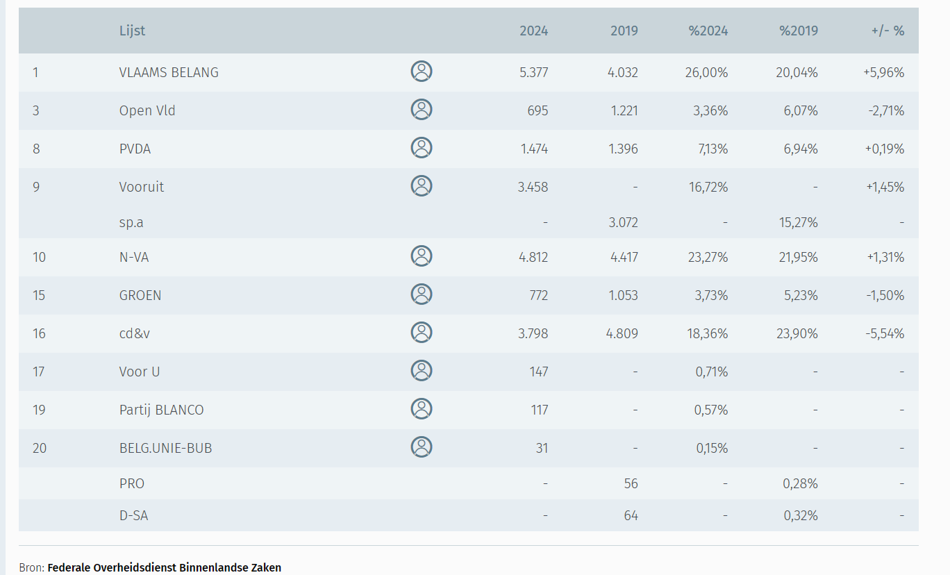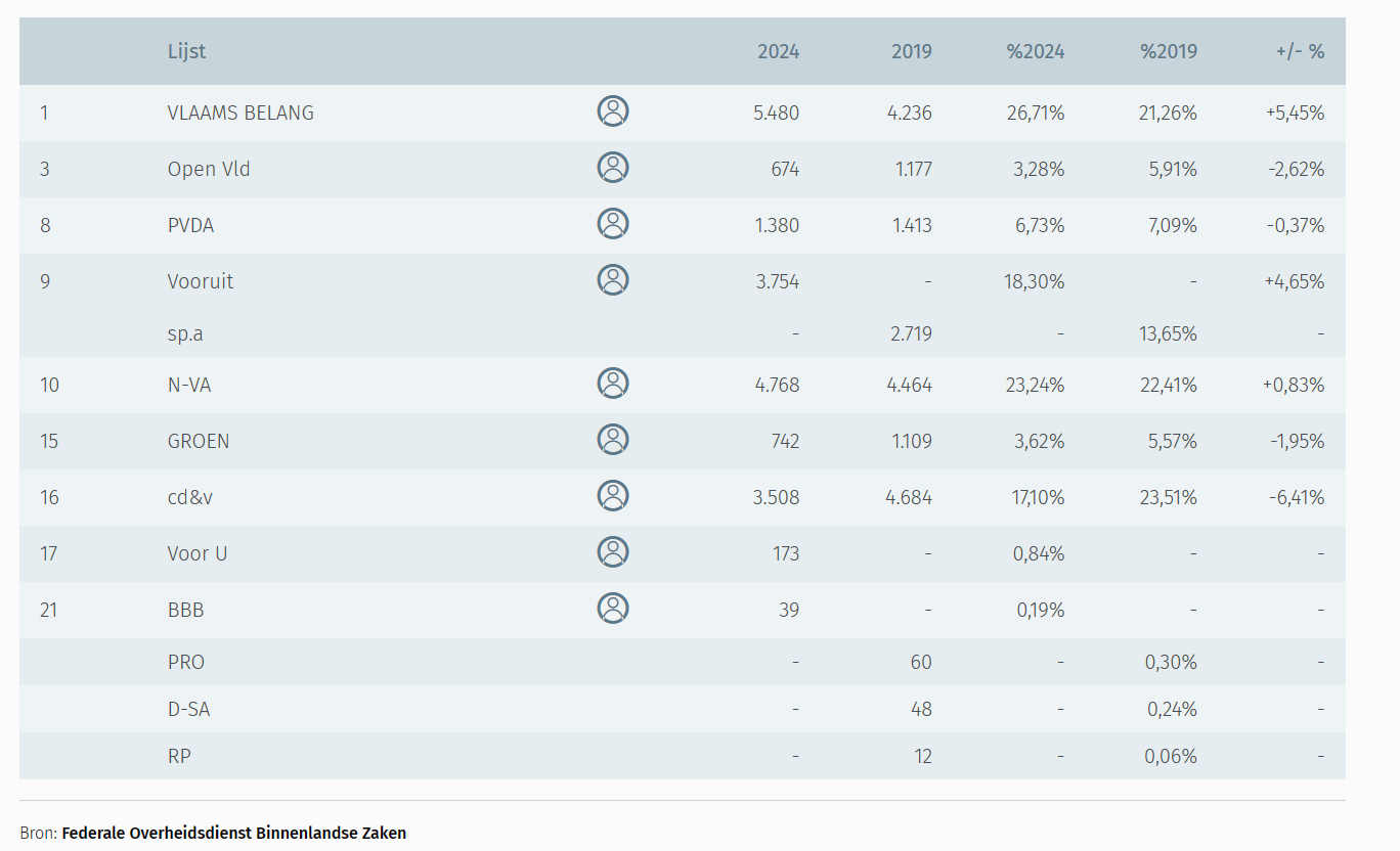 Een ander bijzonder feit is dat wat de percentages van de partijen betreft het Vlaams Belang ook hier in Lommel de grootste is... Zij scoren met een winst van een goeie 6% (t.o.v. 2019) op zowel de Vlaamse als de federale lijst rond de 26% en zijn dus de grootste, vóór de N-VA die op beide lijsten rond de 23% zit (federaal lichte winst, Vlaams licht verlies). Federaal wordt CD&V de derde partij met een goede 18% (maar 5,5% verlies) en Vooruit vierde met 16,7% (winst van 1,4%). Vlaams is het net omgekeerd: daar eindigt Vooruit als derde met 18% (winst 4,6%) vóór de CD&V met 17% (verlies van 6,4%). Groen en de Open VLD zakken naar een historisch dieptepunt van amper 3% terwijl de PVDA standhoudt op een goeie 7%.