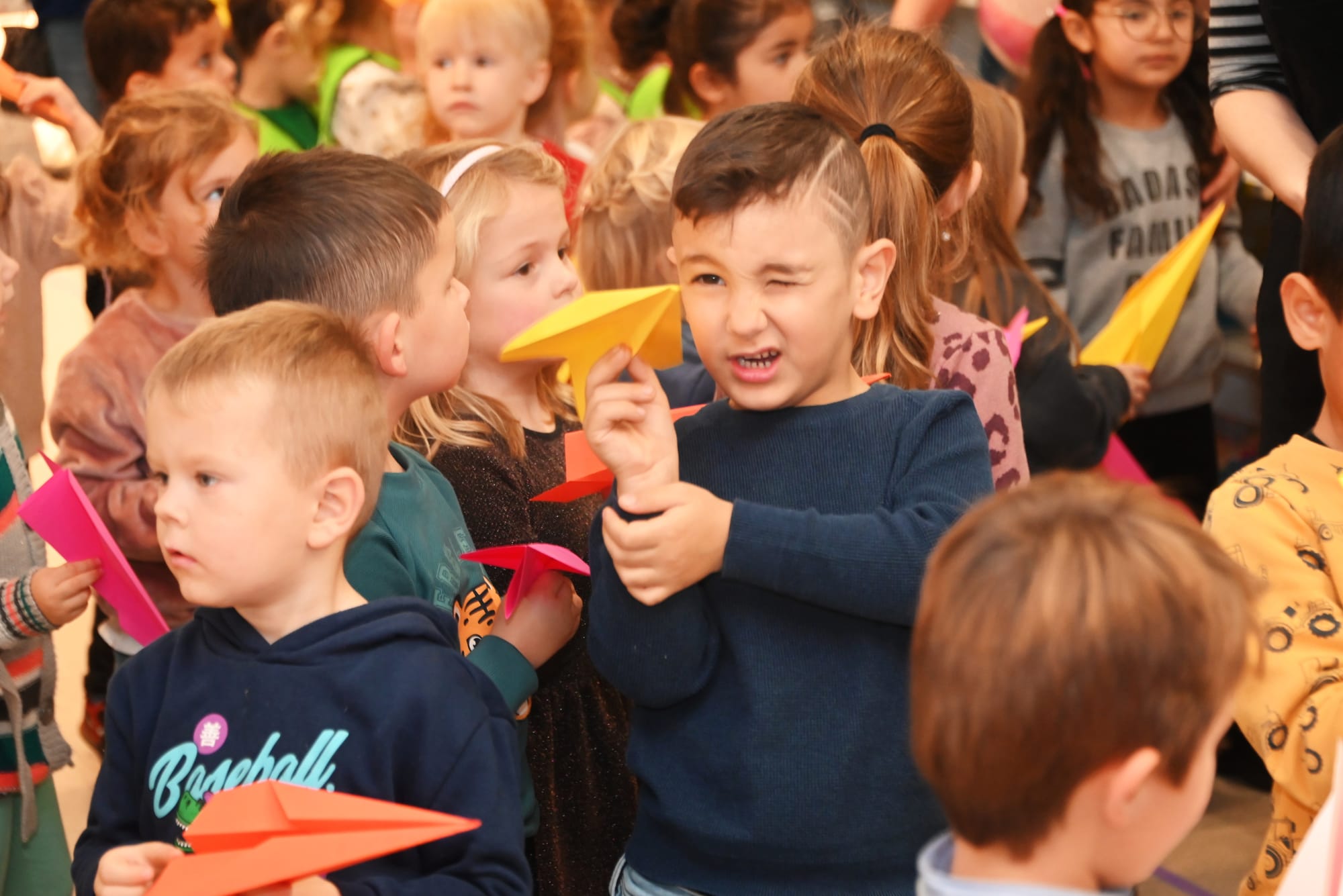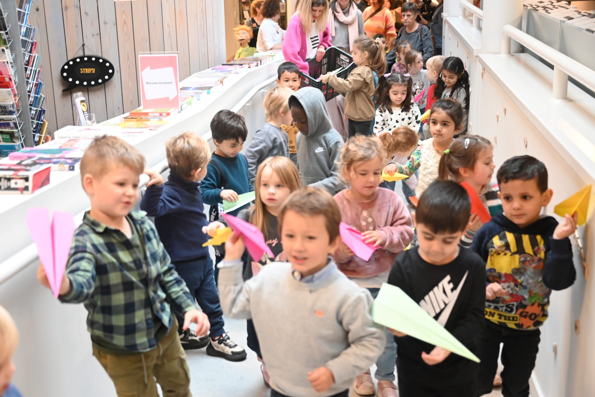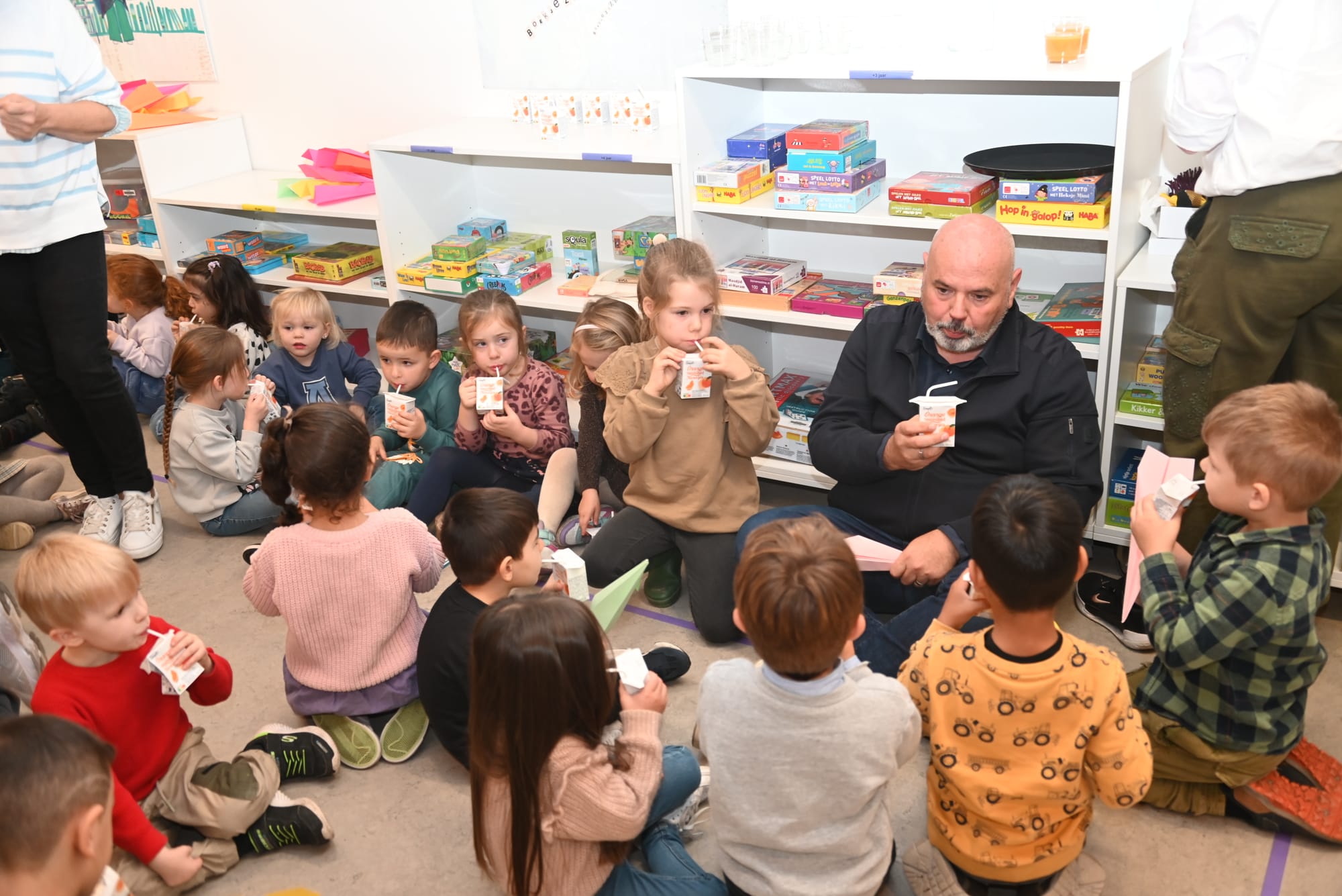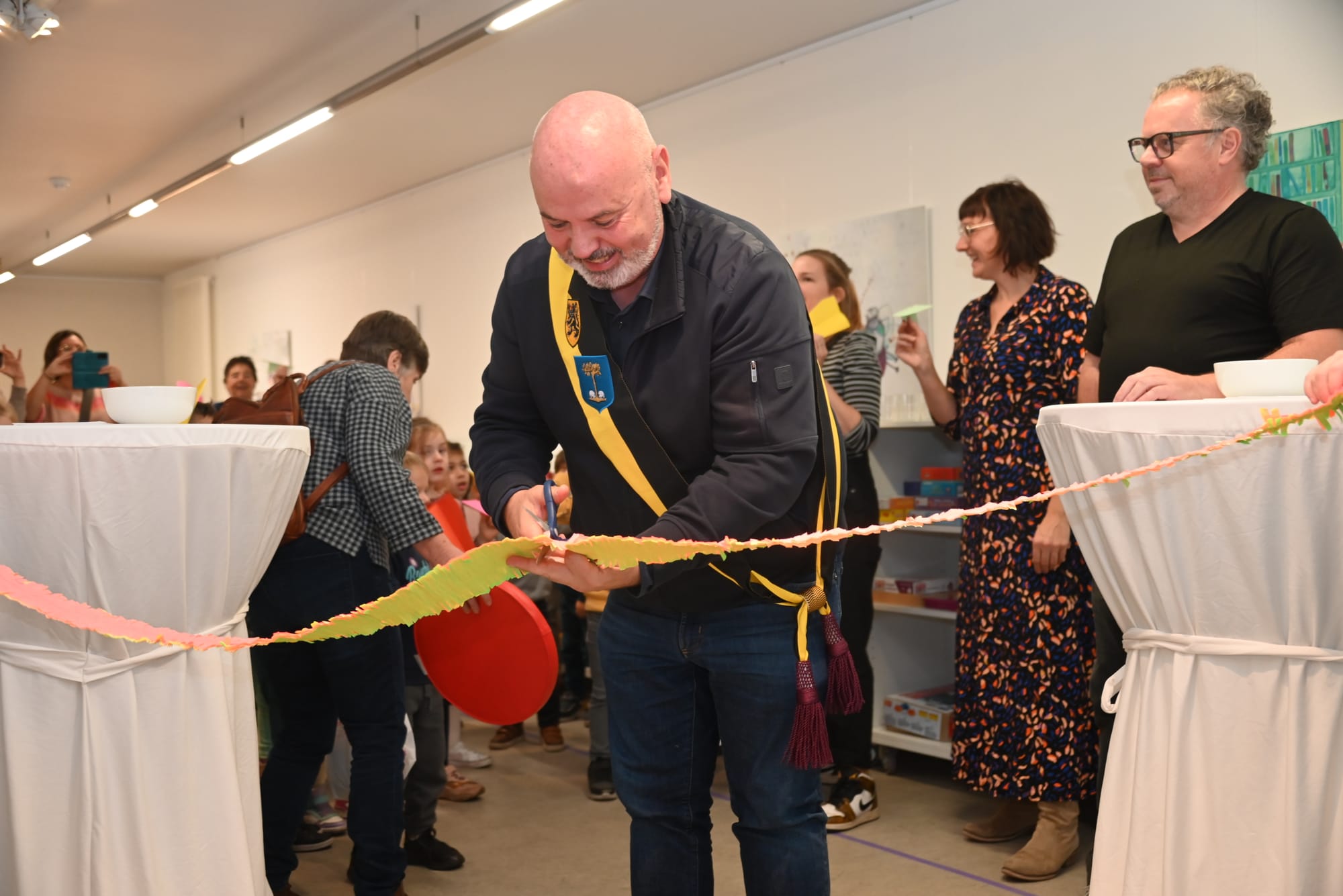 En vanochtend werd de tentoonstelling van de prenten van Tuur geopend, én werd het nieuwe verhaal van Tuur voorgelezen door de bedenker en tekenaar van het verhaal, en ook de geestelijke vader van de pop 'Tuur', Koen Swanenberg, was er uiteraard bij (foto bovenaan). De kleuters van De Speling kregen de eer om dit plechtige moment mee te maken... Schepen Peter Vanderkrieken nam de honeurs waar om het lint door te knippen, en de kleuters mochten allemaal een vlieger opgooien én kregen koekjes en fruitsap aangeboden...
