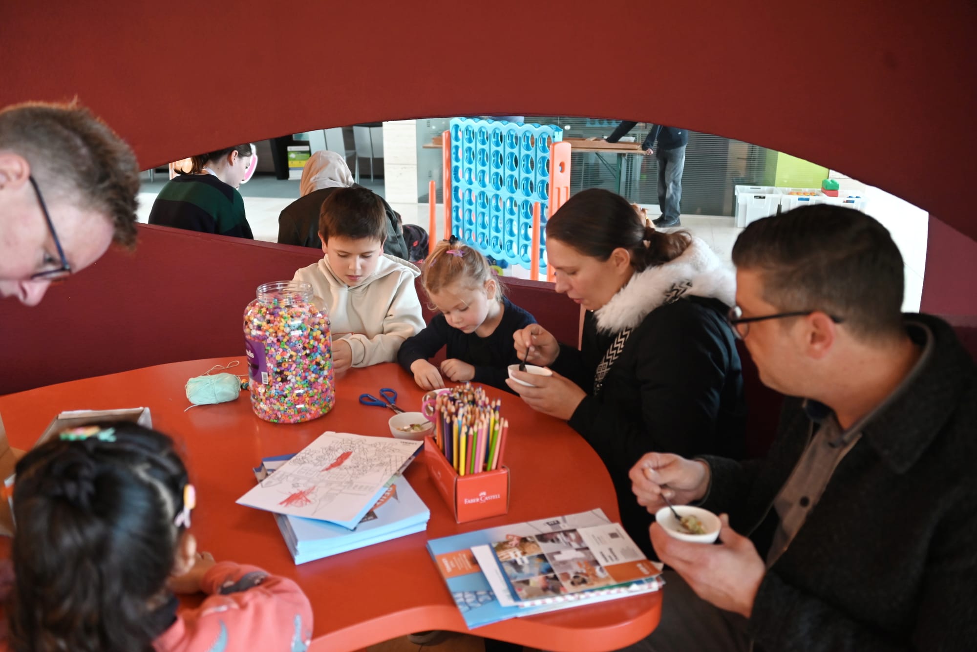 Kinderen leefden zich uit in de creatieve kinderhoek, waar ze hun eigen zandtekening konden maken, terwijl ouders genoten van een hapje en drankje in een ontspannen sfeer. De nadruk lag op ontmoeten, ontdekken en meebeleven: drie woorden die de namiddag perfect samenvatten.