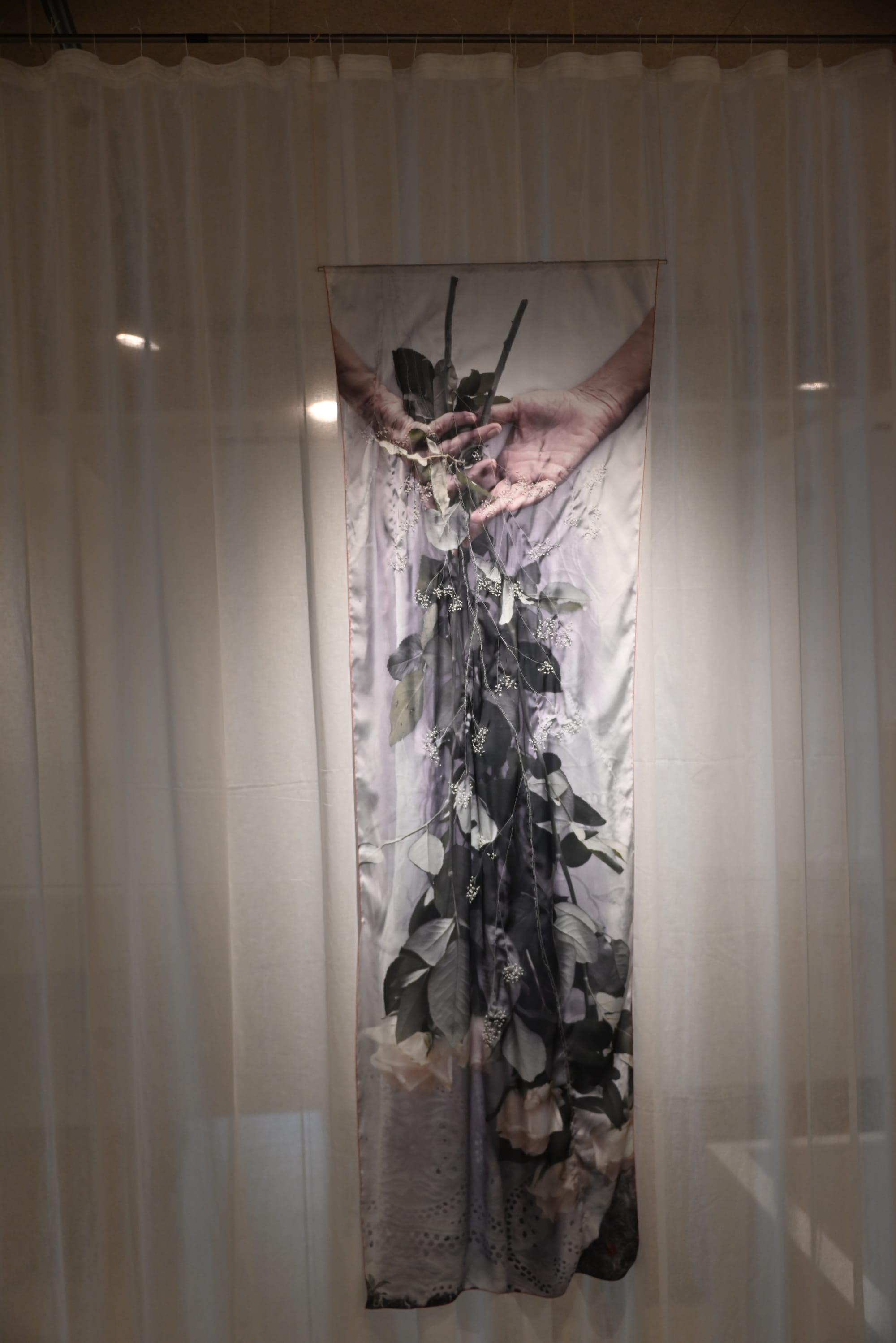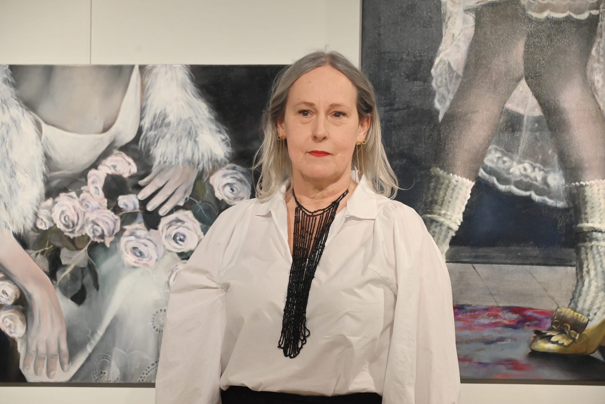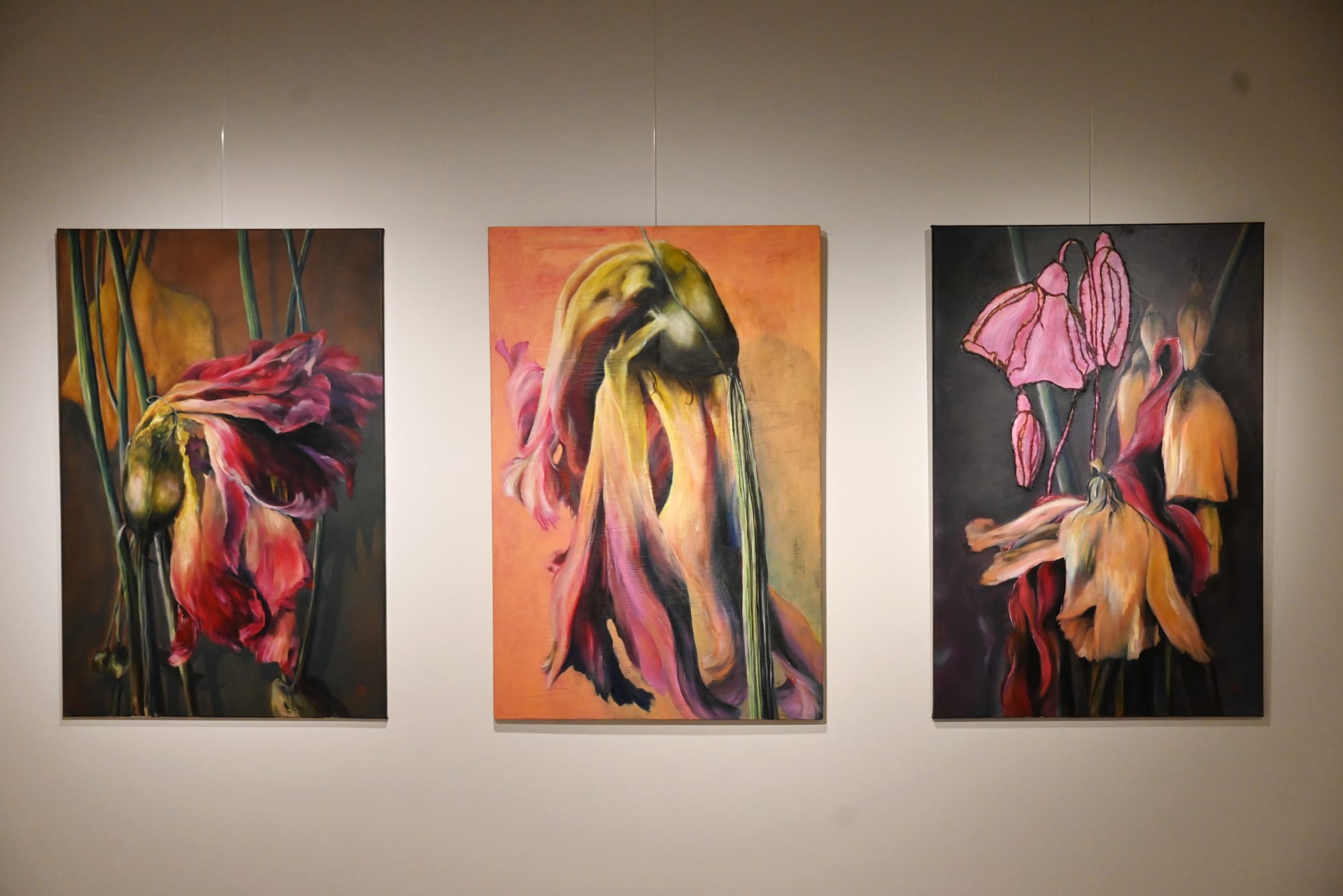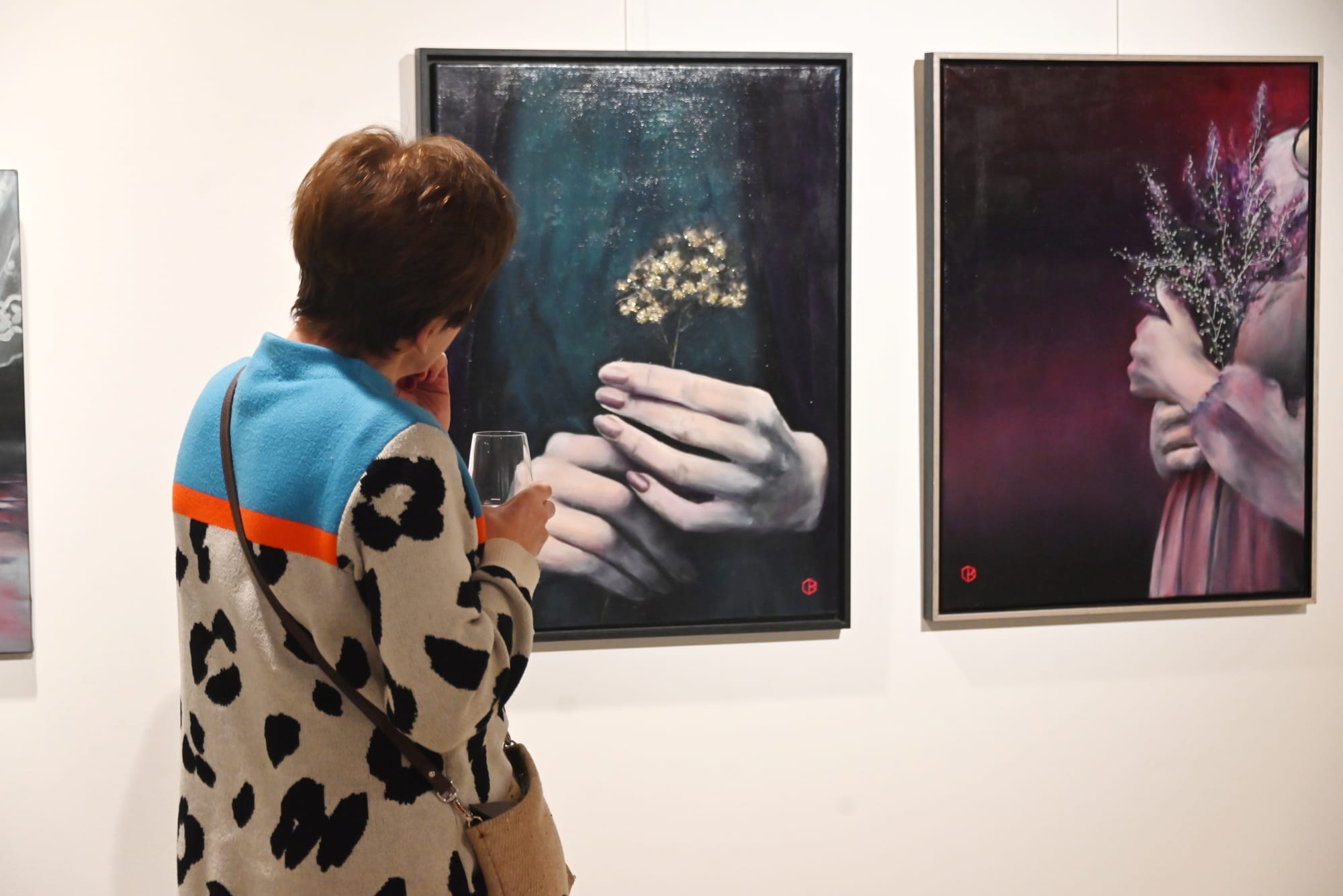 Vaak schildert ze bloemen, al dan niet verwelkt, en handen — symbolen van kwetsbaarheid én veerkracht. De delicate texturen van bloemen doen denken aan menselijke huid en versterken hun fragiele betekenis. Handen verschijnen als dragende, beschermende vormen: tastend tussen kracht en breekbaarheid.