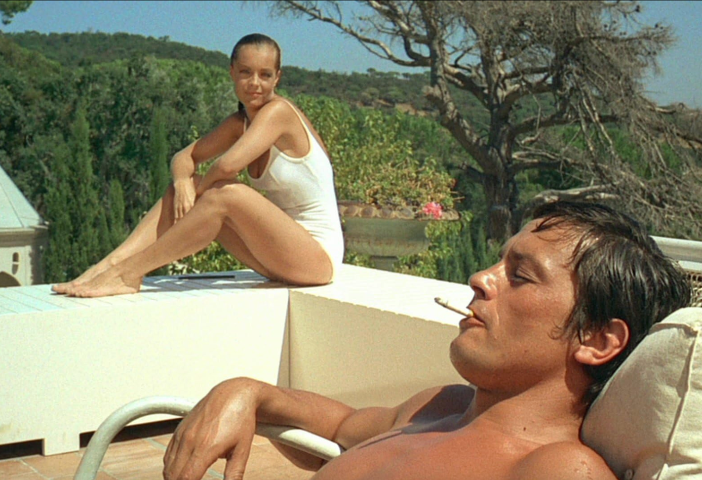 En daar ligt hij, als een God in Frankrijk. Hij speelt Jean-Paul, een schrijver met een schrijversblokkade - iets wat je echt niet wil meemaken. Hij hangt wat rond en langs het zwembad van de villa, wachtend op zijn geliefde die hem lijf op lijf komt beminnen. Romy Schneider, de ex van Delon, zien we in de rol van Marianne. Een vrouw die hem plaagt en weet wat ze wil en niet wil. Ondertussen voel je het water spetteren, je hoort het klotsen en ruikt het zweet en de zon van schijnbaar ideale mensen.