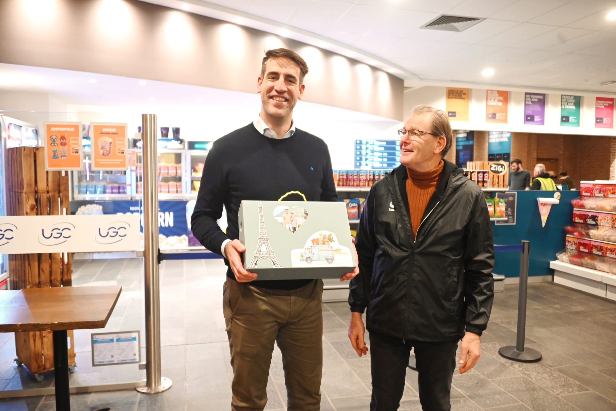 Maar zijn verhaal in Lommel stopt nu, aangezien hij verhuist naar Parijs. En dat mocht gevierd worden... Hij wordt opgevolgd door Bert Hermans (foto boven links naast Sigurd), die naast de UGC vestiging in Turnhout ook Lommel onder zijn hoede gaat nemen.