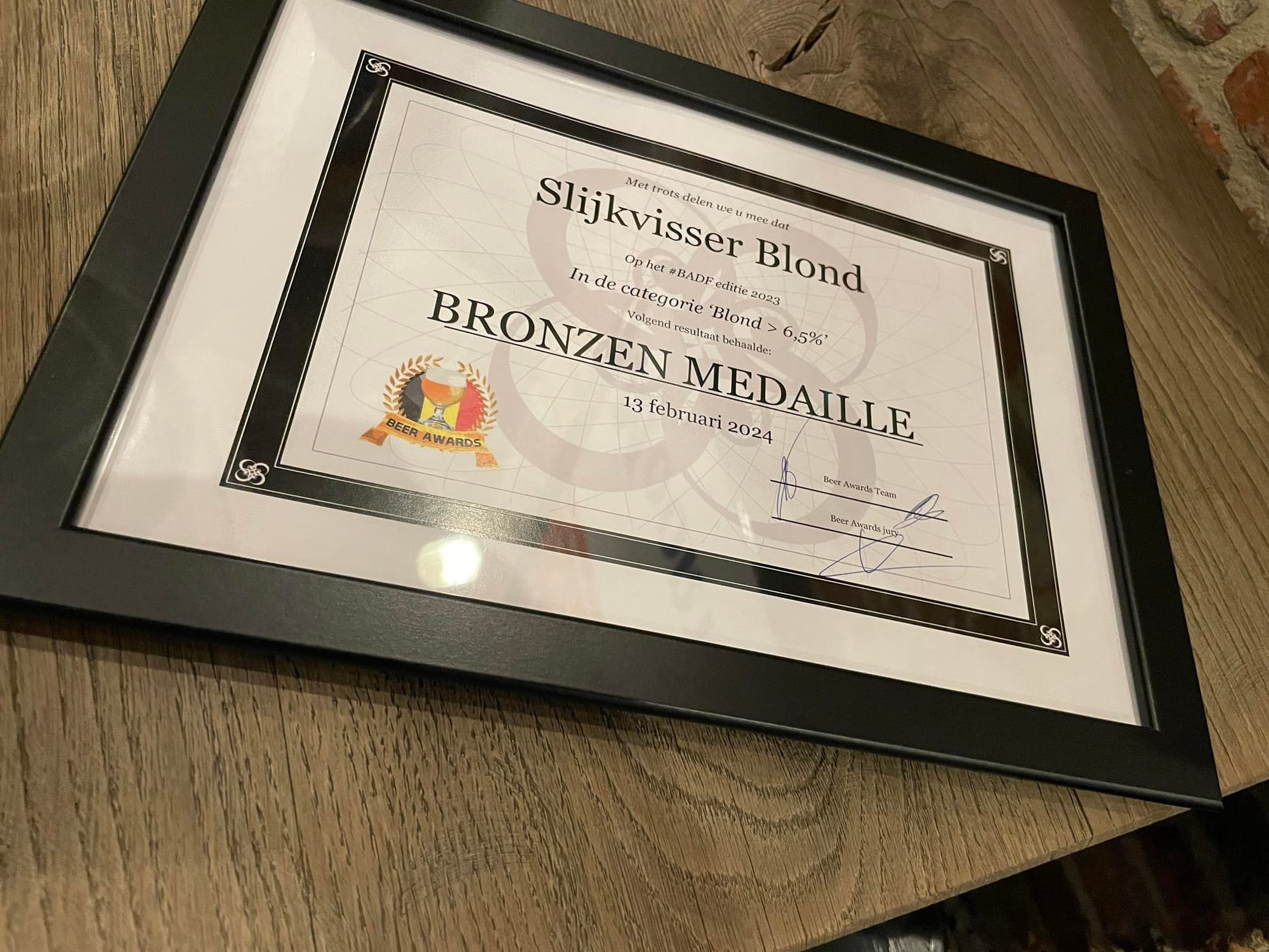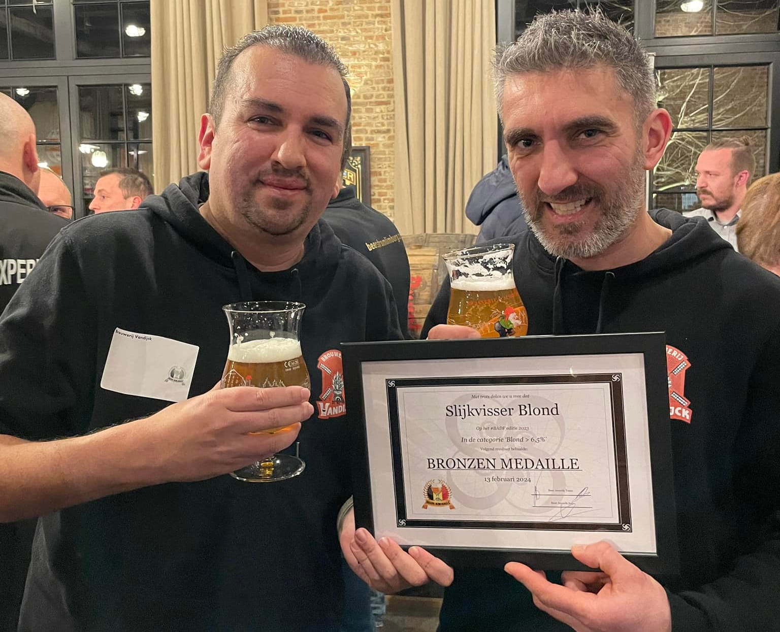 En 'Slijkvisser', het bier van onze Lommelse brouwerij Vandijck, met Timothy Vandijck aan het roer, won er in de categorie 'Blond >6,5% de bronzen medaille! Dit vlak achter Westmalle Tripel en Duvel! Proficiat...