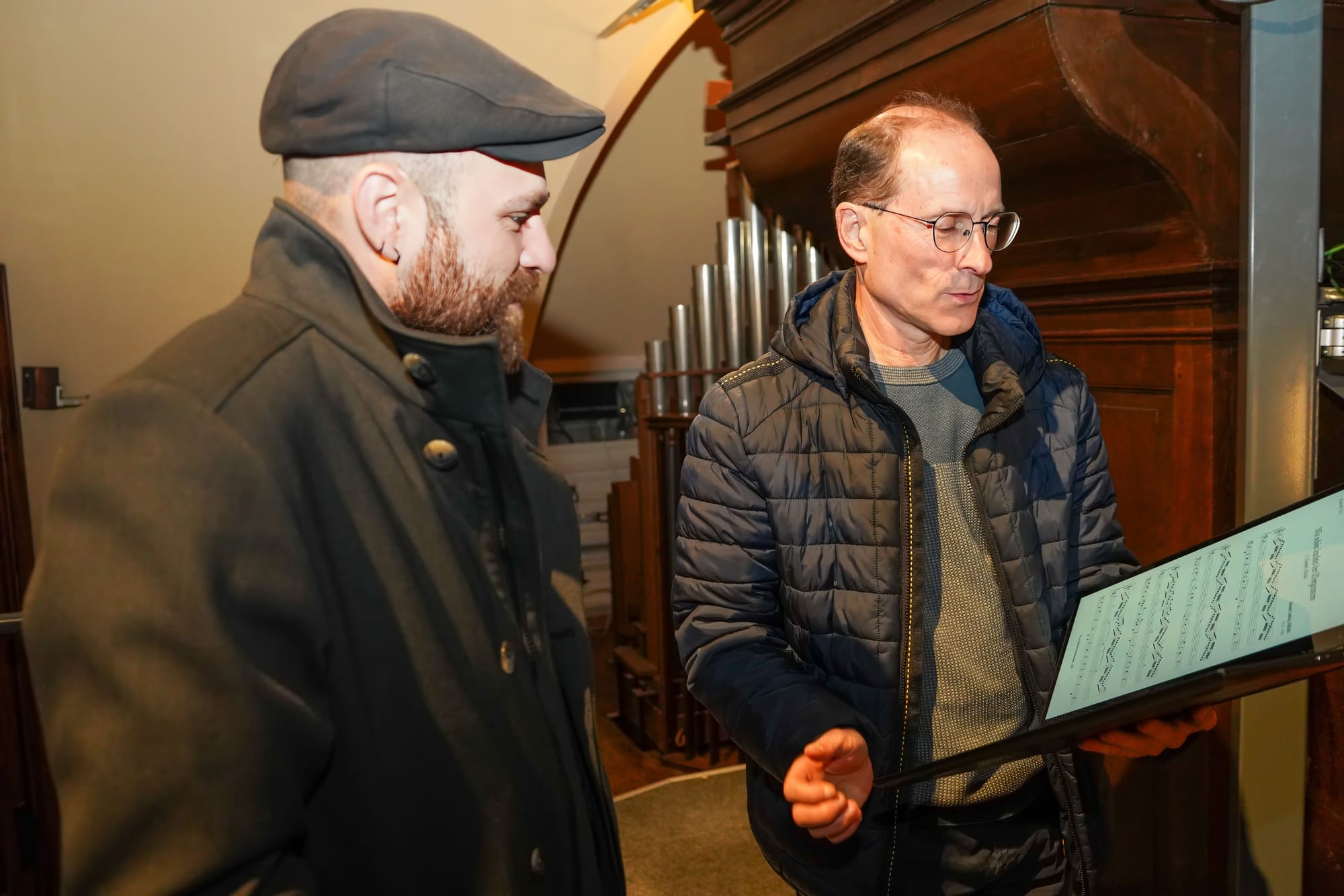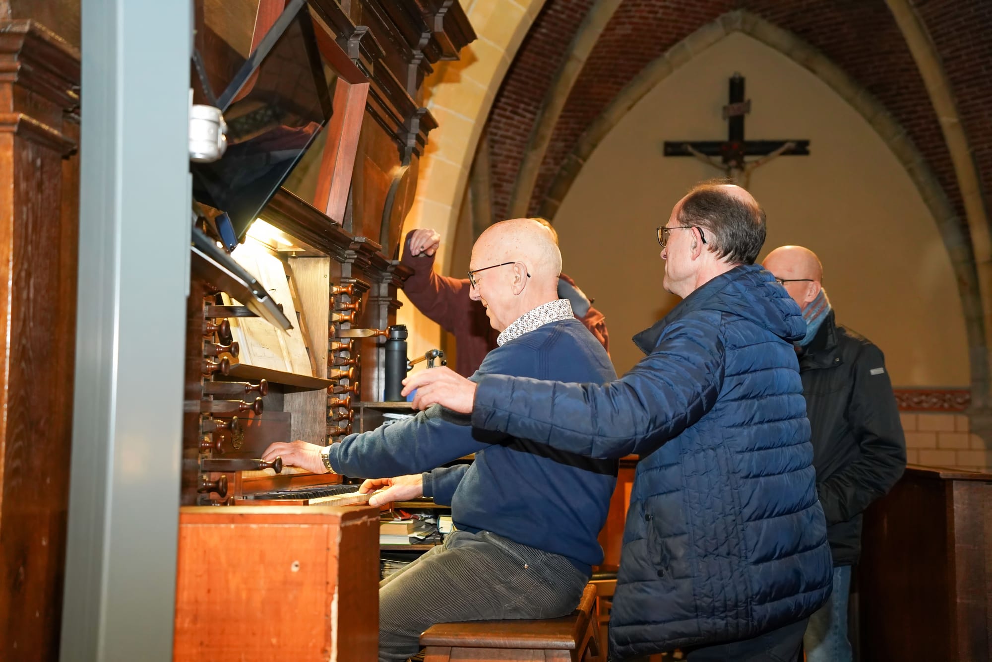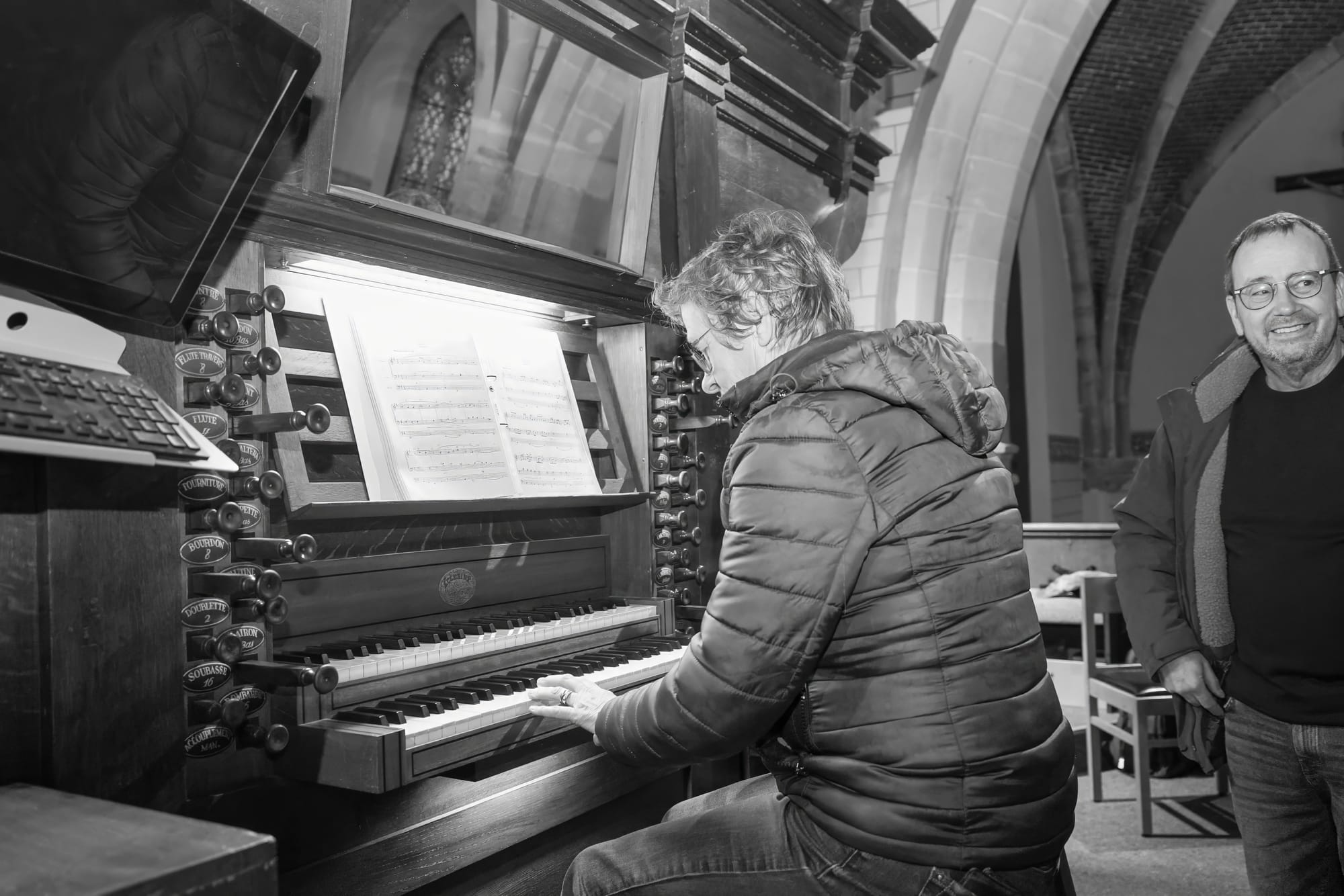 Er kwamen wel wat kinderen op af die liever niet op de foto gingen, maar er waren ook twee volwassenen van koor Lokomotief die zongen en gitaar speelden, en die we dus wél op foto en video hebben vastgelegd... En zélfs onze fotografe waagde zich (even) aan het orgel!