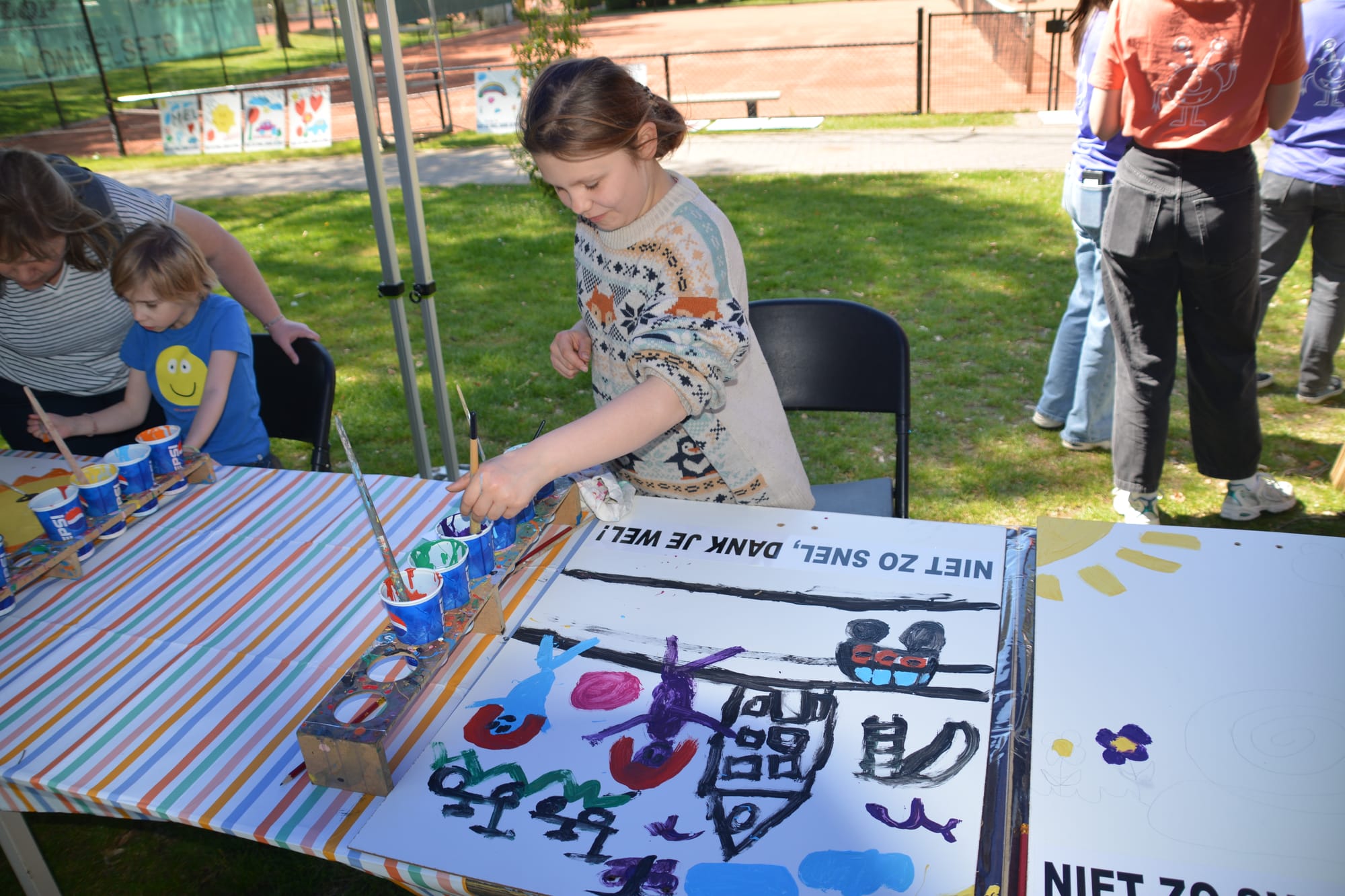 En ook het schilderen van een Graag Traag-bord was dit jaar gekoppeld aan deze dag. Voorgaande jaren gebeurde dit nog op de werf, nu dus hier. De kids konden, hun eigen Graag Traag-bord maken in de speeltuin. Zo weten alle bestuurders dat ze voorzichtig moeten rijden. Ze versierden hun bord, kiezen nadien een plek om het op te hangen en maken zo van hun straat een vrolijke en veilige plek!