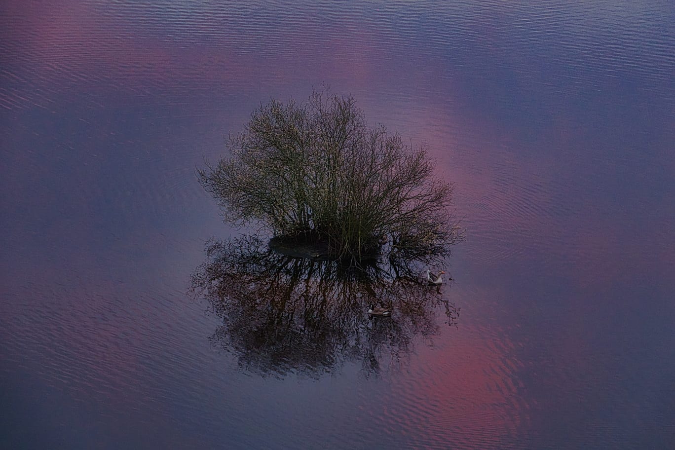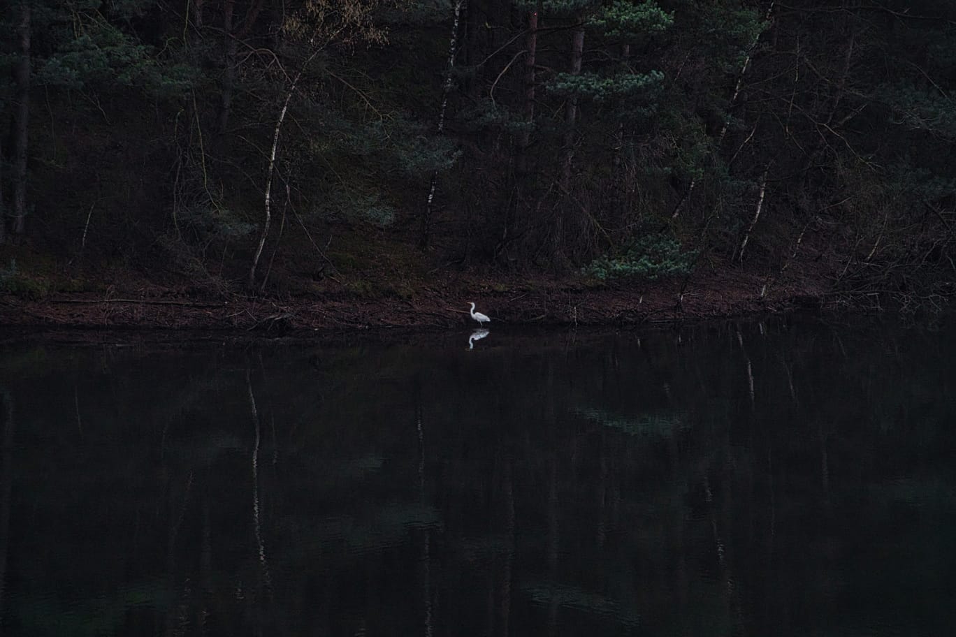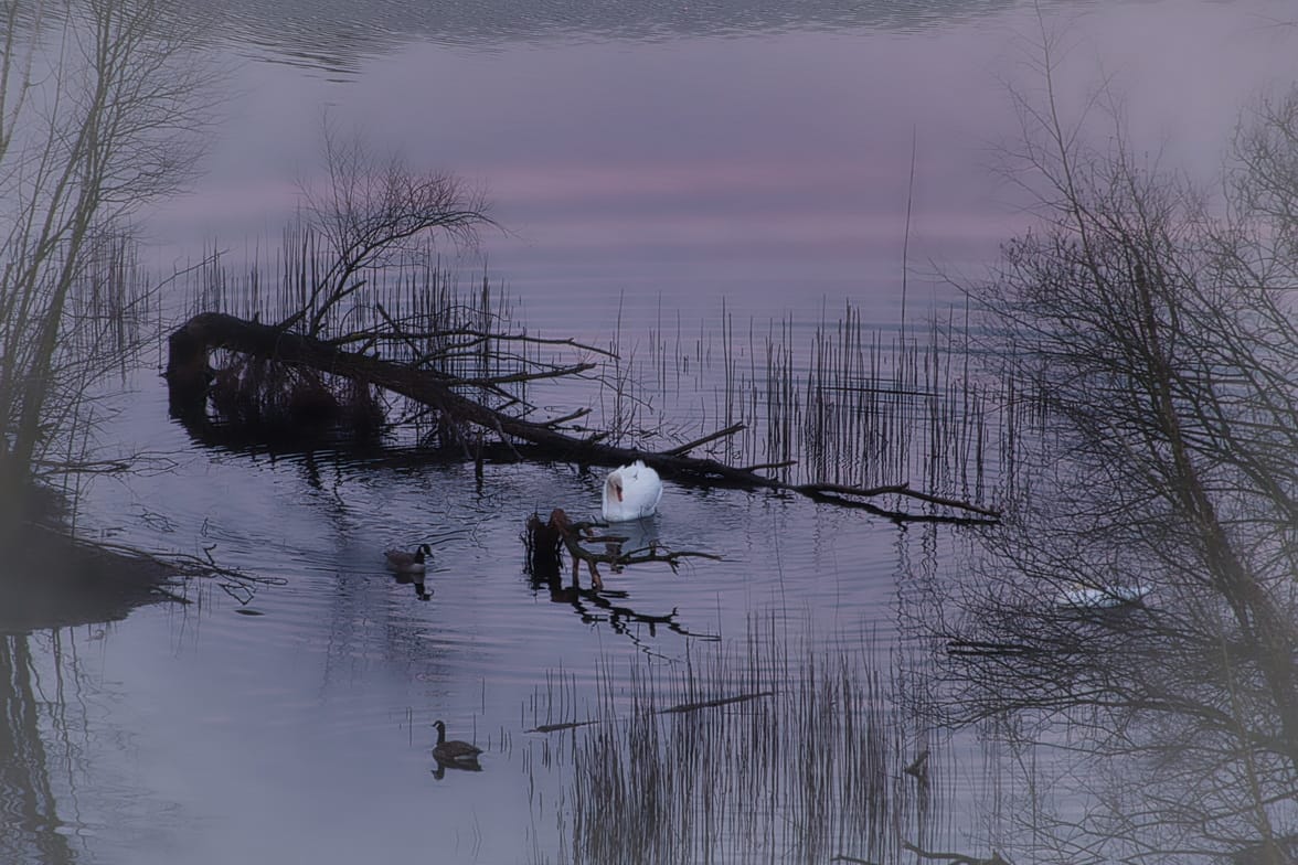 Beneden beweegt een eenzame zwaan geruisloos over het meer. Iets verder staat een witte reiger, onbeweeglijk, geconcentreerd. Zijn witte gestalte contrasteert scherp met het donkere water, alsof hij niet zwemt maar zweeft. Hij lijkt geen haast te kennen, alsof tijd hier anders wordt gemeten.