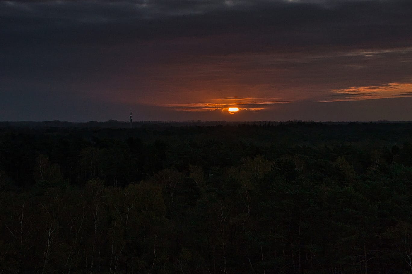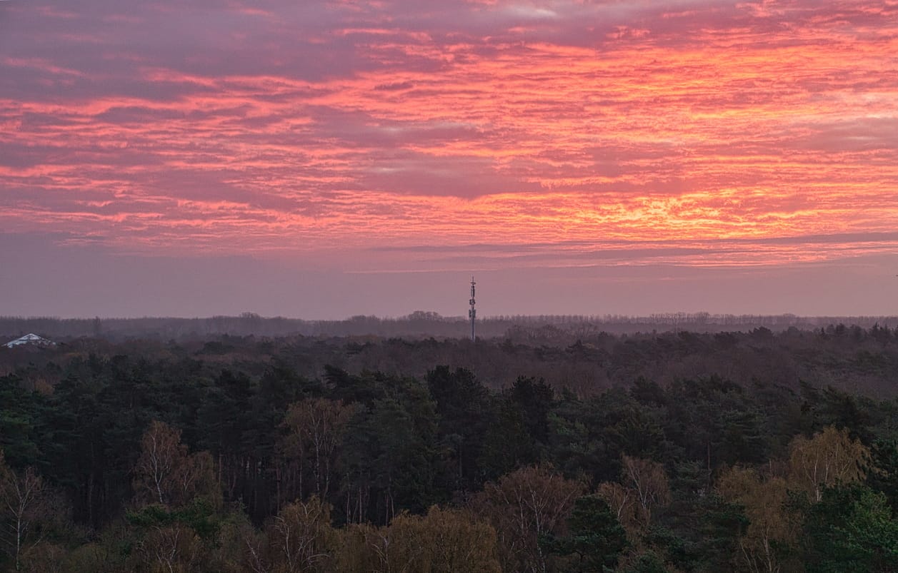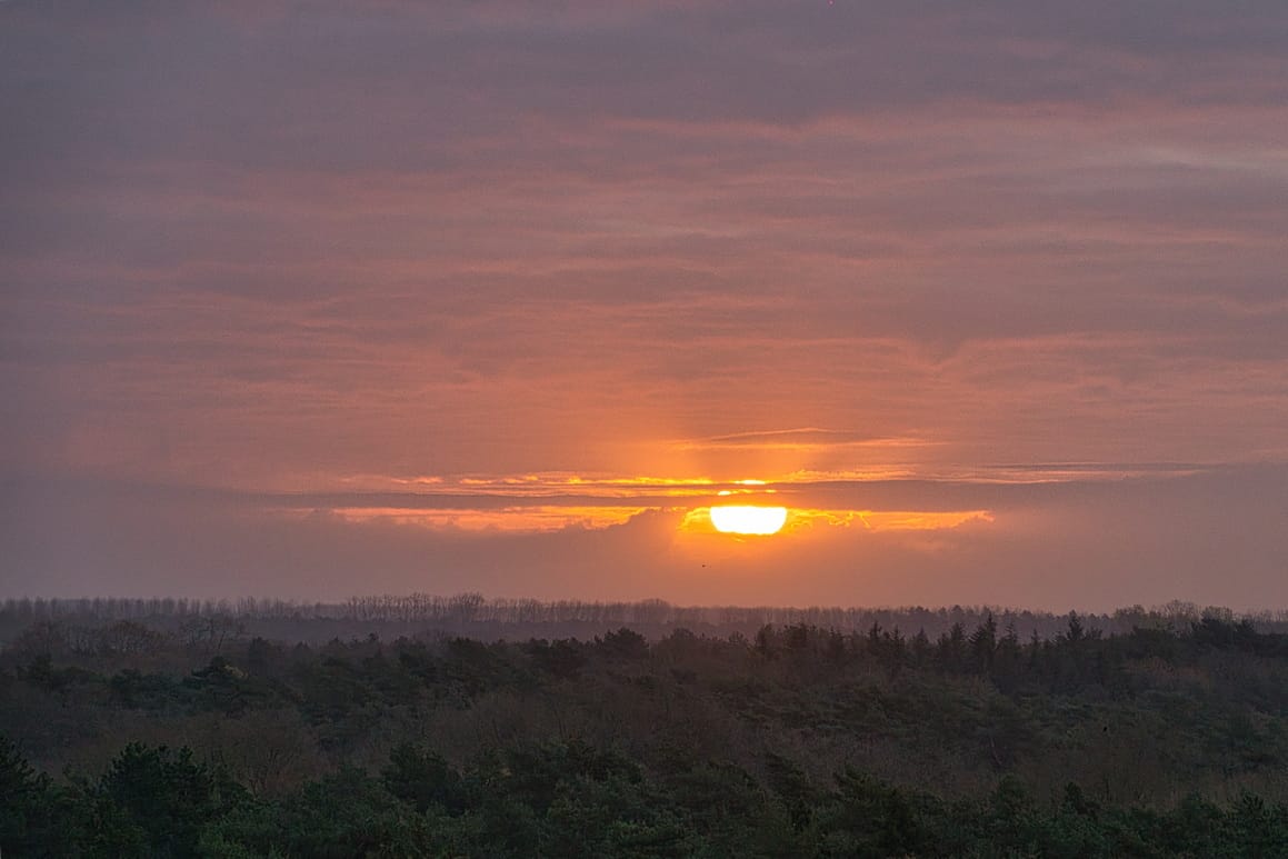 Langzaam verandert de lucht. Eerst een zacht oranje, bijna voorzichtig, daarna dieper, warmer rood. De overgang is kort, maar krachtig, alsof de zon slechts even haar aanwezigheid bevestigt voordat ze zich weer terugtrekt.