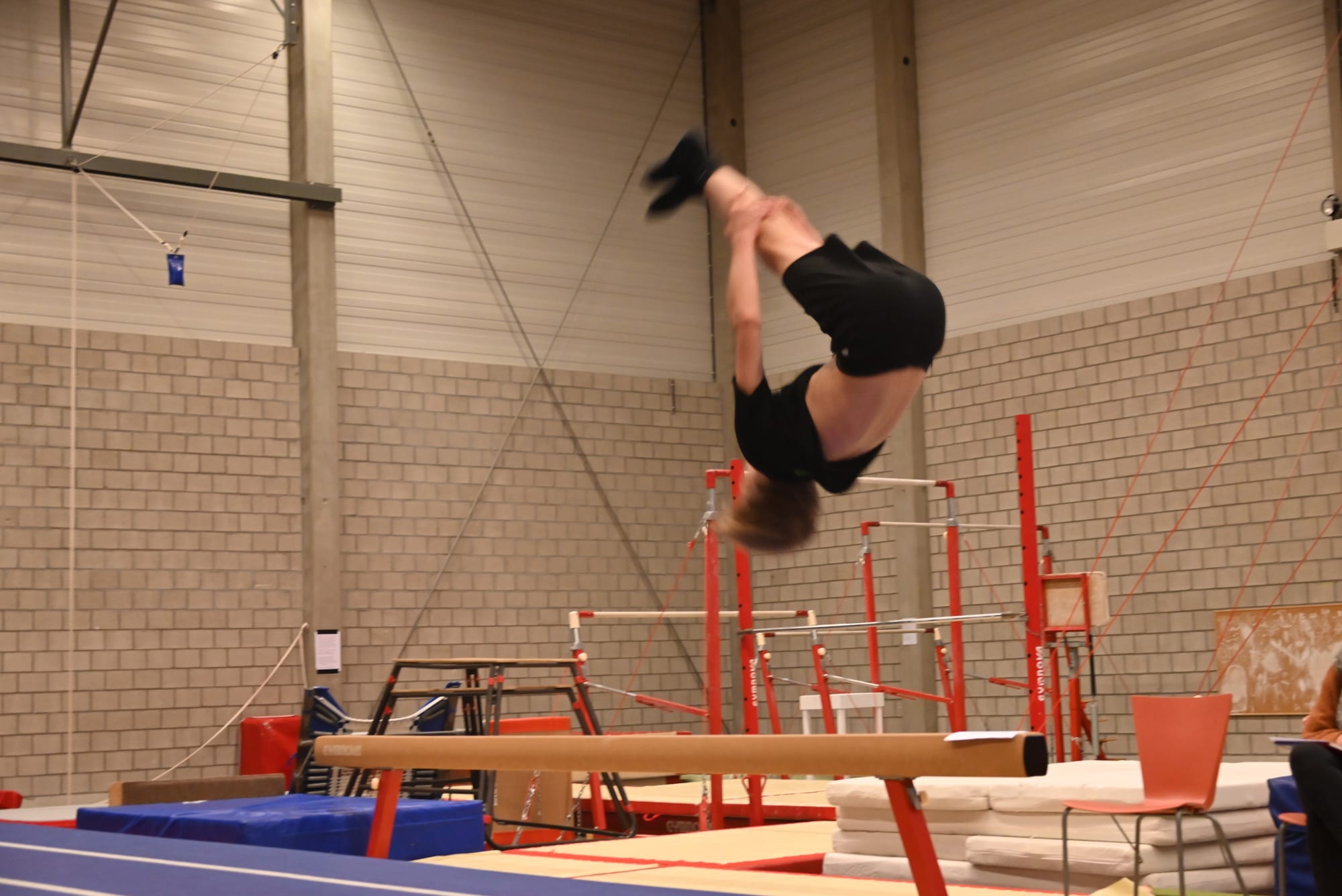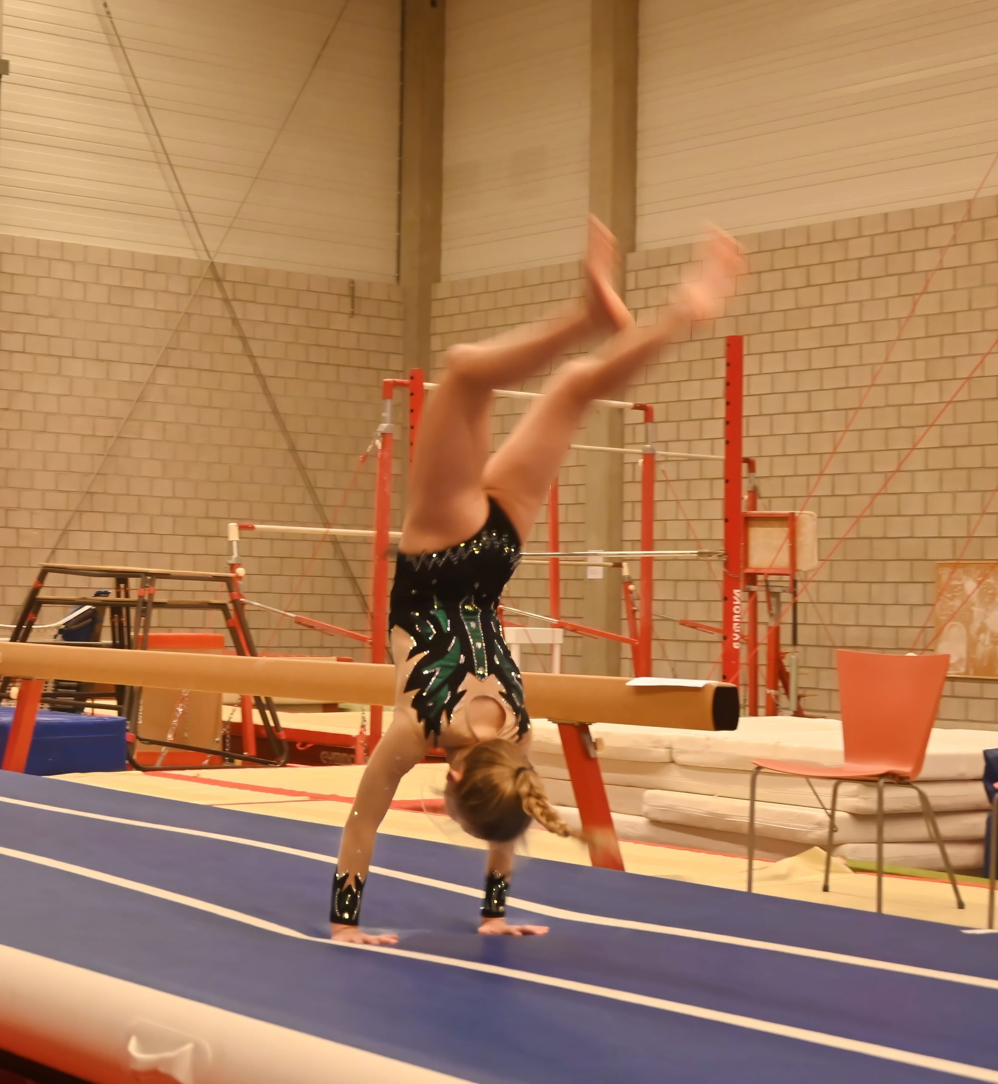 Onze Lommelse tunrclub heeft ook een afdeling die zich vooral met 'Tumbling' bezig houdt... U weet wel, die spectaculaire salto's.... En normaliter gingen ze vandaag naar Turnhout voor een wedstrijd, maar één en ander liep mis, en omdat de meisjes (én jongen...) zó hard geoefend hadden, besloten ze maar zélf een wedstrijd te organiseren in eigen clubverband.