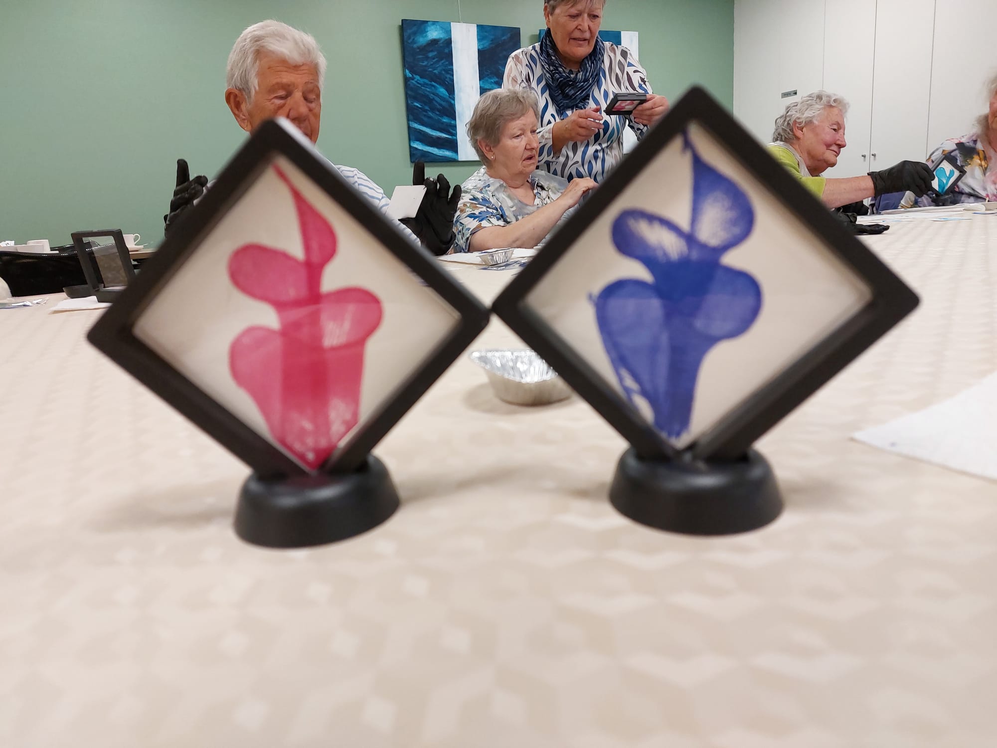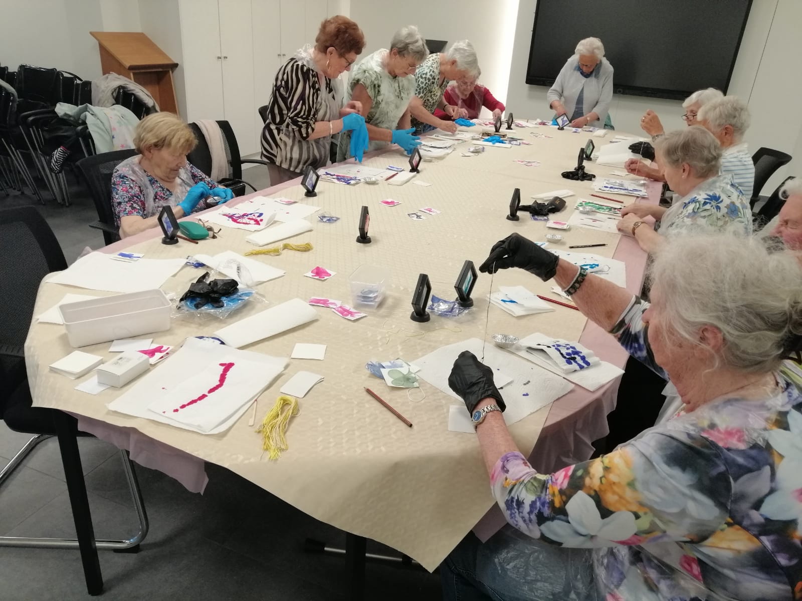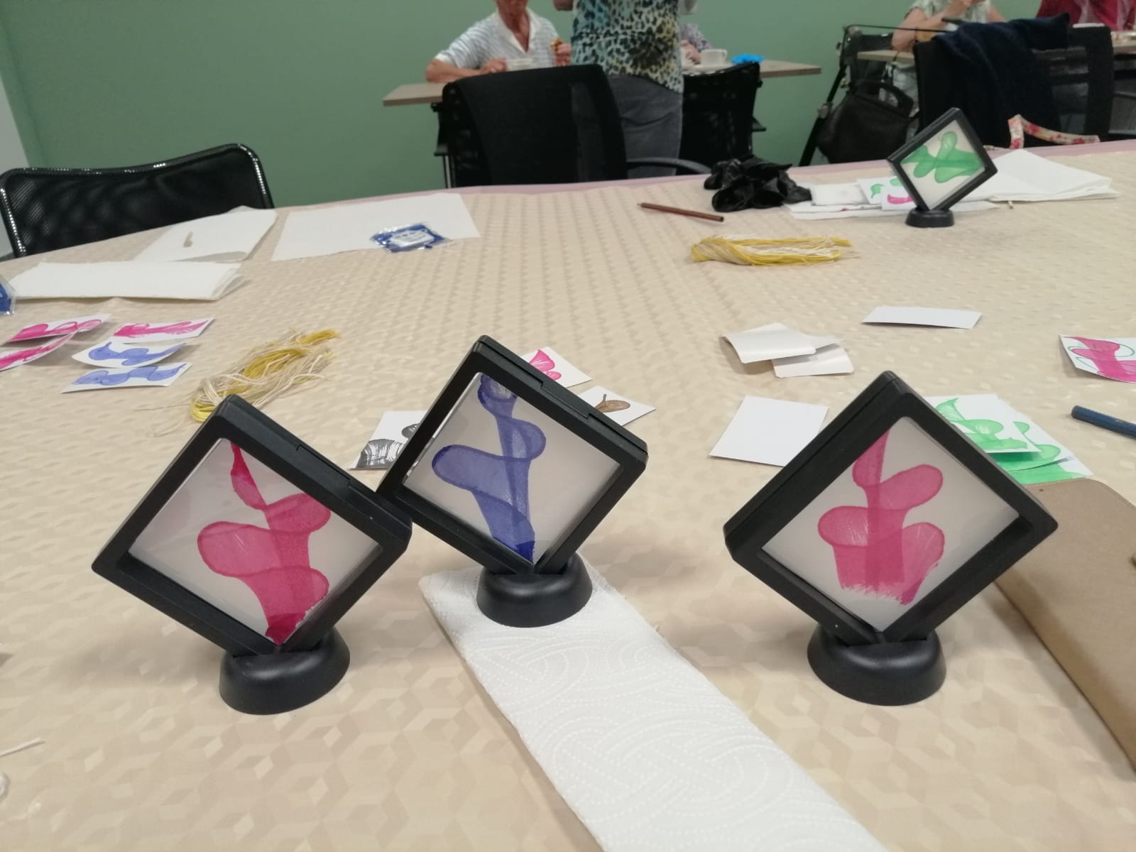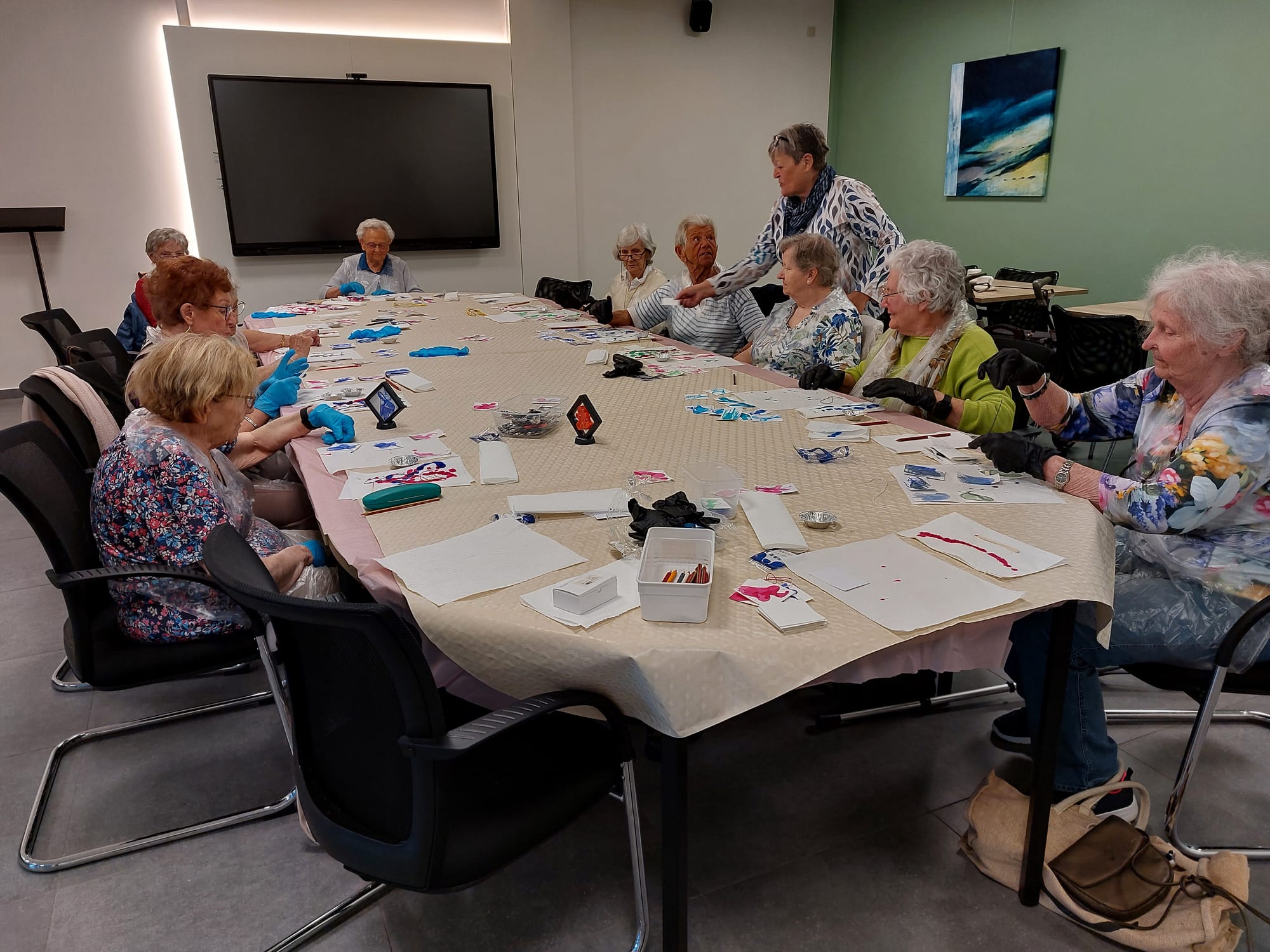 Vandaag, maandag 27 april, kwamen 12 creatievelingen van Samana Lommel-Centrum samen in het Franciscushuis. Met draadjes, wat verf en kartonnetjes werden unieke kunstwerkjes gemaakt. Het was telkens spannend afwachten wat er tevoorschijn kwam. Na wat oefenen werden er enkel kreetjes van verwondering gehoord. Meestal zag men een abstracte bloem, maar af en toe werd er ook een spook of mossel ontdekt. Echt magisch!