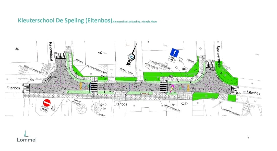 Hier komt een permanent parkeerverbod ter hoogte van de schoolpoort, en ook permanent éénrichtingsverkeer in de Eltenbos tussen de Sperwerstraat en de Reigerstraat. Verder komt er een verkeersplateau in de Eltenbos vanaf het kruispunt met de Sperwerstraat tot het kruispunt met de Reigerstraat, aan de kant van de school komt een breed voetpad, er komen enkele fietsbeugels en een zitbank aan de school. En tot slot worden de zebrapaden verlicht met een portiek boven de rijbaan en ook worden er tegels voor blinden en slechtzienden voorzien. En uiteraard worden ook hier Octopuspalen en markeringen geplaatst