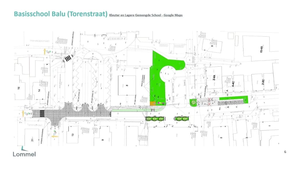 Hier komen zebrapaden in de Hanekapstraat en in de Torenstraat, een voetpad vanuit de Torenstraat naar de toegang van de school, ter hoogte van de parking De Hanekap wordt de Torenstraat vernieuwd en de bestaande dolomietverharding wordt vergroend. En ook hier weer de Octopuswegmarkeringen en Octopuspalen. En tot slot: ook het éénrichtingsverkeer in de Torenstraat tussen Lutlommel en de Meidoornstraat blijft behouden