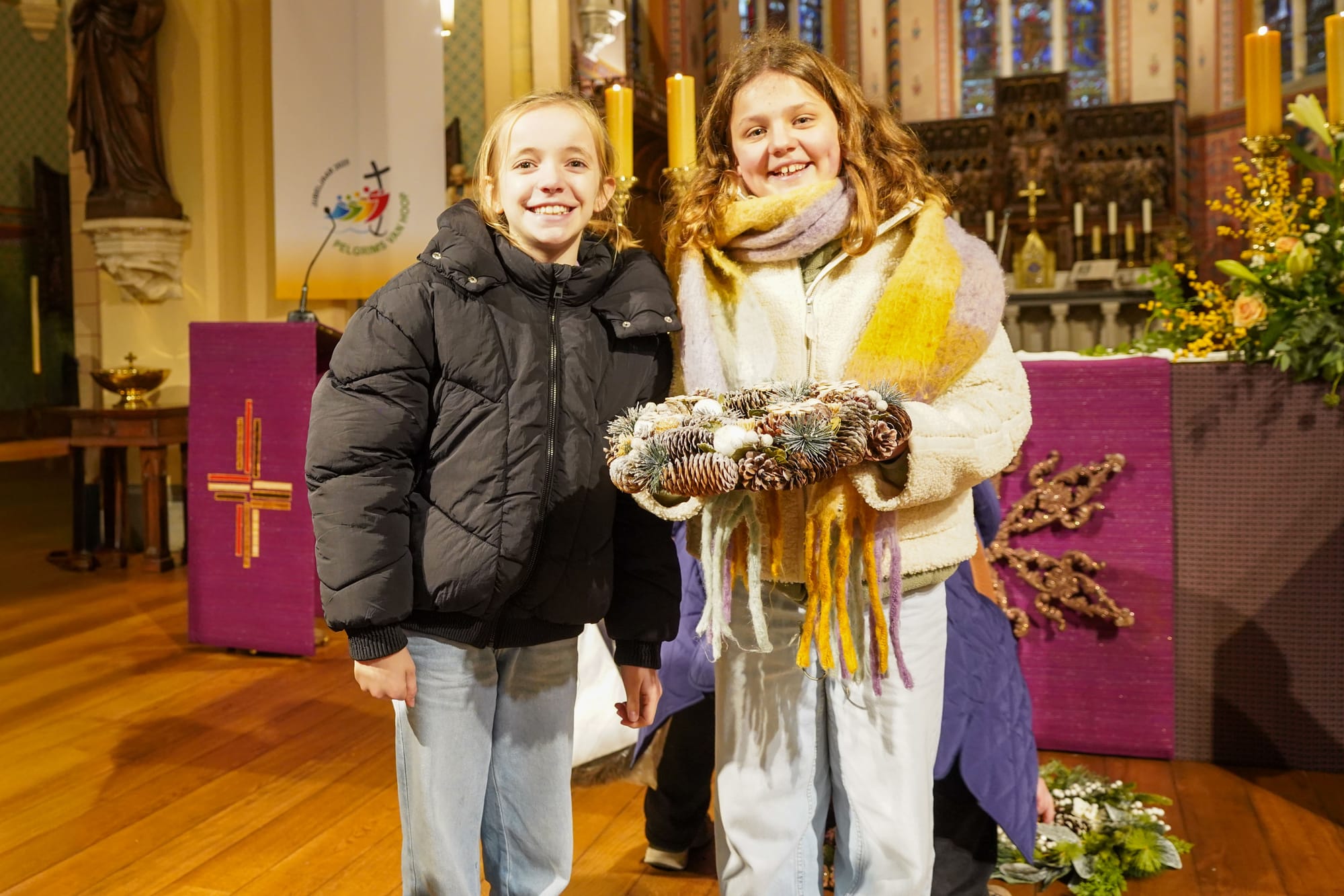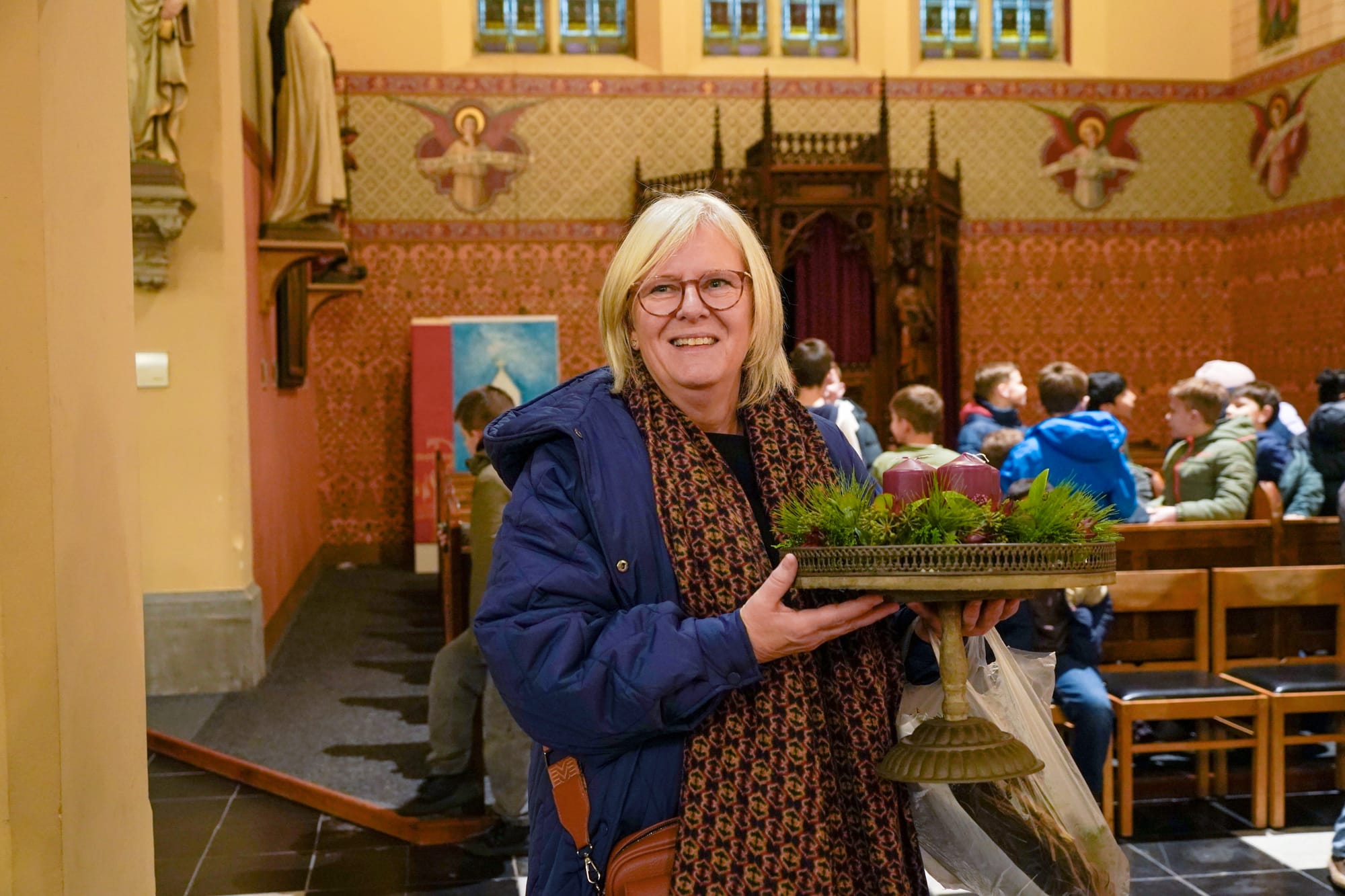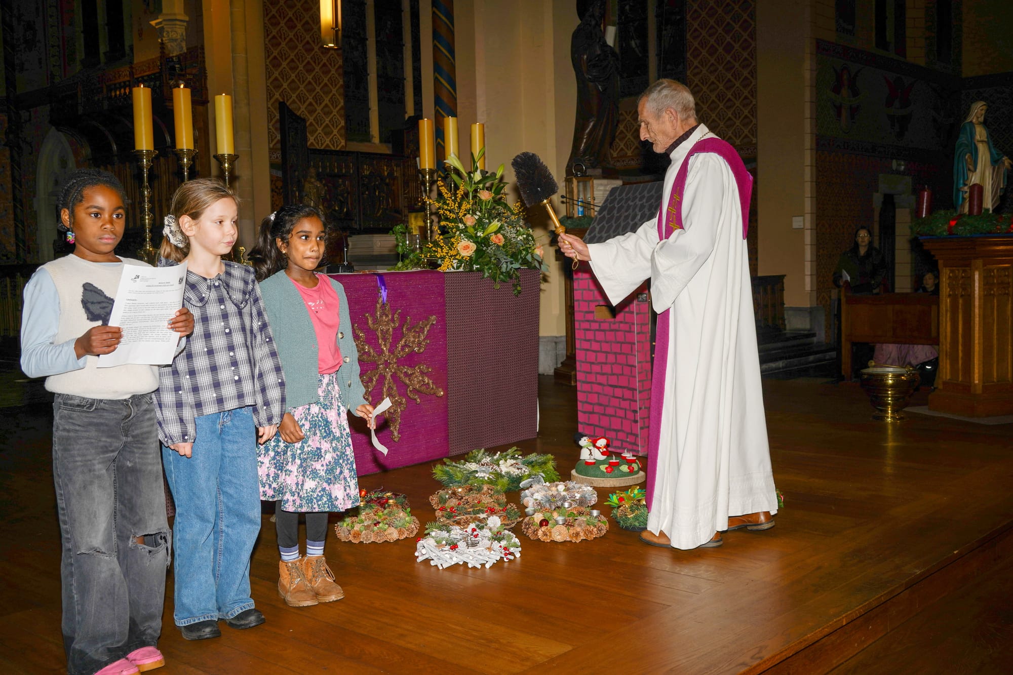 Samen met alle leerlingen en leerkrachten vierden ze in de kerk de inzegening van de adventskransen van alle klassen. De pastoor was aanwezig om dit moment van bezinning te leiden.