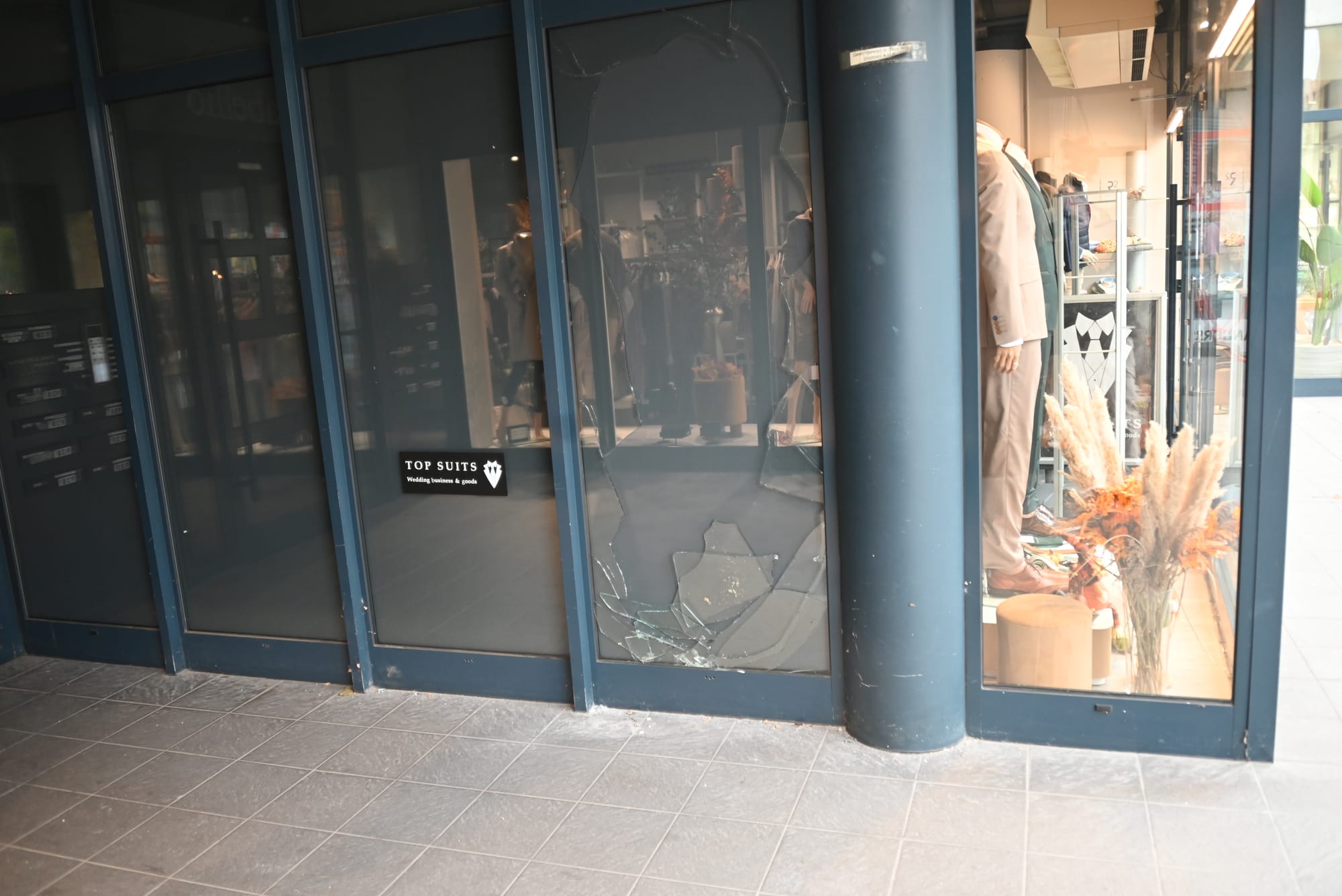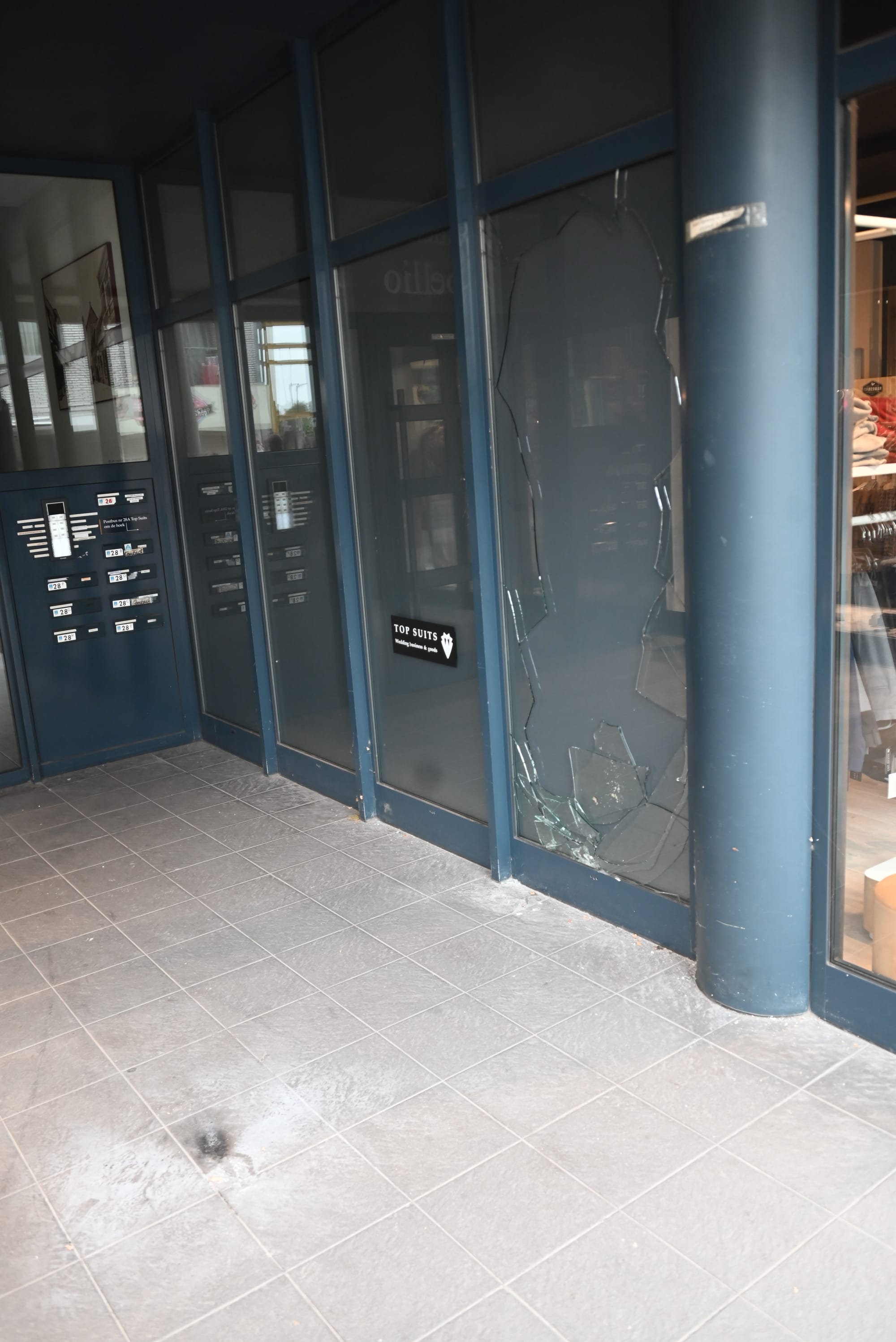 Vannacht was het 'weer van dat' in onze Kerkstraat. Omstreeks 03 uur vannacht hoorden de omwonenden een luide knal. En blijkbaar was die voorafgegaan aan een 'vuurtje stoken', waarbij vuilzakken op een hoop waren gegooid, met bezine overgoten en in brand gestoken in de portiek van residentie 'Tabellio'. En even later dus ook nog die luide knal van één of ander explosief, waarbij een etalage van de kledingzaak 'Top Suits' sneuvelde.
