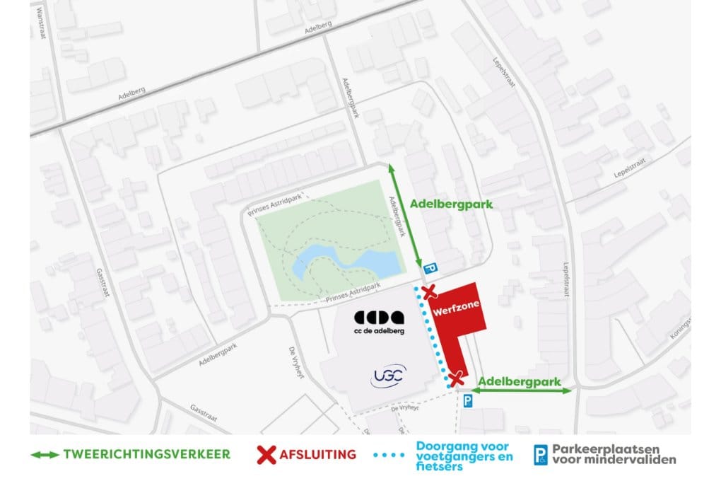 - Vanaf dat moment is er geen doorgaand autoverkeer meer mogelijk tussen de ingangen van UGC Cinema’s en CC De Adelberg. Beide ingangen blijven wel toegankelijk. Te voet of met de fiets aan de hand kan je er nog steeds door.