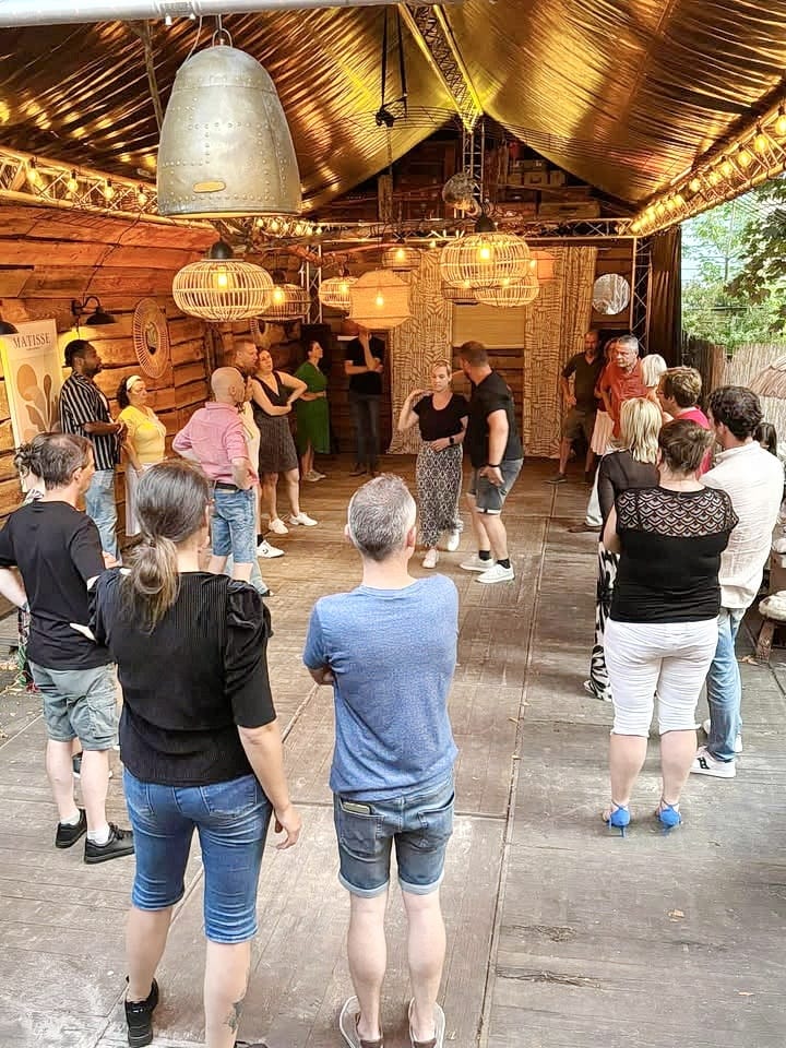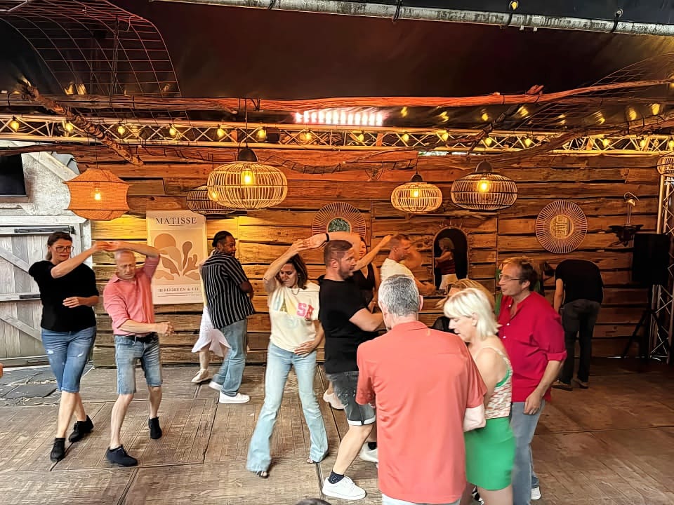 Gisteren - 14 juli - ging de eerste les van de zomercursus salsa, van Salsación, van start in de prachtige locatie van Vill'Artistiek. Op het gezellige terras stroomden de enthousiaste dansers binnen. Bij de beginners werden de stapjes en combinaties op een rustige en duidelijke manier uitgelegd door Janna en Wim, en na een uurtje werd er al vlot gedanst door de talrijk opgekomen deelnemers.